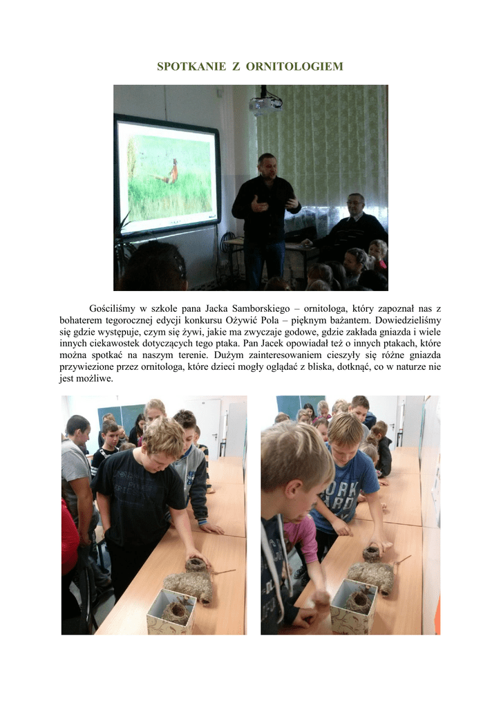 SPOTKANIE Z ORNITOLOGIEM Gościliśmy w szkole pana Jacka Samborskiego – ornitologa, który zapoznał nas z bohaterem tegorocznej edycji konkursu Ożywić Pola – pięknym bażantem. Dowiedzieliśmy się gdzie występuje, czym się żywi, jakie ma zwyczaje godowe, gdzie zakłada gniazda i wiele innych ciekawostek dotyczących tego ptaka. Pan Jacek opowiadał też o innych ptakach, które można spotkać na naszym terenie. Dużym zainteresowaniem cieszyły się różne gniazda przywiezione przez ornitologa, które dzieci mogły oglądać z bliska, dotknąć, co w naturze nie jest możliwe. Mieliśmy też okazję sprawdzić swoją wiedzę na temat ptaków w krótkim quizie, przygotowanym przez pana Jacka. Na koniec, wraz z panem Zbigniewem Pawlusem – naszym wieloletnim przyjacielem i koordynatorem konkursu Ożywić Pola z ramienia KŁ „Daniel” – wypuściliśmy parę bażantów w pobliżu naszej szkoły. Mamy nadzieję, że będzie im wśród nas dobrze i kiedyś nas odwiedzą.