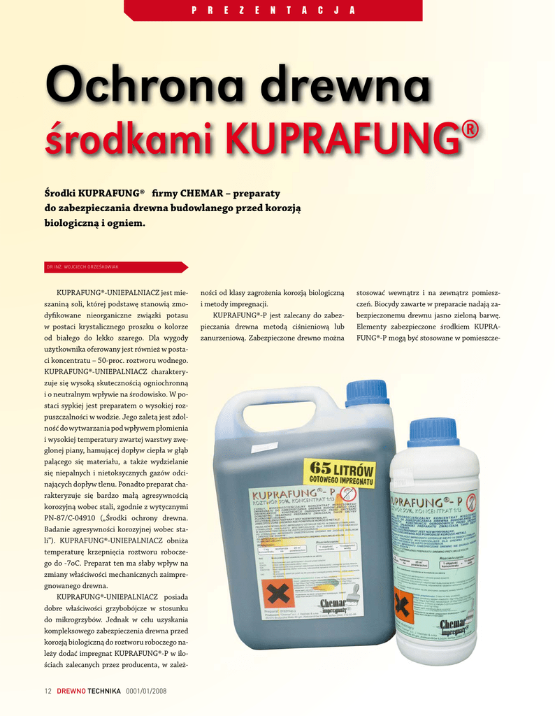P R E Z E N T A C J A Ochrona drewna ® środkami KUPRAFUNG Środki KUPRAFUNG® firmy CHEMAR – preparaty do zabezpieczania drewna budowlanego przed korozją biologiczną i ogniem. DR INŻ. WOJCIECH GRZEŚKOWIAK KUPRAFUNG®-UNIEPALNIACZ jest mieszaniną soli, której podstawę stanowią zmodyfikowane nieorganiczne związki potasu w postaci krystalicznego proszku o kolorze od białego do lekko szarego. Dla wygody użytkownika oferowany jest również w postaci koncentratu – 50-proc. roztworu wodnego. KUPRAFUNG®-UNIEPALNIACZ charakteryzuje się wysoką skutecznością ogniochronną i o neutralnym wpływie na środowisko. W postaci sypkiej jest preparatem o wysokiej rozpuszczalności w wodzie. Jego zaletą jest zdolność do wytwarzania pod wpływem płomienia i wysokiej temperatury zwartej warstwy zwęglonej piany, hamującej dopływ ciepła w głąb palącego się materiału, a także wydzielanie się niepalnych i nietoksycznych gazów odcinających dopływ tlenu. Ponadto preparat charakteryzuje się bardzo małą agresywnością korozyjną wobec stali, zgodnie z wytycznymi PN-87/C-04910 („Środki ochrony drewna. Badanie agresywności korozyjnej wobec stali”). KUPRAFUNG®-UNIEPALNIACZ obniża temperaturę krzepnięcia roztworu roboczego do -7oC. Preparat ten ma słaby wpływ na zmiany właściwości mechanicznych zaimpregnowanego drewna. KUPRAFUNG®-UNIEPALNIACZ posiada dobre właściwości grzybobójcze w stosunku do mikrogrzybów. Jednak w celu uzyskania kompleksowego zabezpieczenia drewna przed korozją biologiczną do roztworu roboczego należy dodać impregnat KUPRAFUNG®-P w ilościach zalecanych przez producenta, w zależ12 DREWNO TECHNIKA 0001/01/2008 ności od klasy zagrożenia korozją biologiczną i metody impregnacji. KUPRAFUNG®-P jest zalecany do zabezpieczania drewna metodą ciśnieniową lub zanurzeniową. Zabezpieczone drewno można stosować wewnątrz i na zewnątrz pomieszczeń. Biocydy zawarte w preparacie nadają zabezpieczonemu drewnu jasno zieloną barwę. Elementy zabezpieczone środkiem KUPRAFUNG®-P mogą być stosowane w pomieszcze- P R E Z E N T A C J A niach przeznaczonych dla ludzi i zwierząt oraz w magazynach pasz i żywności, pod warunkiem uniemożliwienia bezpośredniego kontaktu użytkowników i produktów z zaimpregnowanym drewnem. KUPRAFUNG®-P jest koncentratem bazującym na związkach miedzi. Po utrwaleniu się jest niewymywalny i bardzo skutecznie zabezpiecza drewno budowlane przed działaniem grzybów domowych. Metody nasycania Aby uzyskać właściwe zabezpieczenie surowca preparatem KUPRAFUNG®UNIEPALNIACZ i zalecaną wartość wchłonięcia preparatu w drewno, należy stosować jedną z metod nasycania: metodę ciśnieniową, czyli zużycie około 1,9 l roztworu roboczego na 1 m2 powierzchni drewna; metodę zanurzeniową, czyli zużycie około 1,1 l roztworu roboczego na 1 m2 powierzchni drewna. Trzecią z metod nasycenia jest malowanie, natrysk, przy zużyciu około 0,8 l roztworu roboczego na 1 m2 powierzchni drewna. W zależności od stosowanej metody nasycania oraz postaci preparatu (Koncentrat 100 proc. czy Koncentrat 50 proc.) stosowane są różne stężenia roztworów roboczych. I tak przy zastosowaniu metody ciśnieniowej stężenie roztworu roboczego powinno wynosić 10 proc., co odpowiada rozpuszczeniu w 9 l wody 1 kg Koncentratu 100 proc. lub 1 litra Koncentratu 50 proc. w 5 l wody. Dla metody zanurzeniowej zalecane jest stężenie ok. 15 proc., co odpowiada rozpuszczeniu w 6 l wody 1 kg Koncentratu 100 proc. lub 1 litra Koncentratu 50 proc. w 3 l wody, natomiast przy zastosowaniu metody malowania lub natrysku zalecane jest stężenie roztworu roboczego 25 proc. Zalecane stężenia roztworów są niższe niż w przypadku stosowania wielofunkcyjnych środków ochrony drewna o działaniu przeciwogniowym. Aby uzyskać właściwe zabezpieczenie surowca preparatem KUPRAFUNG®-P i zalecaną wartość wchłonięcia preparatu w drewno, należy zastosować jedną z metod nasycania: metodę ciśnieniową, metodę zanurzeniową lub metody nanoszenia powierzchniowego. Stężenie środka w metodzie zanurzeniowej powinno wynosić od 2% do 4% wagowo. Zużycie preparatu w zależności od klasy zagrożenia powinno wynosić od 20 do 40 g/m2. Czas zanurzenia drewna jest uzależniony od: geometrii (stosunek powierzchni do objętości), wilgotności drewna, stopnia odżywiczenia oraz innych czynników (np. temperatury otoczenia). Czas zanurzenia należy kontrolować, na bieżąco obserwując ubytek roztworu roboczego. Potrzebne są badania Aby można było zastosować preparat do zabezpieczenia drewna budowlanego przed ogniem, musi on posiadać Aprobatę Techniczną Instytutu Techniki Budowlanej oraz spełnić określone wymogi, potwierdzone specjalistycznymi badaniami zgodnymi z normami europejskimi i polskimi, dotyczącymi reakcji na ogień zgodnie z Instrukcją ITB Nr 401/2004. Preparat KUPRAFUNG®-UNIEPALNIACZ posiada Aprobatę Techniczną ITB nr AT-15-7264/2007, ważną do 30 marca 2012 r. Środek ochronny do drewna budowlanego przed korozją biologiczną KUPRAFUNG®-P dodawany do impregnatu ogniochronnego KUPRAFUNG®-UNIEPALNIACZ posiada Aprobatę Techniczną ITB nr AT-15-5467/2002, Rekomendację Techniczną ITB RT ITB – 1073/2007, będącą nowelizacją Aprobaty Technicznej oraz zezwolenie Ministra Zdrowia na obrót preparatem biobójczym. Co daje ochrona? Stosowanie preparatów ogniochronnych do drewna nie powoduje, iż materiał ten sta- je się niepalny, natomiast następuje zmniejszenie jego stopnia zapalności. Dzięki tym preparatom można wydłużyć czas do zapalenia się, ograniczyć rozprzestrzenianie się ognia po powierzchni oraz zwiększyć szybkość zwęglania warstw powierzchniowych, co w rezultacie powoduje wzrost warstwy węgla, posiadającego kilkukrotnie mniejszy współczynnik przewodnictwa cieplnego w porównaniu z drewnem. Odpowiednie zabezpieczenie drewna pozwala na zmianę jego klasyfikacji z materiału łatwo z