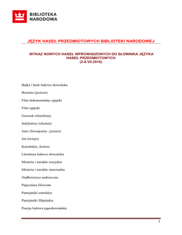JĘZYK HASEŁ PRZEDMIOTOWYCH BIBLIOTEKI NARODOWEJ WYKAZ NOWYCH HASEŁ WPROWADZONYCH DO SŁOWNIKA JĘZYKA HASEŁ PRZEDMIOTOWYCH (2-8.VII.2016) Bajka i baśń ludowa słoweńska Brzeźno (jezioro) Film dokumentalny egipski Film egipski Groszek różnolistny Indykatory (chemia) Joux (Szwajcaria ; jezioro) Jul (święto) Karsińskie, Jezioro Literatura ludowa słoweńska Misteria i mirakle rosyjskie Misteria i mirakle staroruskie Nadbrzeżyca nadrzeczna Pajęcznica liliowata Pamiętniki estońskie Pamiętniki filipińskie Poezja ludowa jugosłowiańska 1 Powieść kryminalna australijska Różyczkoprątnik kanadyjski Soplówka jodłowa Suita (saksofon i fortepian) Tefilin 2