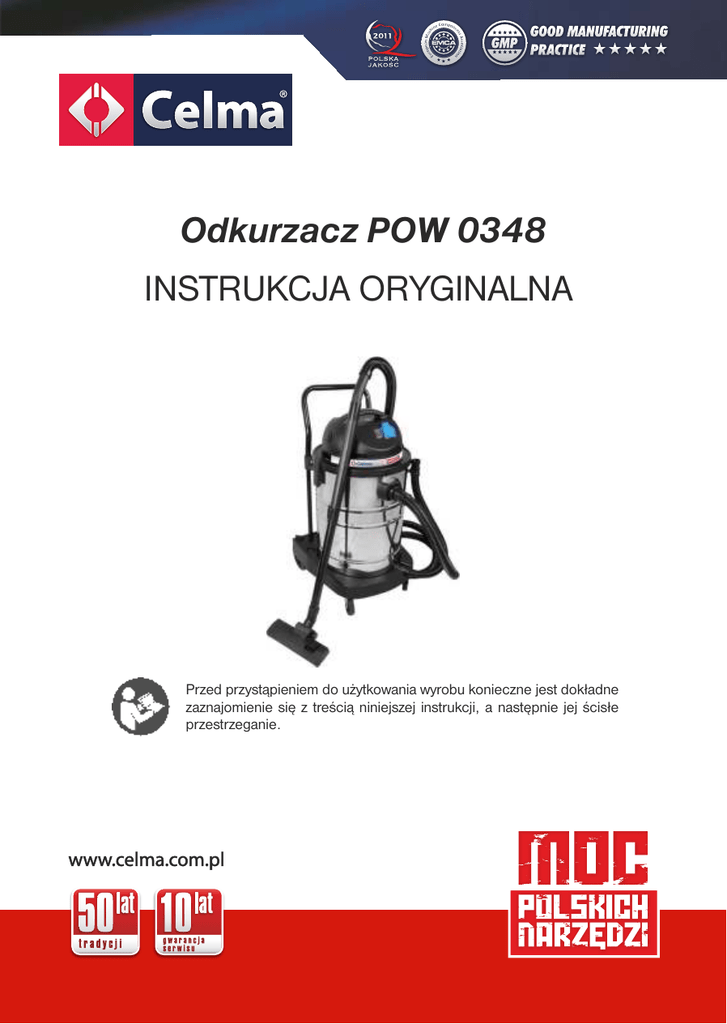 Odkurzacz POW 0348 INSTRUKCJA ORYGINALNA Przed przystąpieniem do użytkowania wyrobu konieczne jest dokładne zaznajomienie się z treścią niniejszej instrukcji, a następnie jej ścisłe przestrzeganie. Odkurzacz POW 0348 Części składowe odkurzacza POW 0348 Opis w treści instrukcji 3 ZASTOSOWANIE Odkurzacz warsztatowy do czyszczenia na mokro/sucho jest przeznaczony do usuwania zarówno suchych materiałów odpadowych, jak i płynów. UWAGA! Proszę dla własnego bezpieczeństwa przeczytać ten podręcznik oraz ogó lną instrukcję zasad bezpiecznego u ży t ko w a n i a p r z e d z a s t o s o w a n i e m urządzenia. Wszelkie elementy funkcjonujące w oparciu o elektryczność powinny być zgodne z tą instrukcją. 2. SPIS CZĘŚCI 1. Wyłącznik zasilania 2. Gniazdo elektryczne 3. Obudowa silnika 4. Uchwyt obudowy silnika 5. Kratka 6. Zacisk 7 Zbiornik 8. Przyłącze węża ssącego 9. Koła 10. Wąż ssący 11. Rura uchwytowa 12. Rura ssąca 13. Ssawka uniwersalna 14. Ssawka szczelinowa 15. Ssawka do czyszczenia tapicerki 16. Uszczelka 17. Filtr przeciwpyłowy 18. Pływak 19. Torba na kurz 20. Uchwyt torby na kurz 21. Krawędź wzniesiona 22. Filtr OPIS CZĘŚCI W OPAKOWANIU Usunąć wszystkie elementy opakowania. Usunąć wszystkie pozostałości po opakowaniu oraz transporcie, (jeżeli takowe istnieją) Upewnić się, co do kompletnej zawartości opakowania. Sprawdzić urządzenie, przewód zasilający, wtyczkę zasilającą oraz wszystkie dodatkowe części, pod kątem ewentualnego uszkodzenia podczas transportu. Jeśli to możliwe to przechować elementy opakowania tak długo jak urządzenie będzie objęte gwarancją. Po upływie tego okresu należy wyrzucić zgodnie z przyjętym systemem usuwania odpadów. 4 UWAGA Elementy opakowania to nie zabawki! Dzieci nie mogą bawić się plastikowymi opakowaniami. Grozi to uduszeniem! Wąż ssący Szczotka do podłóg Rura teleskopowa Narzędzie do czyszczenia dysz Ssawka szczelinowa Torba na kurz Szczotka do kurzu Koło 1 sztuka 1 sztuka 1 sztuka 2 sztuki 1 sztuka 1 sztuka 1 sztuka 4 sztuki W razie braku lub uszkodzenia części, prosimy skontaktować się ze sprzedawcą. OZNACZENIA W niniejszej instrukcji i/lub na urządzeniu użyto następujących symboli: Oznacza ryzyko odniesienia urazów, utraty życia lub uszkodzenia narzędzia w przypadku nieprzestrzegania instrukcji zawartych w niniejszym podręcz niku. Stosować środki ochrony słuchu. Nosić rękawice ochronne. Stosować środki ochrony wzroku. W zapylonym środowisku używać maski przeciwpyłowej. Spełnia niezbędne wymogi okrślone w dyrektywach europejskich. OGÓ LNE ZASADY KORZYSTANIA Z URZĄDZEŃ ELEKTRYCZNYCH Proszę przeczytać wszelkie ostrzeżenia odnoszące się do bezpieczeństwa oraz wszystkie instrukcje. Niedostosowanie się do wszystkich ostrzeżeń iinstrukcji może skutkować porażeniem prądem wznieceniem ognia i/lub poważnymi obrażeniami. Proszę zachować wszelkie ostrzeżenia i instrukcję do zastosowania wprzyszłości. Termin „urządzenie elektryczne” odnosi się w ostrzeżeniach do wyrobów funkcjonujących w oparciu o podłączenie do sieci (przewodowe) lub baterię (bezprzewodowe). Miejsce użytkowania Miejsce pracy należy utrzymywać w czystości oraz przy dobrym oświetleniu. Miejsca brudne i słabo oświetlone sprzyjają wypadkom. Nie korzystać z urządzenia w rejonie ulatniania się niebezpiecznych oparów, takich jak łatwopalne substancje, gazy lub pył. Urządzenia elektryczne mogą wytworzyć iskrę, która może doprowadzić do eksplozji lub zapalenia się pyłów lub oparów. Na czas korzystania z urządzenia należy trzymać dzieci oraz przypadkowe osoby z dala. Zakłócenie przez nich uwagi, może doprowadzić do utraty kontroli nad urządzeniem. Bezpieczeństwo elektryczne Zawsze należy sprawdzić, czy napięcie zasilające jest zgodne z napięciem podanym na tabliczce znamionowej. Wtyczka urządzenia musi pasować do gniazdka. Nie wolno modyfikować wtyczki w żaden sposób. Nie stosować jakichkolwiek przedłużaczy bez uziemienia (ciągłość uziemienia jest wymagana dla gniazdka na obudowie odkurzacza). Dostosowanie się do tych zaleceń zmniejszy prawdopodobieństwo porażenia elektrycznego. Unikać bezpośredniego kontaktu z uziemionymi obiektami takimi jak rury, radiatory, piece lub lodówki. Ryzyko porażenia wzrasta, jeśli ciało użytkownika jest uziemione. Nie narażać urządzenia na kontakt z deszczem lub wilgocią. Woda, która przeniknęła do urządzenia zwiększa ryzyko porażenia prądem elektrycznym. Nie wykorzystywać kabla zasilającego do celów, do których nie zostałon przeznaczony. Nie wolno z jego pomocą nieść, ciągnąć, ani gwałtownie odłączać urządzenia e-lek trycznego. Należy trzymać przewód z daleka od źródła ciepła, paliwa, ostrych krawędzi lub części ruchomych. Uszkodzony tub splątany przewód zwiększa prawdopodobieństwo porażenia prądem elektrycznym. Podczas korzystania z urządzenia poza domem, należy zastosować przedłużacze przeznaczone do użytku na zewnątrz. Zastosowanie przedłużacza przeznaczonego do użytku na zewnątrz zmniejsza ryzyko porażenia elektrycznego. Jeśli konieczność skorzystania z urządzenia elektrycznego w wilgotnych warunkach jest nie do uniknięcia, należy użyć wyłącznika różnicowo-prądowego, który redukuje niebezpieczeństwo porażenia prądem. Bezpieczeństwo osobiste Należy zachować ostrożność, uważać na wykonywane ruchy oraz sytuację dookoła podczas korzystania z urządzenia. Nie korzy stać z urządzenia, kiedy osoba jest zmęczona lub pod wpływem narkotyków, alkoholu lub leków. Chwila nieuwagi podczas stosowania urządzenia może skutkować poważnymi obrażeniami osobistymi. Korzystać z ubrania ochronnego. Zawsze nosić okulary ochronne. Stosować takie przedmioty jak maska przeciwpyłowa, obuwie antypoślizgowe, okrycie głowy, lub ochronniki słuchu, kiedy tylko będzie wymagała tego sytuacja, 