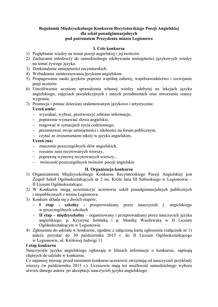 Regulamin Międzyszkolnego Konkursu Recytatorskiego Poezji Angielskiej dla szkół ponadgimnazjalnych pod patronatem Prezydenta miasta Legionowo I. Cele konkursu 1) Pogłębianie wiedzy na temat poezji angielskiej i jej twórców. 2) Zachęcanie młodzieży do samodzielnego zdobywania umiejętności językowych wiedzy na temat żywego języka. 3) Doskonalenie umiejętności recytatorskich. 4) Wzbudzanie zainteresowania językiem angielskim. 5) Propagowanie nauki języków poprzez wspólną zabawę, współzawodnictwo i rozwijanie pasji uczniów. 6) Umożliwienie uczniom sprawdzenia własnej wiedzy zdobytej na lekcjach języka angielskiego, zajęciach pozalekcyjnych i innych przedmiotach oraz stworzenie szansy wygrania. 7) Promocja i pomoc dzieciom utalentowanym językowo i artystycznie. Uczeń umie: wyszukać, wybrać, przetworzyć zebrane informacje, poprawnie wymawiać słowa angielskie, reagować w sytuacjach życia codziennego, prezentować swoje umiejętności i zdolności na forum publicznym, czytać ze zrozumieniem teksty w języku angielskim, Uczeń zna: znaczenie poszczególnych słów angielskich, rozumie sens recytowanych wierszy, poprawną wymowę recytowanych wierszy., twórczość poszczególnych twórców poezji angielskie II. Organizacja konkursu 1) Organizatorem Międzyszkolnego Konkursu Recytatorskiego Poezji Angielskiej jest Zespół Szkół Ogólnokształcących nr 2 im. Króla Jana III Sobieskiego w Legionowie – II Liceum Ogólnokształcące. 2) W Konkursie mogą uczestniczyć uczniowie szkół ponadgimnazjalnych publicznych i niepublicznych z terenu Legionowa. 3) Konkurs składa się z dwóch etapów; I etap - szkolny - przeprowadzany przez nauczycieli j. angielskiego w poszczególnych szkołach II etap – międzyszkolny – organizowany i przeprowadzany przez nauczycieli języka angielskiego, p. Krystynę Solińską i p. Monikę Wasilewską w II Liceum Ogólnokształcącym w Legionowie. 4) Zgłoszenia do udziału w konkursie, zgodnie z załączoną kartą zgłoszenia (załącznik nr 1) należy przysłać do 30 października 2015 r. do II Liceum Ogólnokształcącego w Legionowie, ul. Królowej Jadwigi 11. I etap konkursu Nauczyciele języka angielskiego ogłaszają w klasach informacje o konkursie, zapisują chętnych do udziału w konkursie. Co najmniej miesiąc przed terminem konkursu uczniowie otrzymują od nauczycieli przykłady wierszy (w październiku 2015 r.). Uczniowie mają też możliwość samodzielnego wyboru utworu danego autora po akceptacji nauczycieli języka angielskiego. Każdy uczeń przygotowuje prezentację jednego nauczonego na pamięć wiersza w języku angielskim oraz prezentację multimedialną o autorze wiersza. Nauczyciel wybiera 3 najlepsze interpretacje do II etapu II etap konkursu Uczestnicy konkursu najpierw przedstawiają prezentację multimedialną na temat autorów wybranych wierszy, po czym prezentacje są oceniane przez komisję konkursową. Następnie uczestnicy konkursu pojedynczo wchodzą na salę i przed komisją recytują wybrany przez siebie utwór. Podczas prezentacji dozwolone jest wykorzystanie środków artystycznych takich jak: mimika, gesty, ruch, strój czy inne rekwizyty. 1. Prezentowany wiersz powinien być dostosowany do wieku uczestnika konkursu. 2. Czas prezentacji nie może przekroczyć 3 minut 3. Uczniowie chętni do wzięcia udziału w konkursie zgłaszają się u swoich nauczycieli języka angielskiego. Do II etapu przechodzi trzech uczniów z każdej szkoły, którzy przedstawili najlepszą prezentację wiersza i prezentację multimedialną dotyczącą sylwetki autora wybranego utworu. Uczniów tych wybiera nauczyciel uczący w danej szkole. Zgłoszenia wyżej wymienionych uczniów u organizatora konkursu najpóźniej do 30 listopada 2015r. 4. W celu przeprowadzenia Konkursu organizator powołuje przewodniczącego komisji konkursowej mgr Monikę Wasilewską. 5. Termin II etapu konkursu: 15.12.2015r. godz. 9:00 6. Przewodniczący zaprasza do jury nauczycieli z innych szkół. 7. Prezentacje uczniów ocenia jury konkursu. 8. Wyniki zostaną ogłoszone w dniu konkursu. III. Nagrody 1. Laureaci – zdobywcy pierwszych trzech miejsc, otrzymują dyplomy i nagrody książkowe. 2. Wszyscy uczestnicy II etapu konkursu otrzymują mini-słowniczki języka angielskiego. Organizatorzy konkursu: Krystyna Solińska i Monika Wasilewska