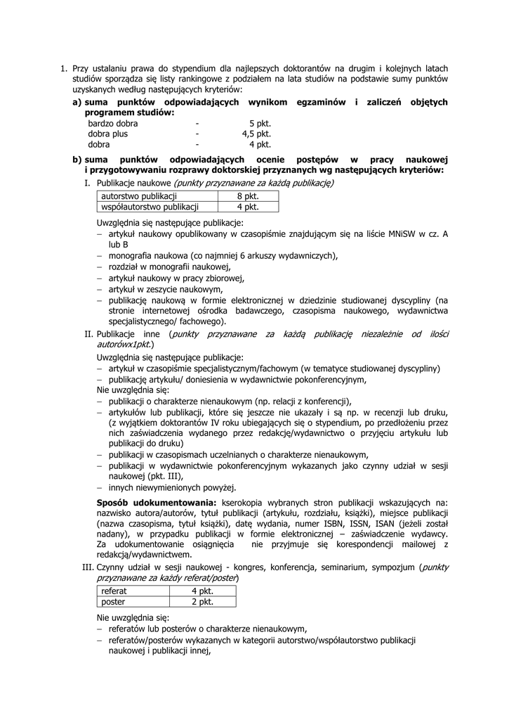 1. Przy ustalaniu prawa do stypendium dla najlepszych doktorantów na drugim i kolejnych latach studiów sporządza się listy rankingowe z podziałem na lata studiów na podstawie sumy punktów uzyskanych według następujących kryteriów: a) suma punktów odpowiadających wynikom programem studiów: bardzo dobra 5 pkt. dobra plus 4,5 pkt. dobra 4 pkt. egzaminów i zaliczeń objętych b) suma punktów odpowiadających ocenie postępów w pracy naukowej i przygotowywaniu rozprawy doktorskiej przyznanych wg następujących kryteriów: I. Publikacje naukowe (punkty przyznawane za każdą publikację) autorstwo publikacji współautorstwo publikacji 8 pkt. 4 pkt. Uwzględnia się następujące publikacje: − artykuł naukowy opublikowany w czasopiśmie znajdującym się na liście MNiSW w cz. A lub B − monografia naukowa (co najmniej 6 arkuszy wydawniczych), − rozdział w monografii naukowej, − artykuł naukowy w pracy zbiorowej, − artykuł w zeszycie naukowym, − publikację naukową w formie elektronicznej w dziedzinie studiowanej dyscypliny (na stronie internetowej ośrodka badawczego, czasopisma naukowego, wydawnictwa specjalistycznego/ fachowego). II. Publikacje inne (punkty przyznawane za każdą publikację niezależnie od ilości autorówx1pkt.) Uwzględnia się następujące publikacje: − artykuł w czasopiśmie specjalistycznym/fachowym (w tematyce studiowanej dyscypliny) − publikację artykułu/ doniesienia w wydawnictwie pokonferencyjnym, Nie uwzględnia się: − publikacji o charakterze nienaukowym (np. relacji z konferencji), − artykułów lub publikacji, które się jeszcze nie ukazały i są np. w recenzji lub druku, (z wyjątkiem doktorantów IV roku ubiegających się o stypendium, po przedłożeniu przez nich zaświadczenia wydanego przez redakcję/wydawnictwo o przyjęciu artykułu lub publikacji do druku) − publikacji w czasopismach uczelnianych o charakterze nienaukowym, − publikacji w wydawnictwie pokonferencyjnym wykazanych jako czynny udział w sesji naukowej (pkt. III), − innych niewymienionych powyżej. Sposób udokumentowania: kserokopia wybranych stron publikacji wskazujących na: nazwisko autora/autorów, tytuł publikacji (artykułu, rozdziału, książki), miejsce publikacji (nazwa czasopisma, tytuł książki), datę wydania, numer ISBN, ISSN, ISAN (jeżeli został nadany), w przypadku publikacji w formie elektronicznej – zaświadczenie wydawcy. Za udokumentowanie osiągnięcia nie przyjmuje się korespondencji mailowej z redakcją/wydawnictwem. III. Czynny udział w sesji naukowej - kongres, konferencja, seminarium, sympozjum (punkty przyznawane za każdy referat/poster) referat poster 4 pkt. 2 pkt. Nie uwzględnia się: − referatów lub posterów o charakterze nienaukowym, − referatów/posterów wykazanych w kategorii autorstwo/współautorstwo publikacji naukowej i publikacji innej, − biernego udziału w sesji naukowej. Ten sam referat/ poster naukowy zaprezentowany na więcej niż jednej konferencji naukowej uwzględnia się tylko jeden raz. Sposób udokumentowania: strony materiałów pokonferencyjnych lub zaświadczenie potwierdzające udział w sesji naukowej wystawione przez organizatora zawierające nazwisko autora/autorów, tytuł referatu/posteru, nazwę, termin i miejsce sesji naukowej. IV. Patenty/zgłoszenia złożone w Urzędzie Patentowym RP (punkty przyznawane za każde osiągnięcie) autorstwo lub współautorstwo patentu zgłoszenie patentowe 10 pkt. 5 pkt. Sposób udokumentowania: zaświadczenie wystawione przez Urząd Patentowy RP lub Rzecznika Patentowego o posiadaniu patentu/zatwierdzonego wzoru użytkowego/ zatwierdzonego wzoru przemysłowego lub zaświadczenie wystawione przez Urząd Patentowy RP lub Rzecznika Patentowego o zgłoszeniu patentu/zatwierdzonego wzoru użytkowego/ zatwierdzonego wzoru przemysłowego. V. Uzyskanie grantu badawczego lub udział w zespołowym programie badawczym (punkty przyznawane za każde osiągnięcie) uzyskanie grantu badawczego (NCN, NCiBR) udział w zespołowym programie badawczym 8 pkt. 4 pkt. *nie uwzględnia się badań zleconych i ekspertyz Sposób udokumentowania: w przypadku uzyskania grantu badawczego: dokument potwierdzający uzyskanie grantu badawczego zawierający nazwę/ numer grantu; datę uzyskania, czas trwania w przypadku udziału w zespołowym programie badawczym zaświadczenie kierownika projektu badawczego zawierające imię i nazwisko wnioskodawcy, nazwę programu badawczego, datę jego rozpoczęcia, czas trwania i zakres udziału doktoranta – wnioskodawcy. VI. Uczestnictwo w wymianie naukowej (punkty przyznawane za każdą wymianę) międzynarodowej międzyuczelnianej w Polsce 5 pkt. 2 pkt. Sposób udokumentowania: kserokopia umowy lub zaświadczenie potwierdzającej fakt i termin odbycia wymiany. VII. Pozostałe formy działalności naukowej (pkt. 1-3). VIII. Postępy w przygotowaniu rozprawy doktorskiej (pkt. 1-5). c) suma punktów odpowiadających ocenie zaangażowania w pracy dydaktycznej podczas studiów doktoranckich przyznanych wg następujących kryteriów: Prowadzenie lub uczestniczenie w prowadzeniu zajęć dydaktycznych w UTP zleconych przez Kierownika Katedry 1 - 15 godz. 16 - 30 godz. 31 - 45 godz. 46 - 60 godz. 61- 90 godz. 1 2 3 4 5 pkt. pkt. pkt. pkt. pkt. Doktoranci będący zatrudnieni w Uczelni na etacie dydaktycznym otrzymują 3 pkt. niezależnie od pensum. Wymagane informacje: nazwa przedmiotu, rodzaj zajęć, liczbę godzin w poprzednim roku akademickim. 2. W przypadku, gdy doktorant drugiego roku i kolejnych lat studiów otrzyma 0 pkt. w którymś z podpunktów pkt. 1 a, b lub c wniosek rozpatruje się negatywnie. 3. Każde osiągnięcie świadczące o postępach w pracy naukowej wymienione w pkt. 1b doktorant opisuje we wniosku o stypendium oraz poświadcza je odpowiednimi dokumentami. W przypadku braku dokumentu potwierdzającego wszystkie informacje niezbędne do właściwej kwalifikacji wskazanego przez doktoranta osiąg