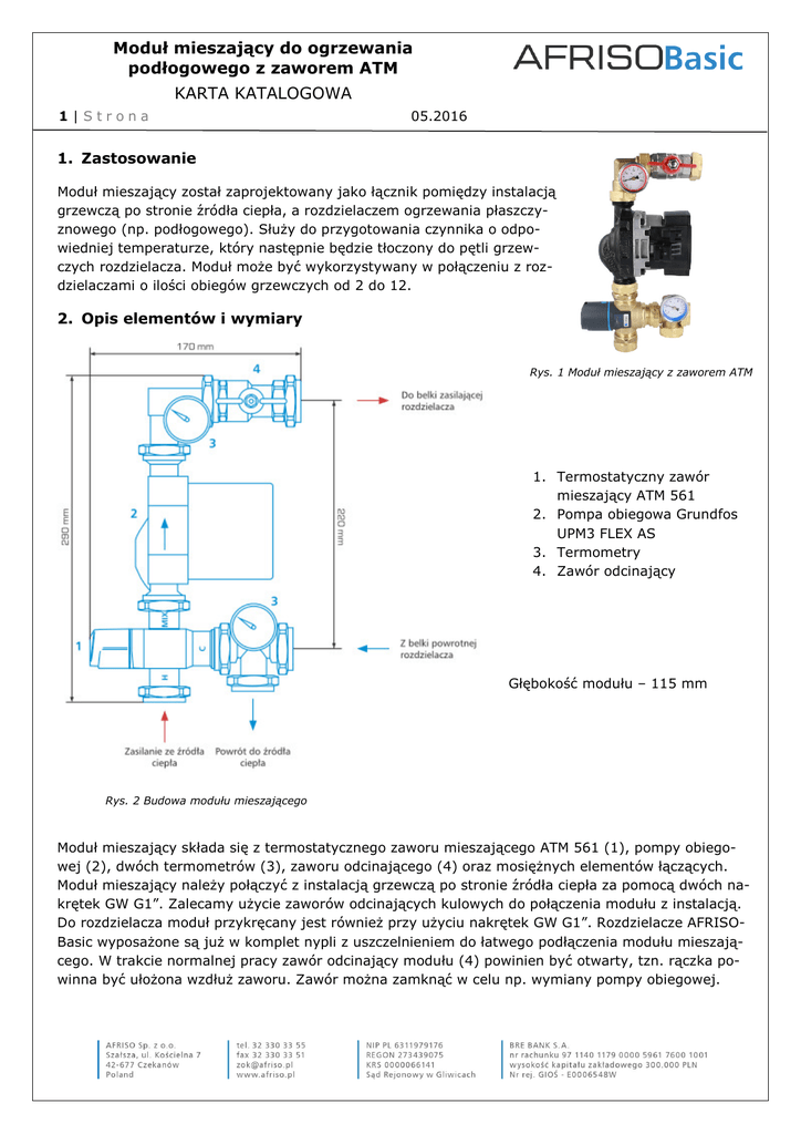 Moduł mieszający do ogrzewania podłogowego z zaworem ATM KARTA KATALOGOWA 1|Strona 05.2016 1. Zastosowanie Moduł mieszający został zaprojektowany jako łącznik pomiędzy instalacją grzewczą po stronie źródła ciepła, a rozdzielaczem ogrzewania płaszczyznowego (np. podłogowego). Służy do przygotowania czynnika o odpowiedniej temperaturze, który następnie będzie tłoczony do pętli grzewczych rozdzielacza. Moduł może być wykorzystywany w połączeniu z rozdzielaczami o ilości obiegów grzewczych od 2 do 12. 2. Opis elementów i wymiary Rys. 1 Moduł mieszający z zaworem ATM 1. Termostatyczny zawór mieszający ATM 561 2. Pompa obiegowa Grundfos UPM3 FLEX AS 3. Termometry 4. Zawór odcinający Głębokość modułu – 115 mm Rys. 2 Budowa modułu mieszającego Moduł mieszający składa się z termostatycznego zaworu mieszającego ATM 561 (1), pompy obiegowej (2), dwóch termometrów (3), zaworu odcinającego (4) oraz mosiężnych elementów łączących. Moduł mieszający należy połączyć z instalacją grzewczą po stronie źródła ciepła za pomocą dwóch nakrętek GW G1”. Zalecamy użycie zaworów odcinających kulowych do połączenia modułu z instalacją. Do rozdzielacza moduł przykręcany jest również przy użyciu nakrętek GW G1”. Rozdzielacze AFRISOBasic wyposażone są już w komplet nypli z uszczelnieniem do łatwego podłączenia modułu mieszającego. W trakcie normalnej pracy zawór odcinający modułu (4) powinien być otwarty, tzn. rączka powinna być ułożona wzdłuż zaworu. Zawór można zamknąć w celu np. wymiany pompy obiegowej. Moduł mieszający do ogrzewania podłogowego z zaworem ATM KARTA KATALOGOWA 2|Strona 05.2016 3. Przykład zestawu W komplecie z modułem mieszającym znajdują się dwa wieszaki o rozstawie 220 mm do rozdzielaczy mosiężnych C7. Wieszaków należy użyć kiedy łączymy moduł z rozdzielaczem o innym rozstawie przyłączy niż 220 mm. Rys. 3 Moduł mieszający z rozdzielaczem AFRISOBasic na 2 obiegi grzewcze 4. Dane techniczne Parametr / część Wartość / opis Ciśnienie pracy max 5 bar Temperatura pracy max 90°C Zakres nastawy zaworu ATM 20÷43°C Kvs zaworu ATM 2,5 m3/h Dokładność regulacji zaworu ATM ±2°C Zasilanie pompy 230 V AC Pompa Grundfos UPM3 FLEX AS 15-70/130 mm (z wtyczką kątową i kablem 1 m) 5. Dopuszczenia, certyfikaty i deklaracje zgodności Termostatyczne zawory mieszające ATM podlegają dyrektywie ciśnieniowej PED 97/23/WE i zgodnie z art. 3.3 (dobra praktyka inżynierska) nie są znakowane znakiem CE. W sprawie zgodności pompy obiegowej, znajdującej się na wyposażeniu modułu, z aktualnie obowiązującymi przepisami, zachęcamy do zapoznania się z instrukcją obsługi urządzenia.