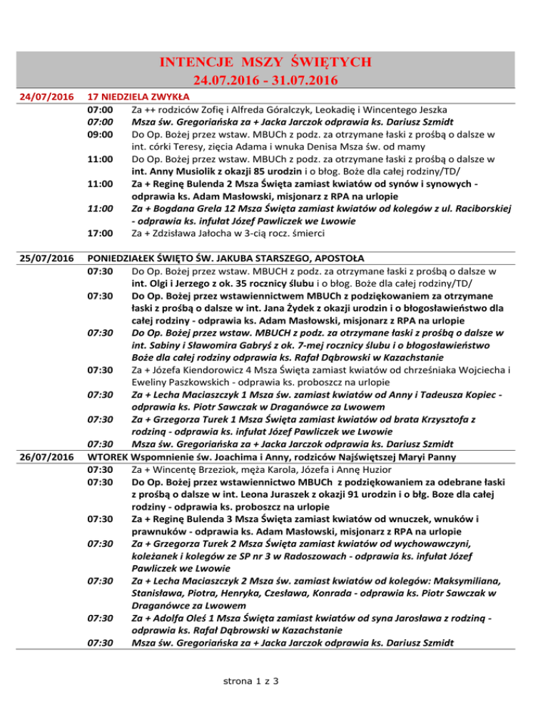 INTENCJE MSZY ŚWIĘTYCH 24.07.2016 - 31.07.2016 24/07/2016 17 NIEDZIELA ZWYKŁA 07:00 Za ++ rodziców Zofię i Alfreda Góralczyk, Leokadię i Wincentego Jeszka 07:00 Msza św. Gregoriańska za + Jacka Jarczok odprawia ks. Dariusz Szmidt 09:00 Do Op. Bożej przez wstaw. MBUCh z podz. za otrzymane łaski z prośbą o dalsze w int. córki Teresy, zięcia Adama i wnuka Denisa Msza św. od mamy 11:00 Do Op. Bożej przez wstaw. MBUCh z podz. za otrzymane łaski z prośbą o dalsze w int. Anny Musiolik z okazji 85 urodzin i o błog. Boże dla całej rodziny/TD/ 11:00 Za + Reginę Bulenda 2 Msza Święta zamiast kwiatów od synów i synowych odprawia ks. Adam Masłowski, misjonarz z RPA na urlopie 11:00 Za + Bogdana Grela 12 Msza Święta zamiast kwiatów od kolegów z ul. Raciborskiej - odprawia ks. infułat Józef Pawliczek we Lwowie 17:00 Za + Zdzisława Jałocha w 3-cią rocz. śmierci 25/07/2016 PONIEDZIAŁEK ŚWIĘTO ŚW. JAKUBA STARSZEGO, APOSTOŁA 07:30 Do Op. Bożej przez wstaw. MBUCH z podz. za otrzymane łaski z prośbą o dalsze w int. Olgi i Jerzego z ok. 35 rocznicy ślubu i o błog. Boże dla całej rodziny/TD/ 07:30 Do Op. Bożej przez wstawiennictwem MBUCh z podziękowaniem za otrzymane łaski z prośbą o dalsze w int. Jana Żydek z okazji urodzin i o błogosławieństwo dla całej rodziny - odprawia ks. Adam Masłowski, misjonarz z RPA na urlopie 07:30 Do Op. Bożej przez wstaw. MBUCH z podz. za otrzymane łaski z prośbą o dalsze w int. Sabiny i Sławomira Gabryś z ok. 7-mej rocznicy ślubu i o błogosławieństwo Boże dla całej rodziny odprawia ks. Rafał Dąbrowski w Kazachstanie 07:30 Za + Józefa Kiendorowicz 4 Msza Święta zamiast kwiatów od chrześniaka Wojciecha i Eweliny Paszkowskich - odprawia ks. proboszcz na urlopie 07:30 Za + Lecha Maciaszczyk 1 Msza św. zamiast kwiatów od Anny i Tadeusza Kopiec odprawia ks. Piotr Sawczak w Draganówce za Lwowem 07:30 Za + Grzegorza Turek 1 Msza Święta zamiast kwiatów od brata Krzysztofa z rodziną - odprawia ks. infułat Józef Pawliczek we Lwowie 07:30 Msza św. Gregoriańska za + Jacka Jarczok odprawia ks. Dariusz Szmidt WTOREK Wspomnienie św. Joachima i Anny, rodziców Najświętszej Maryi Panny 07:30 Za + Wincentę Brzeziok, męża Karola, Józefa i Annę Huzior 07:30 Do Op. Bożej przez wstawiennictwo MBUCh z podziękowaniem za odebrane łaski z prośbą o dalsze w int. Leona Juraszek z okazji 91 urodzin i o błg. Boze dla całej rodziny - odprawia ks. proboszcz na urlopie 07:30 Za + Reginę Bulenda 3 Msza Święta zamiast kwiatów od wnuczek, wnuków i prawnuków - odprawia ks. Adam Masłowski, misjonarz z RPA na urlopie 07:30 Za + Grzegorza Turek 2 Msza Święta zamiast kwiatów od wychowawczyni, koleżanek i kolegów ze SP nr 3 w Radoszowach - odprawia ks. infułat Józef Pawliczek we Lwowie 07:30 Za + Lecha Maciaszczyk 2 Msza św. zamiast kwiatów od kolegów: Maksymiliana, Stanisława, Piotra, Henryka, Czesława, Konrada - odprawia ks. Piotr Sawczak w Draganówce za Lwowem 07:30 Za + Adolfa Oleś 1 Msza Święta zamiast kwiatów od syna Jarosława z rodziną odprawia ks. Rafał Dąbrowski w Kazachstanie 07:30 Msza św. Gregoriańska za + Jacka Jarczok odprawia ks. Dariusz Szmidt 26/07/2016 strona 1 z 3 27/07/2016 28/07/2016 29/07/2016 30/07/2016 ŚRODA 07:30 07:30 Za ++ rodziców Helenę i Stefana Masłowski w rocznicę śmierci Za + Elżbietę Kasperzec 1 Msza św. zamiast kwiatów od córki z rodziną - odprawia ks. proboszcz na urlopie 07:30 Za + Reginę Bulenda 4 Msza Święta zamiast kwiatów od chrześniaka Grzegorza z rodziną - odprawia ks. Adam Masłowski, misjonarz z RPA na urlopie 07:30 Za + Grzegorza Turek 3 Msza Święta zamiast kwiatów od siostry Anny z rodziną odprawia ks. infułat Józef Pawliczek we Lwowie 07:30 Za + Helenę Iksal 1 Msza Święta zamiast kwiatów od Róży Różańcowej nr 2 odprawia ks. Piotr Sawczak w Dragnowce za Lwowem 07:30 Msza św. Gregoriańska za + Jacka Jarczok odprawia ks. Dariusz Szmidt CZWARTEK 07:30 Za + Stanisława Szymik w 4 rocznicę śmierci 07:30 Za + Helenę Iksal 2 Msza Święta zamiast kwiatów od syna Henryka - odprawia ks. proboszcz na urlopie 07:30 Za + Adolfa Oleś 3 Msza Święta zamiast kwiatów od Heleny i Kazimierza Migas odprawia ks. Piotr Sawczak w Draganowce za Lwowem 07:30 Za + Grzegorza Turek 4 Msza Święta zamiast kwiatów od matki - odprawia ks. infułat Józef Pawliczek we Lwowie 07:30 Msza św. Gregoriańska za + Jacka Jarczok odprawia ks. Dariusz Szmidt PIĄTEK Wspomnienie św. Marty 07:30 Za + Mariolę Wodecką na pamiątkę urodzin 07:30 Za + Edytę Paciulan na pam. urodzin - odprawia ks. proboszcz na urlopie 07:30 Za + Stanisława Porwollik na pam. urodzin - odprawia ks. Piotr Sawczak w Draganowce za Lwowem 07:30 Do Op. Bożej przez wstawiennictwo MBUCh z podziękowaniem za odebrane łaski z prośbą o dalsze w intencji Doroty Wiśniewskiej z okazji 40 urodzin i o błog. Boże dla całej rodziny - odprawia ks. Rafał Dąbrowski w Kazachstanie 07:30 Za + Grzegorza Turek 5 Msza Święta zamiast kwiatów od matki - odprawia ks. infułat Józef Pawliczek we Lwowie 07:30 Msza św. Gregoriańska za + Jacka Jarczok odprawia ks. Dariusz Szmidt SOBOTA 07:30 GODZINKI 08:00 Za żywych i zmarłych członków Róż Różańcowych 08:00 Do Op. Bożej przez wstaw. MBUCh z podz. za otrzymane łaski z prośbą o dalsze w int. Eugeniusza Polnik z ok. urodzin i o błog. Boże dla całej rodziny - odprawia ks. proboszcz na urlopie 08:00 Do Op. Bożej przez wstaw. MBUCh z podz. za otrzymane łaski z prośbą o dalsze w int. Ireneusza Rojek z ok. urodzin i o błog. Boże dla całej rodziny odprawia ks. Piotr Sawczak w Draganowce za Lwowem 08:00 Za + Andrzeja Twardzik w 30 dzień po śmierci - odprawia ks. Rafał Dąbrowski w Kazachstanie 08:00 Za + Grzegorza Turek 6 Msza Święta zamiast kwiatów od rodzin Zientek i Michna odprawia ks. infułat Józef Pawliczek we Lwowie 08:00 Msza św. Gregoriańska za + Jacka Jarczok odprawia ks. Dariusz Szmidt 16
