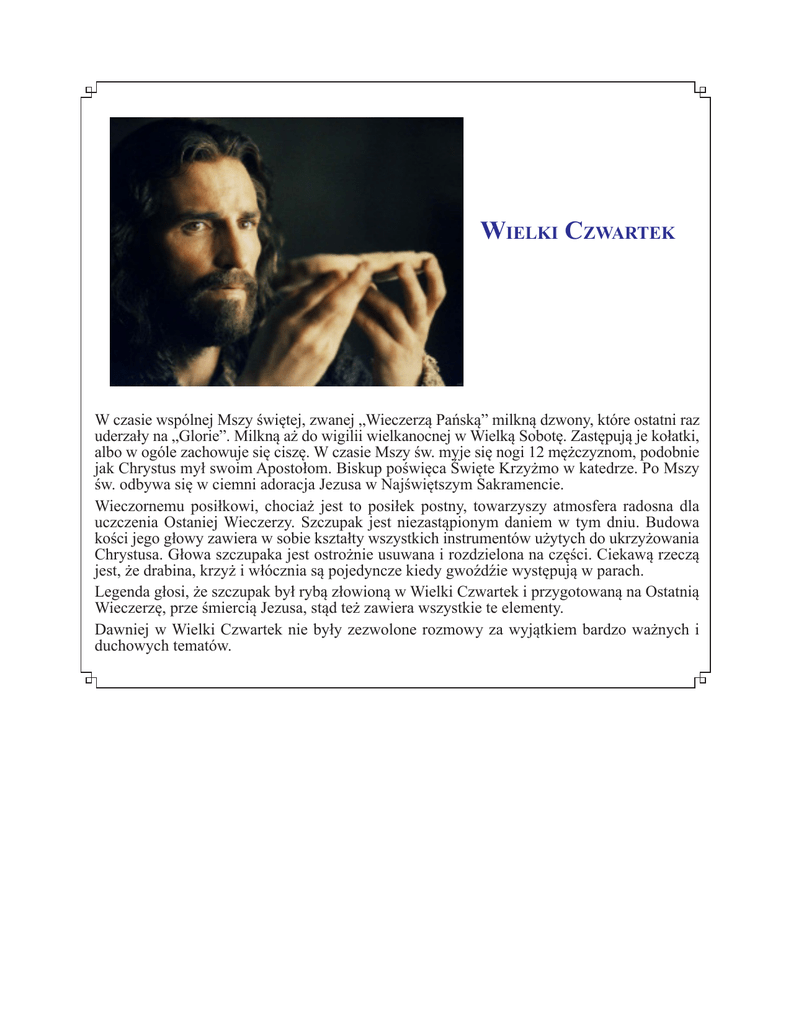 Wielki Czwartek W czasie wspólnej Mszy świętej, zwanej „Wieczerzą Pańską” milkną dzwony, które ostatni raz uderzały na „Glorie”. Milkną aż do wigilii wielkanocnej w Wielką Sobotę. Zastępują je kołatki, albo w ogóle zachowuje się ciszę. W czasie Mszy św. myje się nogi 12 mężczyznom, podobnie jak Chrystus mył swoim Apostołom. Biskup poświęca Święte Krzyżmo w katedrze. Po Mszy św. odbywa się w ciemni adoracja Jezusa w Najświętszym Sakramencie. Wieczornemu posiłkowi, chociaż jest to posiłek postny, towarzyszy atmosfera radosna dla uczczenia Ostaniej Wieczerzy. Szczupak jest niezastąpionym daniem w tym dniu. Budowa kości jego głowy zawiera w sobie kształty wszystkich instrumentów użytych do ukrzyżowania Chrystusa. Głowa szczupaka jest ostrożnie usuwana i rozdzielona na części. Ciekawą rzeczą jest, że drabina, krzyż i włócznia są pojedyncze kiedy gwoźdźie występują w parach. Legenda głosi, że szczupak był rybą złowioną w Wielki Czwartek i przygotowaną na Ostatnią Wieczerzę, prze śmiercią Jezusa, stąd też zawiera wszystkie te elementy. Dawniej w Wielki Czwartek nie były zezwolone rozmowy za wyjątkiem bardzo ważnych i duchowych tematów.
