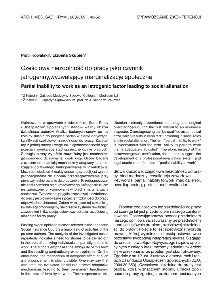 ARCH. MED. SĄD. KRYM., 2007, LVII, 49-52 Sprawozdanie z konferencji Piotr Kowalski1, Elżbieta Skupień2 Częściowa niezdolność do pracy jako czynnik jatrogenny,wyzwalający marginalizację społeczną Partial inability to work as an iatrogenic factor leading to social alienation 1 2 Z Katedry i Zakładu Medycyny Sądowej Collegium Medicum UJ Z Instytutu Ekspertyz Sądowych im. prof. dr. J. Sehna w Krakowie Opiniowanie w sprawach z odwołań do Sądu Pracy i Ubezpieczeń Społecznych stanowi ważny obszar działalności autorów. Analiza badanych spraw, po raz kolejny skłania do podjęcia badań w sferze dotyczącej kwalifikacji częściowej niezdolności do pracy. Zwracamy z jednej strony uwagę na niejednoznaczność tego pojęcia i wynikające stąd sprzeczne opinie biegłych. Z drugiej strony wyraźnie zauważalny jest mechanizm jatrogennego działania tej kwalifikacji. Osoby badane z czasem uruchamiają mechanizmy adaptacyjne zmierzające do trwałego funkcjonowania w inwalidztwie. Można powiedzieć iż reaktywność tej sytuacji jest wprost proporcjonalna do stopnia przediagnozowania przy pierwszym skierowaniu do orzecznika. Przediagnozowanie nosi znamiona błędu medycznego, którego skutkiem jest zaburzone funkcjonowanie w rolach i marginalizacja społeczna. Tymczasem pojęcie częściowej niezdolności do pracy jest równoważne z pojęciem zdolności do pracy odpowiednio dobranej. Zatem w miejsce tej szkodliwej kwalifikacji proponujemy stworzenie systemu rewalidacji zawodowej i likwidację ustawową pojęcia „częściowej niezdolności do pracy”. Passing expert opinions in cases referred to the Labor and Social Insurance Court is a major field of activities of the present authors. The analysis of the investigated cases repeatedly indicates a need for studies to be carried out in the area of certifying individuals as partially unable to work. The authors emphasize the ambiguity of this term and the resulting contradictory expert opinions. On the other hand, the mechanism of iatrogenic effect of such a pronouncement is clearly visible. One may say that with time, the evaluated individuals activate adaptative mechanisms leading to their permanent functioning in the state of inability to work. Their response to this situation is directly proportional to the degree of original overdiagnosis during the first referral to an insurance inspector. Overdiagnosing can be qualified as a medical error, which results in impaired functioning in social roles and in social alienation. The term “partial inability to work” is synonymous with the term “ability to perform work that is adequately adjusted”. Therefore, instead of this disadvantageous certification, the authors suggest the development of a professional revalidation system and legal eradication of the term “partial inability to work”. Słowa kluczowe: częściowa niezdolność do pracy, błąd medyczny, rewalidacja zawodowa Key words: partial inability to work, medical error, overdiagnosing, professional revalidation Problem zdolności czy też niezdolności do pracy od szeregu lat jest przedmiotem naszego zainteresowania. Obserwując sprawy, będące przedmiotem naszego opiniowania, zauważamy, że przedmiotem sporu jest głównie problem „częściowej niezdolności do pracy”. Pojęcie to jest specyficzną hybrydą prawną, której wypełnienie treścią ustawodawca pozostawił swobodnej interpretacji lekarza. Sięgając do orzecznictwa Sądu Najwyższego i sądów apelacyjnych z całego kraju możemy jedynie utwierdzić się w przekonaniu, że problem jest skomplikowany. Zgodnie z art.12 ust. 3 ustawy o emeryturach i rentach z Funduszu Ubezpieczeń Społecznych (Dz.U. 2004.39.353) „Częściowo niezdolna do pracy jest osoba, która w znacznym stopniu utraciła zdolność do pracy zgodnej z poziomem posiadanych 50 Piotr Kowalski, Elżbieta Skupień kwalifikacji i nie rokuje odzyskania tej zdolności po przekwalifikowaniu”[1, 2, 3]. Ustawodawca założył, że lekarz będzie oprócz stanu zdrowia oceniał posiadane przez badaną osobę kwalifikacje zawodowe i zupełnie nie zdefiniowany „stopień utraty zdolności do pracy”. Wykładnia zawarta w art.13 ustawy określa czynniki jakie należy brać pod uwagę przy dokonywaniu oceny niezdolności do pracy, ale każde z zawartych tam wskazań pozostawia szeroki margines subiektywizmu. Oczywistym jest, że taka formuła zapisu uruchamia cały szereg pokus, o których ostatnio szeroko donosi prasa. Przedmiotem naszego obecnego zainteresowania nie są jednak nieprawidłowości orzecznicze wynikające z wpływu tych pokus na przyznawanie uprawnień do renty, będącej nadal przedmiotem pożądania, a analiza mechanizmów, jakie uruchamia proces orzeczniczy. Zgodnie z zapisem w Kodeksie Etyki Lekarskiej [4], „Największym nakazem etycznym dla lekarza jest dobro chorego”, na który powołują się lekarze wydając na życzenie pacjenta zwolnienie od pracy, zaświadczenie o stanie zdrowia nie do końca zgodne ze stanem faktycznym. Konflikt ról, jaki występuje pomiędzy lekarzem klinicystą a lekarzem orzecznikiem jest coraz częściej podnoszony w piśmiennictwie [5, 6, 7]. Pozostaje jednak otwarte pytanie, jak należy rozumieć „dobro chorego”, szczególnie w sytuacji, w której pacjent zgłasza się do lekarza nie jako chory, a jako interesant, starający się o pozyskanie określonego dobra ekonomicznego. Czy w takim przypadku rzeczywiście należy mu bezkrytycznie pomagać w realizacji jego planu? Naszym zdaniem, bez zbytniej przesady, można przypisać takiemu działaniu lekarskiemu charakter jatrogenny. Gdy w relacji pacjent lekarz pojawia się zaświadczenie o stanie zdrowia, z takim rozpoznaniem (czy rozpoznaniami), które wzbudza nadzieje na uzyskanie orzeczenia o częściowej niezdolności do pracy przed pacjentem roztacza się pewna wizja rozwiązania jego problemów życiowych [8]. Oto przestaje się on lękać o utratę pracy, będzie otrzymyw