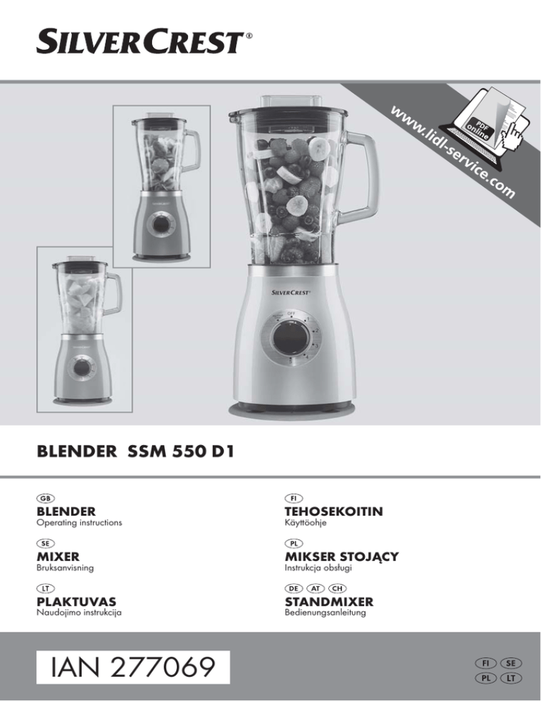 BLENDER SSM 550 D1 BLENDER TEHOSEKOITIN Operating instructions Käyttöohje MIXER MIKSER STOJĄCY PLAKTUVAS STANDMIXER Bruksanvisning Naudojimo instrukcija IAN 277069 Instrukcja obsługi Bedienungsanleitung Before reading, unfold the page containing the illustrations and familiarise yourself with all functions of the device. Käännä ennen lukemista kuvallinen sivu esiin ja tutustu seuraavaksi laitteen kaikkiin toimintoihin. Vik ut bildsidan och ha den till hands när du läser igenom anvisningarna och gör dig bekant med apparatens / maskinens funktioner. Przed przeczytaniem proszę rozłożyć stronę z ilustracjami, a następnie proszę zapoznać się z wszystkimi funkcjami urządzenia. Prieš skaitydami atsiverskite lapą su paveikslėliais ir susipažinkite su visomis prietaiso funkcijomis. Klappen Sie vor dem Lesen die Seite mit den Abbildungen aus und machen Sie sich anschließend mit allen Funktionen des Gerätes vertraut. GB FI SE PL LT DE / AT / CH Operating instructions Käyttöohje Bruksanvisning Instrukcja obsługi Naudojimo instrukcija Bedienungsanleitung Page Sivu Sidan Strona Puslapis Seite 1 19 37 55 73 91 Contents Introduction . . . . . . . . . . . . . . . . . . . . . . . . . . . . . . . . . . . . . . . . . . . . . . . . . . . 2 Intended use . . . . . . . . . . . . . . . . . . . . . . . . . . . . . . . . . . . . . . . . . . . . . . . . . . 2 Package contents . . . . . . . . . . . . . . . . . . . . . . . . . . . . . . . . . . . . . . . . . . . . . . 2 Disposal of the packaging . . . . . . . . . . . . . . . . . . . . . . . . . . . . . . . . . . . . . . . . . . . . . . . . . . 3 Appliance description . . . . . . . . . . . . . . . . . . . . . . . . . . . . . . . . . . . . . . . . . . . 3 Technical details . . . . . . . . . . . . . . . . . . . . . . . . . . . . . . . . . . . . . . . . . . . . . . . 3 Safety information . . . . . . . . . . . . . . . . . . . . . . . . . . . . . . . . . . . . . . . . . . . . . 4 Unpacking . . . . . . . . . . . . . . . . . . . . . . . . . . . . . . . . . . . . . . . . . . . . . . . . . . . 7 Setting up. . . . . . . . . . . . . . . . . . . . . . . . . . . . . . . . . . . . . . . . . . . . . . . . . . . . . 7 Operation . . . . . . . . . . . . . . . . . . . . . . . . . . . . . . . . . . . . . . . . . . . . . . . . . . . . 8 Fitting and filling the blender attachment . . . . . . . . . . . . . . . . . . . . . . . . . . . . . . . . . . . . . . . 8 Selecting the speed setting . . . . . . . . . . . . . . . . . . . . . . . . . . . . . . . . . . . . . . . . . . . . . . . . . 8 Filling during operation . . . . . . . . . . . . . . . . . . . . . . . . . . . . . . . . . . . . . . . . . . . . . . . . . . . . 9 Removing the blender attachment . . . . . . . . . . . . . . . . . . . . . . . . . . . . . . . . . . . . . . . . . . . . 9 Recipes . . . . . . . . . . . . . . . . . . . . . . . . . . . . . . . . . . . . . . . . . . . . . . . . . . . . . . 10 Banana shake . . . . . . . . . . . . . . . . . . . . . . . . . . . . . . . . . . . . . . . . . . . . . . . . . . . . . . . . . . 10 Vanilla shake . . . . . . . . . . . . . . . . . . . . . . . . . . . . . . . . . . . . . . . . . . . . . . . . . . . . . . . . . . . 10 Cappuccino shake . . . . . . . . . . . . . . . . . . . . . . . . . . . . . . . . . . . . . . . . . . . . . . . . . . . . . . . 10 Tropical mix . . . . . . . . . . . . . . . . . . . . . . . . . . . . . . . . . . . . . . . . . . . . . . . . . . . . . . . . . . . 11 Nut-nougat shake . . . . . . . . . . . . . . . . . . . . . . . . . . . . . . . . . . . . . . . . . . . . . . . . . . . . . . . 11 Carrot shake . . . . . . . . . . . . . . . . . . . . . . . . . . . . . . . . . . . . . . . . . . . . . . . . . . . . . . . . . . . 11 Blackcurrant mix . . . . . . . . . . . . . . . . . . . . . . . . . . . . . . . . . . . . . . . . . . . . . . . . . . . . . . . . 11 Hawaii shake . . . . . . . . . . . . . . . . . . . . . . . . . . . . . . . . . . . . . . . . . . . . . . . . . . . . . . . . . . . 12 Fruity pineapple-strawberry mix. . . . . . . . . . . . . . . . . . . . . . . . . . . . . . . . . . . . . . . . . . . . . 12 Andalusian cold soup (gazpacho) . . . . . . . . . . . . . . . . . . . . . . . . . . . . . . . . . . . . . . . . . . 12 Cleaning . . . . . . . . . . . . . . . . . . . . . . . . . . . . . . . . . . . . . . . . . . . . . . . . . . . . . 13 Cleaning the blender attachment . . . . . . . . . . . . . . . . . . . . . . . . . . . . . . . . . . . . . . . . . . . 13 Cleaning the motor unit . . . . . . . . . . . . . . . . . . . . . . . . . . . . . . . . . . . . . . . . . . . . . . . . . . . 15 After cleaning . . . . . . . . . . . . . . . . . . . . . . . . . . . . . . . . . . . . . . . . . . . . . . . . . . . . . . . . . . 15 Storage . . . . . . . . . . . . . . . . . . . . . . . . . . . . . . . . . . . . . . . . . . . . . . . . . . . . . 15 Appendix . . . . . . . . . . . . . . . . . . . . . . . . . . . . . . . . . . . . . . . . . . . . . . . . . . . . 15 Disposal of the device . . . . . . . . . . . . . . . . . . . . . . . . . . . . . . . . . . . . . . . . . . . . . . . . . . . . 15 Kompernass Handels GmbH warranty. . . . . . . . . . . . . . . . . . . . . . . . . . . . 16 Service . . . . . . . . . . . . . . . . . . . . . . . . . . . . . . . . . . . . . . . . . . . . . . . . . . . . . . . . . . . . . . . . 17 Importer . . . . . . . . . . . . . . . . . . . . . . . . . . . . . . . . . . . . . . . . . . . . . . . . . . . . . . . . . . . . . . . 17 Read these operating instructions carefully before using the appliance for the first time and retain them for future reference. Please pass these operating instructions on to any future owner(s). SSM 550 D1 GB │ 1 ■ Introduction Congratulations on the purchase of your new appliance! You have chosen a modern, high-quality product. These operating instructions are part of the product. They contain important information about safety, usage and disposal. Before using the product, please familiarise yourself with all operating and