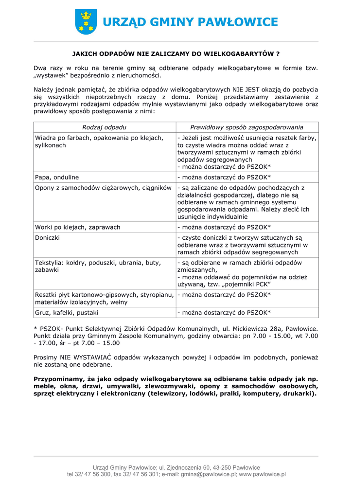 JAKICH ODPADÓW NIE ZALICZAMY DO WIELKOGABARYTÓW ? Dwa razy w roku na terenie gminy są odbierane odpady wielkogabarytowe w formie tzw. „wystawek” bezpośrednio z nieruchomości. Należy jednak pamiętać, że zbiórka odpadów wielkogabarytowych NIE JEST okazją do pozbycia się wszystkich niepotrzebnych rzeczy z domu. Poniżej przedstawiamy zestawienie z przykładowymi rodzajami odpadów mylnie wystawianymi jako odpady wielkogabarytowe oraz prawidłowy sposób postępowania z nimi: Rodzaj odpadu Prawidłowy sposób zagospodarowania Wiadra po farbach, opakowania po klejach, sylikonach - Jeżeli jest możliwość usunięcia resztek farby, to czyste wiadra można oddać wraz z tworzywami sztucznymi w ramach zbiórki odpadów segregowanych - można dostarczyć do PSZOK* Papa, onduline - można dostarczyć do PSZOK* Opony z samochodów ciężarowych, ciągników - są zaliczane do odpadów pochodzących z działalności gospodarczej, dlatego nie są odbierane w ramach gminnego systemu gospodarowania odpadami. Należy zlecić ich usunięcie indywidualnie Worki po klejach, zaprawach - można dostarczyć do PSZOK* Doniczki - czyste doniczki z tworzyw sztucznych są odbierane wraz z tworzywami sztucznymi w ramach zbiórki odpadów segregowanych Tekstylia: kołdry, poduszki, ubrania, buty, zabawki - są odbierane w ramach zbiórki odpadów zmieszanych, - można oddawać do pojemników na odzież używaną, tzw. „pojemniki PCK” Resztki płyt kartonowo-gipsowych, styropianu, - można dostarczyć do PSZOK* materiałów izolacyjnych, wełny Gruz, kafelki, pustaki - można dostarczyć do PSZOK* * PSZOK- Punkt Selektywnej Zbiórki Odpadów Komunalnych, ul. Mickiewicza 28a, Pawłowice. Punkt działa przy Gminnym Zespole Komunalnym, godziny otwarcia: pn 7.00 - 15.00, wt 7.00 - 17.00, śr – pt 7.00 – 15.00 Prosimy NIE WYSTAWIAĆ odpadów wykazanych powyżej i odpadów im podobnych, ponieważ nie zostaną one odebrane. Przypominamy, że jako odpady wielkogabarytowe są odbierane takie odpady jak np. meble, okna, drzwi, umywalki, zlewozmywaki, opony z samochodów osobowych, sprzęt elektryczny i elektroniczny (telewizory, lodówki, pralki, komputery, drukarki).