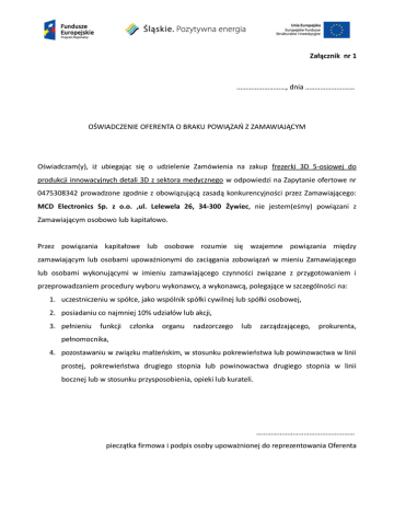 Załącznik nr 1 ………………………, dnia ……………………… OŚWIADCZENIE OFERENTA O BRAKU POWIĄZAŃ Z ZAMAWIAJĄCYM Oświadczam(y), iż ubiegając się o udzielenie Zamówienia na zakup frezerki 3D 5-osiowej do produkcji innowacyjnych detali 3D z sektora medycznego w odpowiedzi na Zapytanie ofertowe nr 0475308342 prowadzone zgodnie z obowiązującą zasadą konkurencyjności przez Zamawiającego: MCD Electronics Sp. z o.o. ,ul. Lelewela 26, 34-300 Żywiec, nie jestem(eśmy) powiązani z Zamawiającym osobowo lub kapitałowo. Przez powiązania kapitałowe lub osobowe rozumie się wzajemne powiązania między zamawiającym lub osobami upoważnionymi do zaciągania zobowiązań w mieniu Zamawiającego lub osobami wykonującymi w imieniu zamawiającego czynności związane z przygotowaniem i przeprowadzaniem procedury wyboru wykonawcy, a wykonawcą, polegające w szczególności na: 1. uczestniczeniu w spółce, jako wspólnik spółki cywilnej lub spółki osobowej, 2. posiadaniu co najmniej 10% udziałów lub akcji, 3. pełnieniu funkcji członka organu nadzorczego lub zarządzającego, prokurenta, pełnomocnika, 4. pozostawaniu w związku małżeńskim, w stosunku pokrewieństwa lub powinowactwa w linii prostej, pokrewieństwa drugiego stopnia lub powinowactwa drugiego stopnia w linii bocznej lub w stosunku przysposobienia, opieki lub kurateli. ……………………………………………… pieczątka firmowa i podpis osoby upoważnionej do reprezentowania Oferenta