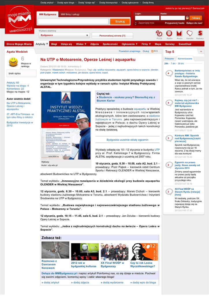Dodaj artykuł Dodaj wpis bloga Dodaj "dzieje się" Dodaj fotoreportaż Dodaj ogłoszenie Dodaj firmę Jesteś tu po raz pierwszy? Samouczek MM Bydgoszcz Login: MM firmy i usługi Hasło: b Zapamiętaj mnie c d e f g Przypomnij hasło Dołącz do nas! Wybierz dzielnicę Bydgoszcz Personalizuj stronę [?] Pizza Strona Mojego Miasta Artykuły Blogi Dzieje się Wideo Zdjęcia Miejsce w rankingu brak opisu Artykuły: 60 Wpisów na blogu: 4 Komentarzy: 22 Miejsc na mapie: 12 Ogłoszenia Powiadom znajomego Agata Wodzień 6 Społeczność Firmy Mapa Drukuj Na UTP o Motoarenie, Operze Leśnej i aquaparku Dodane 2012-01-09 18.03 , komentarzy 0 Kategorie: Wiadomości Miejsce: Bydgoszcz, Tagi: utp, wielka nieszawka, aquapark, opera leśna w sopocie, olender, piotr piątek, marek cichoń, motoarena, jan dziuba, opera leśna, sopot, Radio Serwisy Autor ostatnio dodał: Na UTP o Motoarenie, Operze Leśnej i aquaparku Bydgoskie inwestycje w 2012 Bydgoskie uczelnie oblały egzamin Polecane Komentowane 30 dni 4 4 Temat wykładu: „Budowa największego i najnowocześniejszego stadionu żużlowego w Polsce – Motoareny w Toruniu”. 12 stycznia, godz. 10.15 – 11.45, sala 6, bud. 2.1 – prowadzący: Jan Dziuba – kierownik budowy Opery Leśnej w Sopocie. Temat wykładu: „Jedna z najtrudniejszych konstrukcji dachu na świecie – Opera Leśna w Sopocie”. Zobacz też: Rozmowa z Damianem Nenowem 2012 rok w bydgoskiej kulturze XX Finał WOŚP w Bydgoszczy Czy to rok Leona Wyczółkowskiego? Dołącz do MMBydgoszcz.pl i napisz artykuł! Poinformuj nas, co się dzieje w mieście. Pochwal się swoimi zdjęciami, komentuj wpisy i załóż własnego bloga! » dodaj artykuł » dodaj zdjęcia » dodaj wydarzenie » dodaj wpis do bloga Kujawy, czy już nie? materiał użytkownika MM Bydgoszcz Jest wprawdzie w Bydgoszczy ulica Kujawska i jest też Pomorska. Kujawska nawet ważniejsza, ale Galeria jest już tylko Pomorska, podobnie jak 2011-08-21 12.08 3 Konkurs MM: Sputnik nad Bydgoszczą [część pierwsza] Sputnik nad Bydgoszczą rozpoczyna się już 16 stycznia. Z tej okazji mamy dla was konkurs! 2012-01-09 15.00 2 Egzamin na prawo jazdy. Nowe zasady od stycznia 2013 Zmiany zasad egzaminów na prawo jazdy będą aktualne od początku przyszłego roku. Temat wykładu: „Innowacyjne rozwiązania w dziedzinie ekologii przy budowie aquaparku OLENDER w Wielkiej Nieszawce”. 12 stycznia, godz. 8.30 – 10.00, sala A3, bud. 2.1 – prowadzący: Marek Cichoń – kierownik budowy stadionu żużlowego Motoarena w Toruniu, absolwent Wydziału Budownictwa i Inżynierii Środowiska na UTP w Bydgoszczy. Barbarzyństwo w imię postępu - historia Kanału Bydgoskiego 2012-01-09 10.27 Wykłady 10 stycznia, godz. 8.30 – 10.00, sala A2, bud. 2.1 – prowadzący: Piotr Piątek – kierownik robót Centrum Sportu i Rekreacji OLENDER w Wielkiej Nieszawce, absolwent Budownictwa na UTP w Bydgoszczy. 7 dni Mówi się, że cel uśw ięca, a więc w pewnym sensie usprawiedliwia środki. Rzecz jednak w tym, że nie zawsze. Wykłady odbędą się 10 i 12 stycznia w budynku UTP przy al. Prof. Kaliskiego 7 w Bydgoszczy. Firma ALSTAL współpracuje z uczelnią od 2007 roku. Autor: utp.edu.pl Rabaty SweetDeal 24h Praktycy opowiedzą o budowie aquaparku w Wielkiej N i e s z a w c e i i n n o w a c y j n y c h r o z w iązaniach ekologicznych, które tam zastosowano; o stadionie żużlowym w Toruniu jako najnowocześniejszym i największym w Polsce; o dachu Opery Leśnej w Sopocie - jedej z najtrudniejszych takich konstrukcji na skalę światową. 27. AFF-Era Filmowa –w tym roku filmy o miłości Randki Top 5 Uniwersytet Technologiczno-Przyrodniczy przybliża studentom tajniki przyszłego zawodu i organizuje w tym tygodniu kolejne wykłady w ramach cyklu: Instytut Wiedzy Praktycznej ALSTAL. Czytaj też: » Studencie - szukasz pracy? Skonsultuj się z Biurem Karier Modo 2012-01-07 18.19 2 XX Finał WOŚP na Starym Rynku [relacja] [foto] W niedzielę, podczas XX finału Orkiestry, tradycyjnie najwięcej dzieje się na Starym Rynku. 2012-01-08 17.30 Autor: Agata Wodzień zgłoś nadużycie Agata Wodzień Komentarze Nikt jeszcze nie skomentował tego artykułu. Bądź pierwszy! Dodaj swój komentarz: Wpisz tytuł: 5 Twój komentarz: 6 Autor: Dodaj komentarz Poniedziałek 2012-01-09 8° Lotto Imieniny: Weroniki, Juliana 3 Co się dzieje w mieście? Dodaj artykuł na MM Bydgoszcz. 6 10 16 32 38 online Kto mieszka w Mieście: Kobiety 51 % (1895) Łukasz Jędrzejczak - Redaktor dyżurny (opiekun dzielnicy) Mężczyźni 49 % (1792) Gadu-Gadu: 3045274 wiadomości: 18113 zdjęcia: 79845 imprezy: 622 blogi: 683 firmy: 604 Zobacz też: MM Polska Bydgoszcz Kraków Łódź Lublin Poznań Silesia Szczecin Trójmiasto Warszawa Artykuły Społeczność Firmy i usługi Wideo Inne O nas Wiadomości Lista mieszkańc ó w Rozrywka Wiadomości Mapa Kontakt Na sygnale Lista blogów Kultura Na sygnale Ogłoszenia O nas Sport Galerie użytkowników Zakupy Sport Serwisy specjalne Reklama Kultura Gastronomia Foto Patronaty medialne Foto Stacje benzynowe Wideo Linki Wideo Hotele Magazyn Regulamin Magazyn Zdrowie Biznes Biznes Urzędy, instytucje Kultura Wybory Turystyka MoDO Usługi Telefon: 782690550 Wrocła w Sport Inne Media Regionalne sp. z o. o. zastrzega, że dalsze rozpowszechnianie materiałów opublikowanych w portalu www.mmbydgoszcz.pl jest zabronione bez zachowania warunków korzystania z treści. Podstawa prawna: art. 25 ust. 1 pkt 1 b ustawy z dnia 4 lutego 1994 r. o prawie autorskim i prawach pokrewnych. Wszelkie prawa zastrzeżone. Media Regionalne sp. z o.o. w Warszawie. 2001-2009<!--[if !IE 6]--> <!--[endif]--> created by artegence