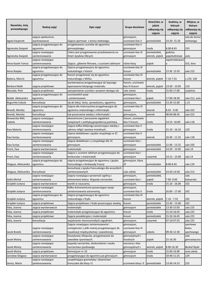 Nazwisko, imię prowadzącego Rodzaj zajęć Opis zajęć Grupa docelowa Dzień/dni, w jakich odbywają się zajęcia Godziny, w Miejsce, w których którym odbywają się odbywają się zajęcia zajęcia sala do tenisa 14.20- 15.20 stołowego sportowe z tenisa stołowego. Zajęcia są przeprowadzane w klasie 2C i służą przygotowaniu uczniów do egzaminu gimnazjalnego. Celem jest przygotowanie przedstawienia na Dzień Języków Obcych. uczniowie klas I gimnazjum, uczniowie klas II uczniowie klas II gimnazjum uczniowie klas III gimnazjum różne klasy uczniowie klas III liceum uczniowie klas III liceum uczniowie klas II liceum, uczniowie klas III liceum piątek 8.00-8.45 233 godziny popołudniowe w zalezności od aula zapotrzebowani a 315, kino poniedziałek 13 30 15 05 sala 223 wtorek, piątek 7.10-7.55 s.129, 130 Badura, Marcin zajęcia opiekuńczowychowawcze zajęcia przygotowujące do egzaminu zajęcia rozwijające zainteresowania zajęcia rozwijające zainteresowania zajęcia przygotowujące do egzaminu zajęcia przygotowujące do egzaminu Barbara Malik zajęcia projektowe Zajęcia , głównie filmowe, z uczniami zdolnymi Zajecia przygotowujace do egzaminu matutalnego z historii Zajęcia mają pomóc chętnym uczniom klas 3 liceum przygotować się do egzaminu maturalnego -z zajęcia WOSu.dydaktyczno Matematyka wyrównawcze przygotowujące do lepszego opanowania bieżącego materiału Celem spotkań Klubu Szkoły Humanitarnej jest wtorek, piątek 13:30 - 15:05 Biesiada, Piotr zajęcia projektowe zajęcia przygotowujące do egzaminu zaznajomienie uczniów zpozwalające prawem dostępu do Zajęcia koła teatralnego na rozwój uczniowskich pasji iuczniowie zainteresowań. mający trudności z przygotowaniem cała szkołaklas III uczniowie gimnazjum, uczniowie klas III środa 15.00-17.00 119 s. 128.1, czytelnia piątek 17:00-18:30 sala 312, aula konsultacje zajęcia przygotowujące do egzaminu się do lekcji, testu, sprawdzianu, egzaminu Zajęcia dla maturzystów przygotowujące do egzaminu maturalnegouzupełnienie z informatyki zajęcia umożliwiające zaległości gimnazjum, uczniowie klas III liceum uczniowie klas II poniedziałek 13.30-15.00 s.15 wtorek 8.45 - 9.40 sala 323 konsultacje zajęcia rozwijające zainteresowania zajęcia rozwijające zainteresowania zajęcia rozwijające zainteresowania zajęcia rozwijające zainteresowania lub poszerzenie wiedzy z informatyki podstawy przedsiębiorczościkółko i ekonomiczne ( poruszanie zagadnień związanych z polityką gospodarczą państwa, Zajęcia kółka biblijnego poszerzające wiedzę z zakresu religii i postaw moralnych. Zajecia dodatkowe z języka rosyjskiego w 2C gimnazjum. Zajęcia dodatkowe z j.rosyjskiego dla 1C gimnazjum zajęcia wyrównawcze z bieżącego materiału z gimnazjum,klas I uczniowie liceum, uczniowie klas II liceum, uczniowie klas II gimnazjum uczniowie klas II gimnazjum uczniowie klas I gimnazjum uczniowie klas I wtorek 08:00-08.45 sala 323 środa 14:15- 16:00 sala 118 środa 15.10 - 16.10 120 wtorek 10.40 - 11.25 sala 118 poniedziałek 12.40 - 13.25 sala 103 matematyki Zajęcia z uczniem zdolnym przygotowujące do konkursów z matematyki zajęcia przygotowujące do egzaminu z języka francuskiego z Ambasady Francji konsultacje z języka francuskiego dla wszystkich zainteresowanych Zajęcia rozwijająca sprawność ogólną z elementami boksu. Wyjazdy Zajęcia wyrównawcze z fizykinarciarskie. poprawiające gimnazjum uczniowie klas I gimnazjumklas II uczniowie gimnazjum, klasa 2F poniedziałek 14:20 - 15:05 sala 14 czwartek 14:15 - 15:00 sala 14 poniedziałek 8:00-8.45 sala 129 cała szkołaklas II uczniowie gimnazjum, uczniowie klas I poniedziałek poniedziałek, piątek 14:20-14:58 7 00- 8 00 sala 313 sala bokserska wyniki w nauczaniu. Kółko Astronomiczne poszerzające swoje zainteresowania astronomią. Zajęcia przygotowujące do egzaminu maturalnego z fizyki. gimnazjum,klas I uczniowie gimnazjum, uczniowie klas II uczniowie klas III liceum uczniowie klas II środa 15.10 - 16.00 102 środa 16.00 - 17.00 102 Grajdek Justyna zajęcia wyrównawcze zajęcia rozwijające zainteresowania zajęcia przygotowujące do egzaminu wtorek, piątek 7.10 - 7.55 102 Grajdek Justyna zajęcia projektowe poniedziałek 13.30 - 15.00 102 Ilska, Joanna zajęcia wyrównawcze poniedziałek 13:30-15:05 sala 225 Ilska, Joanna zajęcia projektowe projektowe z-fizyki poszerzające Zajęcia dydaktyczno wyrównawcze z wiedzę. liceum uczniowie klas II matematyki gimnazjumklas III Zajęcia dydaktyczno - wyrównawcze z uczniowie matematyki przygotowujące do egzaminu liceum uczniowie klas II środa 15:10-16:45 sala 225 Ilska, Joanna zajęcia projektowe poniedziałek poniedziałek, czwartek sala 225 konsultacje liceum uczniowie klas II gimnazjum,klas I uczniowie gimnazjum, uczniowie klas III gimnazjum klas reprezentacja gimnazjalnych i licealnych grupa chętnych narciarzy z klas gimnazjalnych uczniowie klas iII 15:10-16:45 Ilska, Joanna Zajęcia pozalekcyjne z matematyki Konsultacje z matematyki mające na celu wyjaśnianie niezrozumiałych zagadnień, Zajęcia rozwijające zainteresowania i umiejętności z piłki nożnej przygotowujące do rywalizacji międzyszkolnej i zawodniczej. Zajęcia szkolnego koła sportowego z piłki koszykowej chłopców, przygotowanie do zawodów sportowych. wyjazdy narciarskie, doskonalenie i nauka narciarstwa zjazdowego Projekt historia klas sportowych pływackich w 07:10-07:55 sobota 09:30-12:30 piątek 15-16.30 sala 225 boisko sportowe klubu sportowego sala gimnastyczna wtorek, piątek 8.00-16.30 Beskid Śląski Gimnazjum nr 10 zajęcia wyrównawcze z języka niemieckiego przygotowujące do zainteresowania egzaminu po gimnazjum. Zajęcia rozwijające i uzupełniające gramatykę i słownictwo francuskie dla klasy I E gimnazjum uczniowie klas II gimnazjum środa 15.00-16.00 aula szkoły środa 10:40-11:25 129 13:30-14:15 225 Agata Kasperek Agnieszka Związek Agnieszka Związek Anna Kazek-Tomza Anna Rz