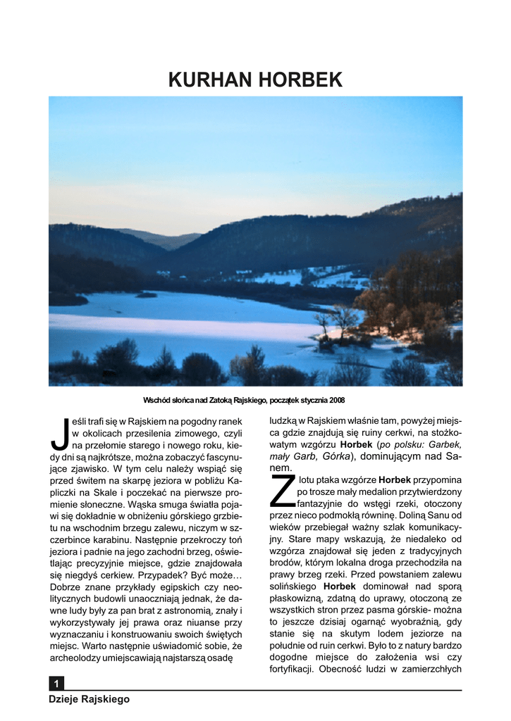 KURHAN HORBEK Wschód słońca nad Zatoką Rajskiego, początek stycznia 2008 eśli trafi się w Rajskiem na pogodny ranek w okolicach przesilenia zimowego, czyli na przełomie starego i nowego roku, kiedy dni są najkrótsze, można zobaczyć fascynujące zjawisko. W tym celu należy wspiąć się przed świtem na skarpę jeziora w pobliżu Kapliczki na Skale i poczekać na pierwsze promienie słoneczne. Wąska smuga światła pojawi się dokładnie w obniżeniu górskiego grzbietu na wschodnim brzegu zalewu, niczym w szczerbince karabinu. Następnie przekroczy toń jeziora i padnie na jego zachodni brzeg, oświetlając precyzyjnie miejsce, gdzie znajdowała się niegdyś cerkiew. Przypadek? Być może… Dobrze znane przykłady egipskich czy neolitycznych budowli unaoczniają jednak, że dawne ludy były za pan brat z astronomią, znały i wykorzystywały jej prawa oraz niuanse przy wyznaczaniu i konstruowaniu swoich świętych miejsc. Warto następnie uświadomić sobie, że archeolodzy umiejscawiają najstarszą osadę J 1 Dzieje Rajskiego ludzką w Rajskiem właśnie tam, powyżej miejsca gdzie znajdują się ruiny cerkwi, na stożkowatym wzgórzu Horbek (po polsku: Garbek, mały Garb, Górka), dominującym nad Sa- nem. Z lotu ptaka wzgórze Horbek przypomina po trosze mały medalion przytwierdzony fantazyjnie do wstęgi rzeki, otoczony przez nieco podmokłą równinę. Doliną Sanu od wieków przebiegał ważny szlak komunikacyjny. Stare mapy wskazują, że niedaleko od wzgórza znajdował się jeden z tradycyjnych brodów, którym lokalna droga przechodziła na prawy brzeg rzeki. Przed powstaniem zalewu solińskiego Horbek dominował nad sporą płaskowizną, zdatną do uprawy, otoczoną ze wszystkich stron przez pasma górskie- można to jeszcze dzisiaj ogarnąć wyobraźnią, gdy stanie się na skutym lodem jeziorze na południe od ruin cerkwi. Było to z natury bardzo dogodne miejsce do założenia wsi czy fortyfikacji. Obecność ludzi w zamierzchłych Kurhan Horbek Wzgórze Horbek współcześnie (2007) czasach na Horbku potwierdzają wykopaliska. Badacze odnaleźli prastarą ceramikę i zabytki z wczesnego średniowiecza, nie ustalili jednak kategorycznie, czy znajdowała się tutaj osada otwarta, czy też niewielkie grodzisko. 1951 r. prace archeologiczno- konserwatorskie nad górnym Sanem prowadził dr Andrzej Żaki. Relacjonując ich wyniki oznajmił o odkryciu nad rzeką, głównie w okolicy Sanoka, „całego łańcucha grodzisk, pochodzących z wczesnego średniowiecza, z początków istnienia Państwa Polskiego”. Była to, jego zdaniem, pozostałość wczesnopolskiego systemu obronnego wzniesionego na ówczesnym pograniczu polsko-ruskim, a znajdujący się kilka kilometrów na północ od Rajskiego Horodek (ruskie określenie gródka) był najbardziej na południe wysuniętym ogniwem w zidentyfikowanym fortecznym łańcuchu. Autor nie wzmiankuje w swojej relacji samego Rajskiego, choć nasze wzgórze Horbek pasuje jak ulał do spisanej przez niego charakterystyki: W Mapa okolic Horbka z zaznaczoną dawną siecią dróg, zabudowaniami i korytem rzeki stateczny werdykt w sprawie grodziska w Rajskim dotychczas nie zapadł. Ustalenia archeologów z połowy XX w. nie budzą dzisiaj zaufania. Opierali się oni bardziej na analizie form powierzchniowych i własnej intuicji, niż na systematycznych wykopaliskach. Zbyt często archeologia w minionym stuleciu dostarczała pseudonaukowych argumentów, uzasadniających post factum decyzje polityczne, dotyczące przebiegu granic czy roszczeń terytorialnych. Przypuszczenia Żakiego o istnieniu niektórych rzekomych grodów w Bieszczadach zostały już negatywnie zweryfikowane.2 Dziś przyjmuje się, że w połowie XI wieku granica między Rusią a Polską przebiegała nie w Bieszczadach, lecz dość daleko na wschód od na linii rzek Wisłoka- Jasiołka.3 Wiele wskazuje na to, że do XIV w. tereny te należały do książąt ruskich i istnienie nad Sanem systemu grodów piastowskich jest mało prawdopodobne. O San, w swym górnym biegu (od źródeł po kolano w okolicy Dynowa) wije się wśród licznych wzgórz, tworząc miejscami przełomy, przypominające najpiękniejsze partie Dunajca w Pieninach. Grodziska, o których tu mowa, położone są na lewym brzegu rzeki (wyjątek stanowi nieznane mi z autopsji grodzisko w Pawłokomie, leżące na prawym brzegu), na znacznych wzniesieniach, posiadających często ponad 100 metrów wysokości względnej. Są one dziś w większości porośnięte lasem i z daeka trudne do rozpoznania, tak, że jedynie nazwy >grodzisko, zagrodzisko<, żyjące w tradycji ludowej lub zanotowane na mapie, naprowadzają na ślady ich istnie- 1 nia. 2 Dzieje Rajskiego Mapa naszkicowana przez A. Żakiego (1951) Kurhan Horbek N ie zmienia to faktu, że Horbek z uwagi na swoją topografię to lokalizacja wymarzona na niewielką ludzką osadę i musiano to zauważyć już w zamierzchłych czasach. W przeszłości miejsce to nazywano podobno Kurhanem4, więc mogło pełnić także jakieś ważne funkcje kultowe. Cerkiew murowana stanęła na skraju Horbka na miejscu dawnej drewnianej, wzmiankowanej już w XV w., a ta, być może, zastąpiła jakąś wcześniejszą świątynię. Budowle sakralne,nawet te niewie- lkie, mają podobną niektórym roślinom właściwość głębokiego zakorzeniania się i odrastania po zniszczeniu w tym samym miejscu, na gruzach poprzedniczek. Można to zaobserwować w naszych czasach w Sakowczyku, gdzie na śladzie zniszczonej w latach 60 XX w. Kamiennej kaplicy krok po kroku odbudowywania jest przez miejscowych nowa. Nie jest zatem wykluczone, że malowniczy Horbek, dokładniej przebadany, opowie jeszcze niejedną ciekawą historię o zamierzchłej przeszłości Rajskiego. Przypisy: 1. Żaki A., Mapa archeologiczna powiatu sanockiego i leskiego, „Sprawozdania PAU”, 1951, nr 10; Grodziska nad górnym Sanem. Z najnowszych badań w województwie rzeszowskim, „Z Otchłani Wieków