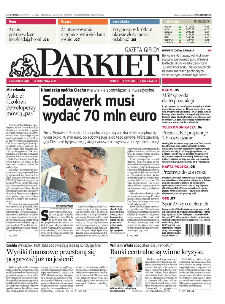 cena 4.50 zł (w tym 7% VAT) nr 182 (4006) INDEKS 348422 ISSN 1231-2207 WYDANIE I/II firmy REDAKTOR PROWADZĄCY: WOJCIECH ZIELIŃSKI gospodarka finanse Arcus: pokrzywdzeni nie składają broni Zainteresowanie zagranicznymi giełdami rośnie .07 .06 www.parkiet.com aktualne notowania na stronie 07.08.2009 notowania Prognozy: w krótkim okresie złoty może osłabnąć .08 GAZETA GIEŁDY WIG20 DJIA Nasdaq FT-SE DAX USD/PLN EUR/PLN godzina 22.00 zmiana (proc.) 2116,05 9370,07 2000,25 4731,56 5458,96 2,8964 4,1054 +1,95 +1,23 +1,37 +0,87 +1,66 +0,03 -1,12 BUFFETT ZNÓW ZARABIA .09 Berkshire Hathaway, wehikuł inwestycyjny giełdowego guru Warrena Buffetta, drugi kwartał zakończył 3,3 mld USD zysku. Najwięcej zarobił na instrumentach pochodnych. W pierwszym kwartale była strata. PONIEDZIAŁEK > 10 SIERPNIA 2009 Mieszkania Aukcje? Czołowi deweloperzy mówią „pas” Colliers International, międzynarodowa firma doradcza działająca od stu lat na rynku nieruchomości (od 12 lat w Polsce) zamierza jesienią przeprowadzić pierwszą w naszym kraju profesjonalną aukcję mieszkań. Przedsięwzięcie, które już przykuło uwagę mediów, zamiast hitem może jednak okazać się niewypałem. Tak przynajmniej wynika ze sceptycznej postawy ankietowanych przez „Parkiet” czołowych deweloperów z GPW. Twierdzą, że nie wystawią swoich mieszkań na licytację. Dlaczego? Niektórzy po prostu nie wierzą, że pomysł, który sprawdził się m.in. w Stanach Zjednoczonych, Kanadzie i Wielkiej Brytanii, przyjmie się też nad Wisłą. Inni przekonani są o skuteczności własnej polityki sprzedażowej. Twierdzą, że na udział w aukcji mogą zdecydować się firmy w trudnej sytuacji, gotowe sprzedać lokale poniżej kosztów ich wybudowania. Nie wszyscy skazują jednak ten projekt na porażkę, choć na razie wolą stać z boku. Jeśli natomiast pierwsze aukcje nieruchomości zakończą się sukcesem, rozważą wdrożenie tej formy sprzedaży. Na takich m.in. klientów czeka właśnie organizator aukcji. Twierdzi, że znalazł już kilku chętnych. Jakich? KMW Tego nie ujawnia. WIĘCEJ .04 FIRMY > FINANSE > GOSPODARKA Niemiecka spółka Ciechu ma wielkie zobowiązania inwestycyjne Sodawerk musi wydać 70 mln euro KGHM .05 MSP sprzeda do 10 proc. akcji Rząd zamierza utrzymać pakiet kontrolny w KGHM i sprzedać nie więcej niż 10 proc. akcji spółki – wynika z wypowiedzi udzielonej TVN 24 przez Michała Boniego, szefa Komitetu Stałego Rady Ministrów. Obecnie udział Skarbu Państwa w miedziowej spółce wynosi 41,8 proc. O sprzedaży walorów będzie debatować we wtorek Rada Ministrów. TELEKOMUNIKACJA .06 Firma Sodawerk Stassfurt kupi położoną po sąsiedzku elektrociepłownię. Wyda około 70 mln euro, bo zobowiązuje ją do tego umowa, którą zawarła, gdy Ciech nie był jeszcze jej akcjonariuszem – wynika z naszych informacji Bartłomiej Mayer S [email protected] odawerk Stassfurt należy do grupy Ciechu od końca 2007 r. Wtedy to za 75 mln euro, polska grupa chemiczna kupiła pakiet 90 proc. akcji producenta sody z Niemiec. Była to sztandarowa akwizycja Ciechu, z czasów, gdy prezesem spółki był Mirosław Kochalski. Analitycy od początku krytykowali przejęcie za zbyt wysoką, ich zdaniem, cenę. Z czasem okazywało się, że problemów jest więcej. Chociaż to Ciech był większościowym akcjonariuszem, to faktyczną kontrolę nad firmą sprawował jej prezes Jochen Ohm, posiadacz zaledwie kilka proc. akcji. Spółka Sodawerk miała pozawierane długoterminowe kontrakty, które Mirosław Kochalski, były prezes Ciechu uważa, że zakup niemieckiej spółki był przeprowadziony profesjonalnie i przejrzyście. okazywały się korzystniejsze dla jej kontrahentów, niż dla niej samej. Teraz na światło dzienne wychodzi kolejna sprawa. Choć – jak wynika z naszych danych – zobowiązanie do kupienia elektrociepłowni istaniało już wtedy, gdy Ciech kupował Sodawerk Stassfurt, akcjonariusze giełdowej firmy nie zostali o tym poinformowani. W komunikatach spółki nie znajdujemy wzmianki na ten temat. Nic więc dziwnego, że – jak się dowiedzieliśmy – sprawą zajęły się wewnętrzne służby audytowe Ciechu. Mirosław Kochalski nie chciał skomentować sprawy. Przekonywał jednak, że zakup niemieckiej firmy był przeprowadzony w nalezyty sposób. Kwestii zobowiązań inwestycynych Sodawerk Stassfurt nie wyjaśniono nam także w samym Ciechu. Krzysztof Grad, rzecznik prasowy spółki, powiedział, że na zebranie niezbędznych informacji potrzebuje czasu. Odpowiedzi na pytania dotyczące niemieckiej firmy mamy otrzymać w tym tygodniu. FOT. M. PSTRĄGOWSKA WIĘCEJ .03 Prezes UKE proponuje TP rozwiązanie Według Macieja Wituckiego, prezesa Telekomunikacji Polskiej, jeśli spółka spełniłaby ostatni, dwudziesty warunek operatorów alternatywnych, aby uchronić się przed decyzją o podziale, to... z własnej woli by mu się poddała. Anna Streżyńska, prezes Urzędu Komunikacji Elektronicznej, jest przywiązana do tego warunku, ale przyznaje Wituckiemu rację. I rozmawia z TP o rozwiązaniu. NAFTA POLSKA .05 Przetrwa do 2011 roku Decyzja o likwidacji Nafty Polskiej ma zapaść jeszcze przed końcem tego roku, najpewniej w listopadzie. Nie oznacza to jednak, że zaraz potem spółka przestanie istnieć. – Na to, aby fizycznie zlikwidować Naftę Polską, potrzebnych będzie jeszcze 400 kolejnych dni – powiedział nam Maciej Wewiór, rzecznik prasowy MSP. OFE .07 Spór Avivy o nieletnich Osoby poniżej 18 roku życia nie mogą samodzielnie zapisać się do funduszu emerytalnego. Potrzebują zgody rodziców. Takie jest stanowisko KNF. Jedynym PTE, które ma inne zdanie i zapisuje nieletnich bez zgody rodziców, jest Aviva PTE. Jak dowiedział się „Parkiet” spór ma teraz rozstrzygnąć resort pracy. Ale raczej poprze stanowisko komisji nadzoru. W.Z. Giełda Wskaźniki PMI i ISM zapowiadają lepszą kondycję firm William White specjalnie dla „Parkiet