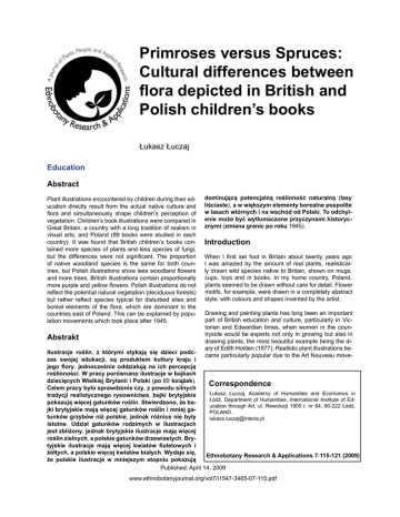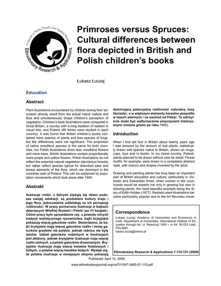 Primroses versus Spruces: Cultural differences between flora depicted in British and Polish children’s books Łukasz Łuczaj Education Abstract Plant illustrations encountered by children during their education directly result from the actual native culture and flora and simultaneously shape children’s perception of vegetation. Children’s book illustrations were compared in Great Britain, a country with a long tradition of realism in visual arts, and Poland (89 books were studied in each country). It was found that British children’s books contained more species of plants and less species of fungi, but the differences were not significant. The proportion of native woodland species is the same for both countries, but Polish illustrations show less woodland flowers and more trees. British illustrations contain proportionally more purple and yellow flowers. Polish illustrations do not reflect the potential natural vegetation (deciduous forests) but rather reflect species typical for disturbed sites and boreal elements of the flora, which are dominant in the countries east of Poland. This can be explained by population movements which took place after 1945. Abstrakt dominującą potencjalną roślinność naturalną (lasy liściaste), a w większym elementy borealne pospolite w lasach wtórnych i na wschód od Polski. To odchylenie może być wytłumaczone przyczynami historycznymi (zmiana granic po roku 1945). Introduction When I first set foot in Britain about twenty years ago I was amazed by the amount of real plants, realistically drawn wild species native to Britain, shown on mugs, cups, toys and in books. In my home country, Poland, plants seemed to be drawn without care for detail. Flower motifs, for example, were drawn in a completely abstract style, with colours and shapes invented by the artist. Drawing and painting plants has long been an important part of British education and culture, particularly in Victorian and Edwardian times, when women in the countryside would be experts not only in growing but also in drawing plants, the most beautiful example being the diary of Edith Holden (1977). Realistic plant illustrations became particularly popular due to the Art Nouveau move- Ilustracje roślin, z którymi stykają się dzieci podczas swojej edukacji, są produktem kultury kraju i jego flory, jednocześnie oddziałują na ich percepcję roślinności. W pracy porównano ilustracje w bajkach dziecięcych Wielkiej Brytanii i Polski (po 89 książek). Correspondence Celem pracy było sprawdzenie czy, z powodu silnych Łukasz Łuczaj, Academy of Humanities and Economics in tradycji realistycznego rysownictwa, bajki brytyjskie Łódź, Department of Humanities, International Institute of Edpokazują więcej gatunków roślin. Stwierdzono, że baucation through Art, ul. Rewolucji 1905 r. nr 64, 90-222 Łódź, jki brytyjskie mają więcej gatunków roślin i mniej gaPOLAND. tunków grzybów niż polskie, jednak różnice nie były [email protected] istotne. Udział gatunków rodzimych w ilustracjach jest zbliżony, jednak brytyjskie ilustracje mają więcej roślin zielnych, a polskie gatunków drzewiastych. Brytyjskie ilustracje mają więcej kwiatów fioletowych i żółtych, a polskie więcej kwiatów białych. Wydaje się, Ethnobotany Research & Applications 7:115-121 (2009) że polskie ilustracje w mniejszym stopniu pokazują Published: April 14, 2009 www.ethnobotanyjournal.org/vol7/i1547-3465-07-115.pdf 116 Ethnobotany Research & Applications ment, which was initiated in Britain by the Arts and Crafts movement and is characterised by organic, especially floral, and other plant-inspired motifs, as well as highly-stylised, flowing curvilinear forms (Duncan 1994). The fruits of these times are such classic illustrated children’s books as the works of Beatrix Potter, published between 1901 and 1930, and the Flower Fairies series by Cicely Mary Barker, published between 1923 and 1948. However the tradition of realistic representation of flowers in British art was already strong earlier, e.g. in the mid-19th century, among Pre-Raphaelites (des Cars 2000, Mancoff 2003). Some children’s books published in the second half of the 20th century are also masterpieces of botanical illustration. Here we should mention the series of books by Molly Brett, e.g., Good Night Time Tales (1982) or Flip Flop’s Secret (1962), and Blyton’s Treasury of Verse (1979). In contrast to Britain, where the legacy of Victorian and Edwardian decorative arts is omnipresent, the Polish version of Art Nouveau – Młoda Polska – left few realistic plant decorations except for exquisite realistic stainedglass windows depicting wild flowers in the Franciscan Church in Cracow (Zbijewska 1986). In Poland there was also very little interest in the history of plant motifs in art with the exception of the book by Szafer and Szaferowa (1958), in contrast to the wide interest in the art of botanical illustration in Britain (Blunt 1967). Although a few children’s books containing rich botanical illustrations were published in Poland, e.g., the Razem ze Słonkiem series written by Maria Kownacka (1975) and illustrated by Zbigniew Rychlicki and Jerzy Heintze, as well as books by Włodzimierz Scisłowski (1986, 1987), they never achieved such a place in national culture as Potter’s and Barker’s books in Britain. Art is often a good source of information about culture. Obviously plant illustrations reflect local habitats, but there is usually some cultural filter which causes only certain plants to be shown. The plants chosen are often those which are more useful (e.g., maize in South America, dates in Egypt) or those which are regarded as most beautiful (e.g., lotus, bamboo, plum and peach blossom, and peony – in China) or plants associated with religion (e.g., the grapevine in Christianity). These emphasised plants become known by the community, commonly recognised, and easy for children to learn. On th