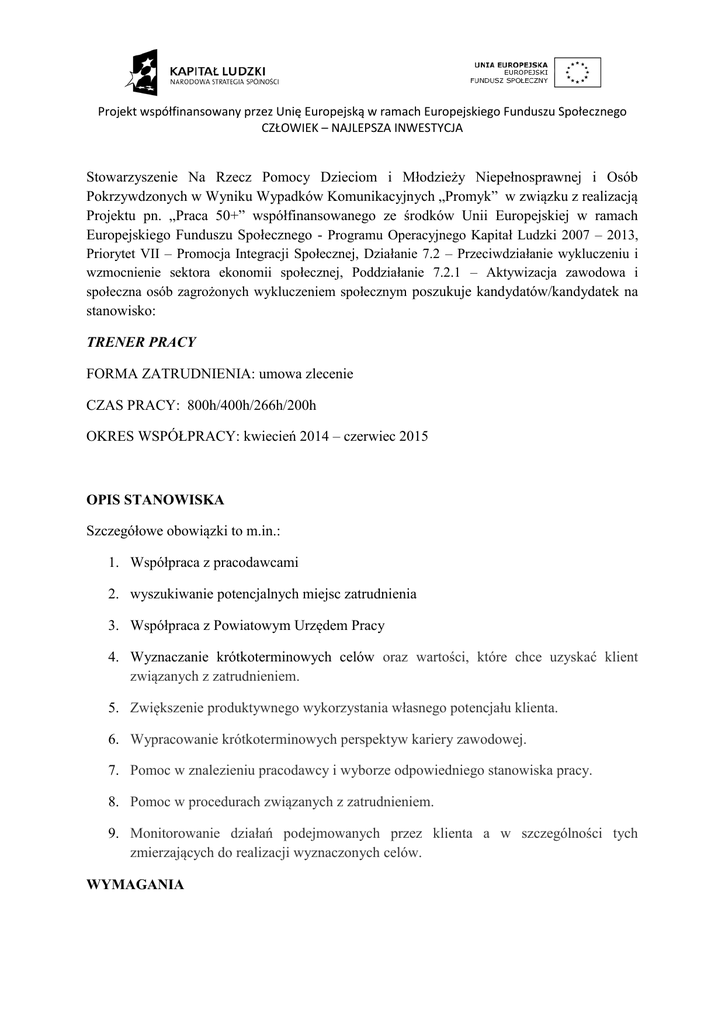 Projekt współfinansowany przez Unię Europejską w ramach Europejskiego Funduszu Społecznego CZŁOWIEK – NAJLEPSZA INWESTYCJA Stowarzyszenie Na Rzecz Pomocy Dzieciom i Młodzieży Niepełnosprawnej i Osób Pokrzywdzonych w Wyniku Wypadków Komunikacyjnych „Promyk” w związku z realizacją Projektu pn. „Praca 50+” współfinansowanego ze środków Unii Europejskiej w ramach Europejskiego Funduszu Społecznego - Programu Operacyjnego Kapitał Ludzki 2007 – 2013, Priorytet VII – Promocja Integracji Społecznej, Działanie 7.2 – Przeciwdziałanie wykluczeniu i wzmocnienie sektora ekonomii społecznej, Poddziałanie 7.2.1 – Aktywizacja zawodowa i społeczna osób zagrożonych wykluczeniem społecznym poszukuje kandydatów/kandydatek na stanowisko: TRENER PRACY FORMA ZATRUDNIENIA: umowa zlecenie CZAS PRACY: 800h/400h/266h/200h OKRES WSPÓŁPRACY: kwiecień 2014 – czerwiec 2015 OPIS STANOWISKA Szczegółowe obowiązki to m.in.: 1. Współpraca z pracodawcami 2. wyszukiwanie potencjalnych miejsc zatrudnienia 3. Współpraca z Powiatowym Urzędem Pracy 4. Wyznaczanie krótkoterminowych celów oraz wartości, które chce uzyskać klient związanych z zatrudnieniem. 5. Zwiększenie produktywnego wykorzystania własnego potencjału klienta. 6. Wypracowanie krótkoterminowych perspektyw kariery zawodowej. 7. Pomoc w znalezieniu pracodawcy i wyborze odpowiedniego stanowiska pracy. 8. Pomoc w procedurach związanych z zatrudnieniem. 9. Monitorowanie działań podejmowanych przez klienta a w szczególności tych zmierzających do realizacji wyznaczonych celów. WYMAGANIA Projekt współfinansowany przez Unię Europejską w ramach Europejskiego Funduszu Społecznego CZŁOWIEK – NAJLEPSZA INWESTYCJA 1. Wykształcenie wyższe (dyplom magistra psychologii, trener pracy, doradca zawodowy, coach) 2. Minimum czteroletnie doświadczenie w pracy na podobnym stanowisku (znajomość problematyki osób zagrożonych wykluczeniem społecznym z powodu bezrobocia, niepełnosprawości). 3. Znajomość problematyki projektów unijnych i/lub krajowych. 4. Obsługa komputera, w tym min. podstawy pakietu Office. 5. Posiadanie własnych narzędzi badawczych. 6. Zaangażowanie, otwartość, samodzielność, empatia. 7. Umiejętność pracy w zespole. SKŁADANIE OFERT I PROCES REKRUTACJI 1. Aplikacje prosimy składać w biurze projektu, 12-100 Szczytno, ul. Pasymska 21A do dn. 21.05.2013r., w g. 8:00-15:00, 2. Aplikacja powinna zawierać: a. CV kandydata/kandydatki b. Kserokopie dokumentów potwierdzających doświadczenie zawodowe c. Zapis w CV: „Wyrażam zgodę na przetwarzanie moich danych osobowych zawartych w mojej ofercie dla potrzeb niezbędnych do realizacji procesu rekrutacji (zgodnie z ustawą z 29.08.97 r. O ochronie danych osobowych, Dz. U. nr 133, poz. 833 z późn. zm.)”