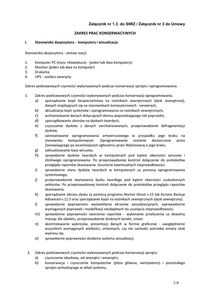 Załącznik nr 1.3. do SIWZ / Załącznik nr 3 do Umowy ZAKRES PRAC KONSERWACYJNYCH I. Stanowisko dyspozytora - komputery i wizualizacja Stanowisko dyspozytora - zestaw stacji: 1. 2. 3. 4. Komputer PC (mysz +klawiatura) - (jeden lub dwa komputery) Monitor (jeden lub dwa na komputer) Drukarka UPS - zasilacz awaryjny Zakres podstawowych czynności wykonywanych podczas konserwacji sprzętu i oprogramowania. 1. 2. Zakres podstawowych czynności wykonywanych podczas konserwacji oprogramowania. a) sporządzanie kopii bezpieczeństwa na nośnikach zewnętrznych (dysk zewnętrzny), danych znajdujących się na stanowiskach komputerowych - serwerach, b) aktualizacja kopii systemów i oprogramowania na nośnikach zewnętrznych, c) archiwizowanie danych dotyczących okresu poprzedzającego rok poprzedni, d) uporządkowanie zbiorów na dyskach twardych, e) czyszczenie dysków z danych zarchiwizowanych, przeprowadzenie defragmentacji dysków, f) zainstalowanie oprogramowania antywirusowego w przypadku jego braku na stanowisku komputerowym. Oprogramowanie zostanie dostarczone przez Zamawiającego po wcześniejszym zgłoszeniu przez Wykonawcę o jego braku. g) zaktualizowanie bazy wirusów, h) sprawdzenie dysków twardych w komputerach pod kątem obecności wirusów i złośliwego oprogramowania. Po przeprowadzonej kontroli dołączenie do protokołów przeglądu raportów skanowania. Usuniecie ewentualnych nieprawidłowości. i) sprawdzenie stanu dysków twardych w komputerach za pomocą oprogramowania systemowego, j) przeprowadzenie skanowania dysku twardego pod kątem obecności uszkodzonych sektorów. Po przeprowadzonej kontroli dołączenie do protokołów przeglądu raportów skanowania. k) sporządzanie obrazu dysku za pomocą programu Norton Ghost v.15 lub Acronis Backup Advanced v.11.5 oraz sporządzanie kopii na nośnikach zewnętrznych (dysk zewnętrzny). l) sprawdzenie poprawności wyświetlania ekranów wizualizacyjnych, wprowadzenie wymaganych poprawek i modyfikacji niezbędnych do usunięcia nieprawidłowości. m) sprawdzenie poprawności tworzenia raportów - wykonanie przeliczenia za dowolny miesiąc dla obiektu, przeprowadzenie drobnych korekt, zmian. n) skontrolowanie wykresów, prezentacji danych w formie graficznej - uwzględnienie wszystkich wymaganych wielkości, zmiennych, czy nie zachodzi potrzeba zmiany skali wykresu itp. o) sprawdzenie poprawności działania systemu wizualizacji. Zakres podstawowych czynności wykonywanych podczas konserwacji sprzętu: a) czyszczenie obudowy, od zewnątrz i wewnątrz, b) konserwacja i czyszczenie komputerów (płyta główna, wentylatory) i pozostałego sprzętu wchodzącego w skład systemu, 1/4 c) d) e) f) g) h) 3. 4. 5. odkurzenie wnętrz urządzeń, usunięcie kurzu i zanieczyszczeń z elementów elektronicznych oraz przewodów połączeniowych oraz znajdujących się elementów z uwzględnieniem zespołów zasilających, zasilaczy i wentylatorów, czyszczenie klawiatury, myszy, czyszczenie ekranu monitora, przeprowadzenie niezbędnych regulacji, zabezpieczenie mechanizmów środkami wskazanymi przez producenta danego typu urządzenia (np. drukarek), kontrola elementów zestawu i w miarę potrzeb – czyszczenie połączeń w konserwowanym urządzeniu: – sprawdzenie skuteczności chłodzenia podzespołów - pracy wentylatorów – wymiana niesprawnych, – czyszczenie napędów (CD/DVD, HDD), – testowanie podstawowych podzespołów po konserwacji. sprawdzenie poprawnej pracy awaryjnych zasilaczy napięcia UPS, przeprowadzenie przeglądu urządzenia, w razie konieczności wymiana baterii, kalibracja po wymianie baterii, testowanie po konserwacji, wykonanie testów zasilacza awaryjnego UPS-u chroniącego system. W razie zużycia wymiana baterii, kalibracja zasilacza. Opracowanie wyników pomiarów i sporządzenie protokołów - dokumentacji z przeprowadzenia prac konserwacyjnych i przekazanie jej Kierownikowi obiektu. Przekazanie kopii zapasowych systemu i projektu wizualizacji kopalni, na której wykonywany był przegląd Kierownikowi obiektu oraz do Działu Elektrycznego i Automatyki. Dokumentacja z przeprowadzenia prac konserwacyjnych (bez formy papierowej) w formie elektronicznej (PDF) wykonanej w formie umożliwiającej wyszukiwanie tekstu wraz duplikatem haseł winna być dostarczona również do Działu Elektrycznego i Automatyki PGNiG SA w W-wie Oddział w Sanoku. Szczegółowy wykaz urządzeń AKPiA na obiektach zawiera załącznik nr 2. II. System sterowania i zasilanie – sterowniki, szafy sterownicze, tablice synoptyczne, UPS-y. – Zakres prac wykonywanych w ramach przeglądów okresowych Przeglądy konserwacyjne wykonywane będą zgodnie z harmonogramem i obejmują wszystkie lokalizacje systemu. Do zakresu prac należy: 1. Wykonanie kopii zapasowych całego systemu (układu sterowania) i danych archiwalnych. Sprawdzenie poprawności kopii bezpieczeństwa. 2. Sprawdzenie sprzętu i oprogramowania sterownika i wizualizacji pod względem sprawności i warunków eksploatacji. Usunięcie ewentualnych problemów. 3. Sprawdzenie poprawności pracy sterownika: a) archiwizacja całości oprogramowania przed przystąpieniem do prac b) konserwacja elementów, złącz i zacisków, c) czyszczenie filtra powietrza, odkurzenie modułów i przemycie ich obudów, d) wymiana baterii podtrzymującej pamięć sterownika PLC, e) sprawdzenie kart wejściowych i wyjściowych analogowych i cyfrowych, f) sprawdzenie pomiarów wchodzących do systemu, g) sprawdzenie urządzeń transmisji danych, h) sprawdzanie poprawności transmisji danych, i) sprawdzenie zużycia energii poszczególnych elementów systemu. 2/4 4. 5. 6. 7. 8. 9. 10. 11. 12. 13. 14. 15. 16. 17. 18. 19. 20. 21. Optymalizacja systemów w zakresie funkcjonalności - wykonanie drobnych modyfikacji systemu na życzenie Zleceniodawcy. Wykonanie testów zasilacza awaryjnego UPS-u chroniącego system. W razie zużycia wymiana baterii, kalibracja zasilacza. Sprawdzenie zabezpieczeń, wył