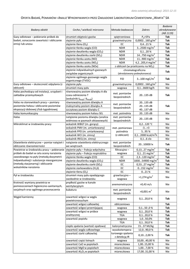 data ostatniej aktualizacji: 2015-12-15 OFERTA BADAŃ, POMIARÓW I ANALIZ WYKONYWANYCH PRZEZ ZAKŁADOWE LABORATORIUM CEMENTOWNI „WARTA” SA Badany obiekt Cecha / wielkość mierzona Gazy odlotowe – pobieranie próbek do badań, oznaczanie zawartości i obliczanie emisji lub unosu strumień objętości gazów stężenie pyłu stężenie tlenu (O2) stężenie tlenku węgla (CO) stężenie dwutlenku węgla (CO2) stężenie dwutlenku siarki (SO2) stężenie tlenku azotu (NO) stężenie tlenku azotu (NO2) stężenie tlenku azotu (NOx) stężenie indywidualnych gazowych związków organicznych stężenie ogólnego gazowego węgla organicznego (TVOC) Gazy odlotowe – skuteczność odpylania (z stężenie pyłu obliczeń) strumień masy pyłu Hałas pochodzący od instalacji, urządzeń i równoważny poziom dźwięku A dla zakładów przemysłowych czasu odniesienia T (wskaźniki LAeqD i LAeqN) Hałas na stanowiskach pracy – pomiary równoważny poziom dźwięku A poziomów hałasu i obliczanie poziomów maksymalny poziom dźwięku A ekspozycji dobowej i/lub tygodniowej szczytowy poziom dźwięku C Hałas komunikacyjny równoważny poziom hałasu SEL Hałas natężenie poziomu dźwięku (analiza widmowa w pasmach oktawowych) Mikroklimat w środowisku pracy wskaźnik WBGT (m. gorący) wskaźnik PMV (m. umiarkowany) wskaźnik PPD (m. umiarkowany) wskaźnik WCI (m. zimny) wskaźnik IREQ (m. zimny) Oświetlenie elektryczne – pomiar natężeń i natężenie oświetlenia elektrycznego obliczanie równomierności we wnętrzach Powietrze w środowisku pracy – pobieranie stężenie pyłu – frakcja wdychalna próbek do badań w celu oceny narażenia stężenie pyłu – frakcja respirabilna zawodowego na pyły (metodą dozymetrii stężenie tlenku węgla (CO) indywidualnej) i substancje nieorganiczne stężenie dwutlenku węgla (CO2) (metodą stacjonarną) i obliczanie stężenie dwutlenku siarki (SO2) wskaźników narażenia stężenie siarkowodoru (H2S) stężenie tlenu (O2) Pył w środowisku strumień masy pyłu opadającego swobodnie w środowisku Krotność wymiany powietrza w prędkość gazów w kanale pomieszczeniach higieniczno-sanitarnych, wentylacyjnym socjalnych oraz ogólnego przeznaczenia kubatura Węgiel kamienny zawartość wilgoci w węglu powietrznosuchym zawartość wilgoci całkowitej zawartość wilgoci przemijającej zawartość wilgoci w próbce analitycznej zawartość popiołu ciepło spalania (wartość opałowa) zawartość węgla całkowitego zawartość siarki całkowitej zawartość części lotnych zawartość CaO w popiołach zawartość MgO w popiołach zawartość Al2O3 w popiołach Metoda badawcza Zakres spiętrzeniowa Pd>5Pa 3 grawimetryczna 0,0002…160 g/m EC 0,4…21 % 3 NDIR 3…2500 mg/m NDIR 0,1…20 % 3 NDIR 14…750 mg/m 3 NDIR 11…900 mg/m 3 NDIR 4,2…205,4 mg/m z obliczeń (w przeliczeniu na NO2) chromatograficzna (akredytowany podwykonawca) FID 3…100 mgC/m 3 grawimetryczna wagowa 0,0002…160 g/m 0,1…3600 kg/h met. pomiarów bezpośrednich 20…135 dB met. pomiarów bezpośrednich met. pośrednia met. pomiarów bezpośrednich Badanie akredytowane (AB 1119) Tak Tak Tak Tak Tak Tak Tak Tak Tak Tak Tak 3 20…135 dB 20…135 dB 40…137 dB 20…135 dB 20…135 dB 0,2…120 °C -3…+3 met. pomiarowa pośrednia 5…95 % 2 (z obliczeń) 0,1…2000 kcal/m h 0,1…6 clo met. pomiarów 20…10000 lx bezpośrednich 3 0,13…27 mg/m filtracyjno – 3 wagowa 0,1…21 mg/m 3 EC 2,3…120 mg/m 3 NDIR 1830…54900 mg/m 3 EC 0,53…27 mg/m 3 EC 0…152 mg/m EC 0…21 % grawitacyjno – 2 >1,274 g/m wagowa Nie Nie Tak Tak Nie Nie Nie Nie Nie Nie Nie Tak Tak Tak Tak Tak Tak Nie Nie Nie anemometryczna >0,43 m/s Nie met. pomiarów bezpośrednich >0,001 m 3 Nie wagowa 0,1…20,0 % Tak 0,1…50 ,0 % 0,1…20,0 % 0,1…20,0 % 1,0…50,0% 0,1…50,0 % 15…37 MJ/kg 12,0…90,0 % Tak Tak Tak Tak Tak Tak Tak Tak 0,10…2,00 % Tak 10,00…40,00 % 1,00..15,00 % 1,00...7,00 % 17,00..31,00 % Nie Nie Nie Nie obliczeniowa wagowa wagowa TGA wagowa TGA kalorymetryczna wysokotemperaturowego spalania z detekcją IR wagowa miareczkowa miareczkowa miareczkowa Popioły lotne energetyczne, łupki powęglowe zawartość Fe2O3 w popiołach zawartość SiO2 w popiołach zawartość SO3 w popiołach zawartość Na2O w popiołach zawartość K2O w popiołach zawartość Cl¯ w popiołach zawartość wilgoci w węglu powietrznosuchym zawartość wilgoci całkowitej zawartość wilgoci przemijającej zawartość wilgoci w próbce analitycznej zawartość popiołu ciepło spalania (wartość opałowa) zawartość węgla całkowitego zawartość siarki całkowitej straty prażenia zawartość CaO zawartość MgO zawartość Al2O3 zawartość Fe2O3 zawartość SiO2 zawartość SO3 zawartość Na2O zawartość K2O zawartość Cl¯ Kamień gipsowy, anhydryt, spoiwa gipsowe zawartość wilgoci Zawartość SiO2 zawartość CaO zawartość MgO zawartość Al2O3 zawartość Fe2O3 zawartość SO3 zawartość wody krystalizacyjnej Kamień wapienny, żużel wielkopiecowy zawartość wilgoci straty prażenia Zawartość SiO2 zawartość CaO zawartość MgO, zawartość Al2O3 zawartość Fe2O3 zawartość SO3 zawartość Na2O zawartość K2O Klinkier portlandzki zawartość Cl¯ zawartość CaO zawartość MgO straty prażenia zawartość SiO2 zawartość Al2O3 zawartość Fe2O3 zawartość SO3 zawartość Na2O zawartość K2O Popioły lotne, surowce glinonośne i żelazonośne zawartość Cl¯ zawartość części nierozpuszczalnych zawartość wilgoci zawartość CaO miareczkowa wagowa wagowa fotometria płomieniowa miareczkowa 3,50..13,00 % 30,00-57,00 % 0,80..7,00 % 0,30..2,00 % 1,50..3,50 % 0,020..0,300 % Nie Nie Nie Nie Nie Nie wagowa 0,1…20,0 % Nie 0,1…50,0 % 0,1…20,0 % 0,1…20,0 % 1,0…50,0 % 0,1…50,0 % 15…37 MJ/kg 12,0…90,0 % Nie Nie Nie Nie Nie Nie Nie Nie 0,10…2,00 % Nie 0,10..50,00 % 1,00..15,00 % 1,00...7,00 % 17,00..31,00 % 3,50..13,00 % 30,00..57,00 % 0,80..7,00 % N