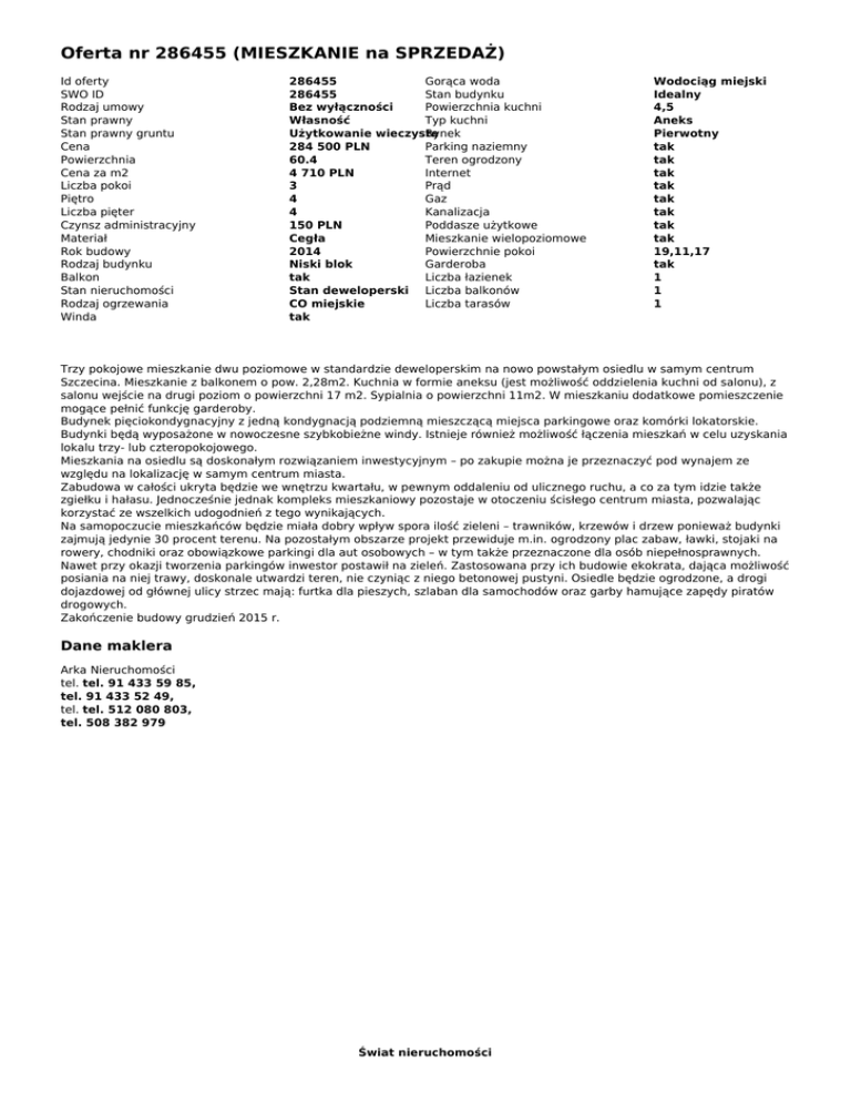 Oferta nr 286455 (MIESZKANIE na SPRZEDAŻ) Id oferty SWO ID Rodzaj umowy Stan prawny Stan prawny gruntu Cena Powierzchnia Cena za m2 Liczba pokoi Piętro Liczba pięter Czynsz administracyjny Materiał Rok budowy Rodzaj budynku Balkon Stan nieruchomości Rodzaj ogrzewania Winda 286455 Gorąca woda 286455 Stan budynku Bez wyłączności Powierzchnia kuchni Własność Typ kuchni Użytkowanie wieczyste Rynek 284 500 PLN Parking naziemny 60.4 Teren ogrodzony 4 710 PLN Internet 3 Prąd 4 Gaz 4 Kanalizacja 150 PLN Poddasze użytkowe Cegła Mieszkanie wielopoziomowe 2014 Powierzchnie pokoi Niski blok Garderoba tak Liczba łazienek Stan deweloperski Liczba balkonów CO miejskie Liczba tarasów tak Wodociąg miejski Idealny 4,5 Aneks Pierwotny tak tak tak tak tak tak tak tak 19,11,17 tak 1 1 1 Trzy pokojowe mieszkanie dwu poziomowe w standardzie deweloperskim na nowo powstałym osiedlu w samym centrum Szczecina. Mieszkanie z balkonem o pow. 2,28m2. Kuchnia w formie aneksu (jest możliwość oddzielenia kuchni od salonu), z salonu wejście na drugi poziom o powierzchni 17 m2. Sypialnia o powierzchni 11m2. W mieszkaniu dodatkowe pomieszczenie mogące pełnić funkcję garderoby. Budynek pięciokondygnacyjny z jedną kondygnacją podziemną mieszczącą miejsca parkingowe oraz komórki lokatorskie. Budynki będą wyposażone w nowoczesne szybkobieżne windy. Istnieje również możliwość łączenia mieszkań w celu uzyskania lokalu trzy- lub czteropokojowego. Mieszkania na osiedlu są doskonałym rozwiązaniem inwestycyjnym – po zakupie można je przeznaczyć pod wynajem ze względu na lokalizację w samym centrum miasta. Zabudowa w całości ukryta będzie we wnętrzu kwartału, w pewnym oddaleniu od ulicznego ruchu, a co za tym idzie także zgiełku i hałasu. Jednocześnie jednak kompleks mieszkaniowy pozostaje w otoczeniu ścisłego centrum miasta, pozwalając korzystać ze wszelkich udogodnień z tego wynikających. Na samopoczucie mieszkańców będzie miała dobry wpływ spora ilość zieleni – trawników, krzewów i drzew ponieważ budynki zajmują jedynie 30 procent terenu. Na pozostałym obszarze projekt przewiduje m.in. ogrodzony plac zabaw, ławki, stojaki na rowery, chodniki oraz obowiązkowe parkingi dla aut osobowych – w tym także przeznaczone dla osób niepełnosprawnych. Nawet przy okazji tworzenia parkingów inwestor postawił na zieleń. Zastosowana przy ich budowie ekokrata, dająca możliwość posiania na niej trawy, doskonale utwardzi teren, nie czyniąc z niego betonowej pustyni. Osiedle będzie ogrodzone, a drogi dojazdowej od głównej ulicy strzec mają: furtka dla pieszych, szlaban dla samochodów oraz garby hamujące zapędy piratów drogowych. Zakończenie budowy grudzień 2015 r. Dane maklera Arka Nieruchomości tel. tel. 91 433 59 85, tel. 91 433 52 49, tel. tel. 512 080 803, tel. 508 382 979 Świat nieruchomości Powered by TCPDF (www.tcpdf.org)
