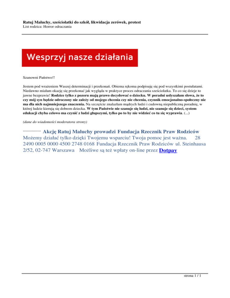 Ratuj Maluchy, sześciolatki do szkół, likwidacja zerówek, protest List rodzica: Horror odraczania Szanowni Państwo!! Jestem pod wrażeniem Waszej determinacji i przekonań. Obiema rękoma podpisuję się pod wszystkimi postulatami. Niedawno miałam okazję się przekonać jak wygląda w praktyce proces odraczania sześciolatka. To co się dzieje to jawne bezprawie! Rodzice tylko z pozoru mają prawo decydować o dziecku. W poradni usłyszałam słowa, że to czy mój syn będzie odroczony nie zależy od mojego chcenia czy nie chcenia, czynnik emocjonalno-społeczny nie ma dla nich najmniejszego znaczenia. Na szczęście znalazłam mądrych ludzi i cudowną niepubliczną poradnię, w której ludzie kierują się dobrem dziecka. W tym Państwie nie szanuje się ludzi, nie szanuje się dzieci, system edukacji chyba celowo ma czynić z ludzi głupszymi, tylko po to by nie widzieć co tu się wyprawia. (...) (dane do wiadomości moderatora strony) Akcję Ratuj Maluchy prowadzi Fundacja Rzecznik Praw Rodziców Możemy działać tylko dzięki Twojemu wsparciu! Twoja pomoc jest ważna. 28 2490 0005 0000 4500 2748 0168 Fundacja Rzecznik Praw Rodziców ul. Steinhausa 2/52, 02-747 Warszawa Możliwe są też wpłaty on-line przez Dotpay -------------- strona 1 / 1