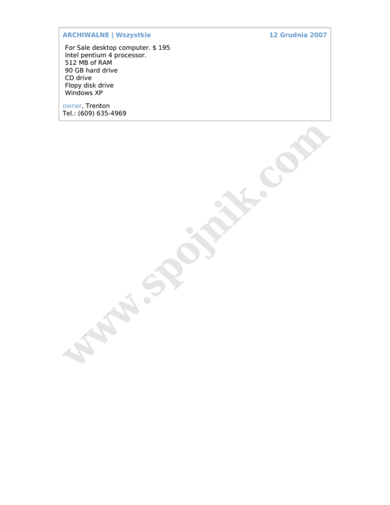 ARCHIWALNE | Wszystkie 12 Grudnia 2007 For Sale desktop computer. $ 195 Intel pentium 4 processor. 512 MB of RAM 90 GB hard drive CD drive Flopy disk drive Windows XP w w w .s po jn ik .c o m owner, Trenton Tel.: (609) 635-4969