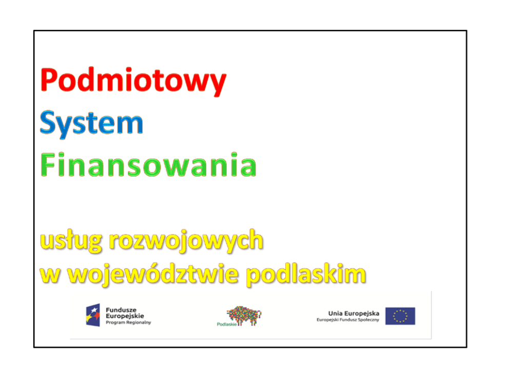 Podmioty • przedsiębiorca art. 4 ustawy z dnia 2 lipca 2004 r. o swobodzie działalności gospodarczej (Dz. U. z 2015 r. poz. 584, z późn. zm.) osoba fizyczna, osoba prawna i jednostka organizacyjna niebędąca osobą prawną, której odrębna ustawa przyznaje zdolność prawną, wykonująca we własnym imieniu działalność gospodarczą. Do przedsiębiorców zalicza się również wspólników spółki cywilnej w zakresie wykonywanej przez nich działalności gospodarczej Podmioty MŚP • art. 2 Rozporządzenia Komisji (UE) 651/2014 • mikroprzedsiębiorstwa oraz małe i średnie przedsiębiorstwa • do kategorii MŚP należą przedsiębiorstwa, które zatrudniają mniej niż 250 pracowników i których roczny obrót nie przekracza 50 mln EUR, lub roczna suma bilansowa nie przekracza 43 milionów EUR • małe przedsiębiorstwo zatrudnia mniej niż 50 pracowników roczny obrót lub roczna suma bilansowa nie przekracza 10 milionów EUR • mikroprzedsiębiorstwo zatrudnia mniej niż 10 pracowników roczny obrót lub roczna suma bilansowa nie przekracza 2 milionów EUR W kategorii mikroprzedsiębiorstwa należy uwzględnić również osoby prowadzące działalność na własny rachunek Podmioty • projekt skierowany jest wyłącznie do mikro, małych i średnich przedsiębiorców posiadających siedzibę, filię, delegaturę, oddział czy inną prawnie dozwoloną formę organizacyjną działalności podmiotu na terenie województwa podlaskiego i ich pracowników, w tym właścicieli i kadry zarządzającej Podmioty • przedsiębiorstwo wysokiego wzrostu przedsiębiorstwo o największym potencjale do generowania nowych miejsc pracy w regionie w porównaniu do innych przedsiębiorstw, tj. wykazujące w trzyletnim okresie średnioroczny przyrost przychodów o 20% i więcej Podmioty • Pracownik personel w rozumieniu art. 5 załącznika I do rozporządzenia Komisji (UE) nr 651/2014 z dnia 17 czerwca 2014 r. uznającego niektóre rodzaje pomocy za zgodne z rynkiem wewnętrznym w zastosowaniu art.107 i 108 Traktatu (Dz. Urz. UE L 187 z 26.06.2014, str. 1, z późn. zm.) • osoba zatrudniona w rozumieniu Kodeksu pracy (umowa o pracę, powołanie, wybór, mianowanie, spółdzielcza umowa o pracę) • osoba świadcząca pracę zgodnie z ustawą Kodeks cywilny • właściciele-kierownicy • wspólnicy, w tym partnerzy prowadzący regularną działalność w przedsiębiorstwie i czerpiący z niego korzyści finansowe Podmioty • pracownik o niskich kwalifikacjach osoba posiadająca wykształcenie podstawowe, gimnazjalne i ponadgimnazjalne. Stopień uzyskanego wykształcenia jest określany w dniu rozpoczęcia uczestnictwa w projekcie. Osoby przystępujące do projektu należy wykazać raz • pracownik w wieku 50 lat lub więcej osoba w wieku 50 lat i więcej, wiek określa się na podstawie daty urodzenia i ustalany jest w dniu rozpoczęcia udziału w projekcie • pracownik z niepełnosprawnościami osoba z odpowiednim orzeczeniem lub innym dokumentem poświadczającym stan zdrowia. Przynależność do grupy osób niepełnosprawnych określana jest w momencie rozpoczęcia udziału w projekcie System • Podmiotowy System Finasowania (PSF) system dystrybucji środków przeznaczonych na wspieranie rozwoju przedsiębiorców i pracowników oparty na podejściu popytowym wdrażany w ramach RPO System • podejście popytowe mechanizm dystrybucji środków EFS ukierunkowany na możliwość dokonania samodzielnego wyboru usług rozwojowych przez przedsiębiorcę oraz odpowiadający na indywidualne potrzeby rozwojowe przedsiębiorcy System • podmiot świadczący usługi rozwojowe przedsiębiorca lub instytucja, którzy świadczą usługi rozwojowe i dokonują rejestracji w Bazie Usług Rozwojowych za pomocą Karty Podmiotu w trybie określonym w regulaminie BUR System Baza Usług Rozwojowych internetowa baza usług rozwojowych, obejmująca w szczególności rejestr podmiotów zapewniających należyte świadczenie usług rozwojowych współfinansowanych ze środków publicznych, prowadzona w formie systemu teleinformatycznego przez Administratora BUR. Stanowi element rejestru prowadzonego pod nazwą Krajowy System Usług dla Małych i Średnich Przedsiębiorstw. • umożliwia : • publikację ofert usług rozwojowych przez podmioty świadczące usługi rozwojowe wraz z danymi identyfikującymi te podmioty • dokonywanie zapisów na poszczególne usługi rozwojowe • zamieszczanie ogłoszeń o zapotrzebowaniu na usługi rozwojowe • dokonywanie oceny usług rozwojowych zgodnie z Systemem Oceny Usług Rozwojowych • zapoznanie się z wynikiem ocen usług rozwojowych dokonanych przez innych uczestników usług System • regulamin Bazy Usług Rozwojowych dokument określający zasady oraz warunki funkcjonowania BUR oraz prawa i obowiązki użytkowników BUR zatwierdzony przez ministra właściwego do spraw rozwoju regionalnego oraz dostępny na stronie uslugirozwojowe.parp.gov.pl System • System Oceny Usług Rozwojowych dokument, który stanowi załącznik do regulaminu BUR, określający zasady dokonywania oceny usług rozwojowych przez przedsiębiorcę, pracowników oraz podmioty świadczące usługi rozwojowe, zatwierdzony przez ministra właściwego do spraw rozwoju regionalnego oraz dostępny na stronie uslugirozwojowe.parp.gov.pl Finansowanie • Poziom dofinansowania pojedynczej usługi rozwojowej dla jednego przedsiębiorcy (osoba fizyczna prowadząca działalność gospodarczą) lub pracownika wydelegowanego przez przedsiębiorcę nie przekracza kwoty 5 000zł, bez względu na poziom dofinansowania kosztów usługi rozwojowej Finansowanie • Poziom dofinansowania kosztów pojedynczej usługi rozwojowej (np. usługi doradczej lub szkoleniowej rozumianej jako jedna zamknięta forma wsparcia) nie przekracza co do zasady 50% kosztów usługi rozwojowej Finansowanie wyższy poziom dofinansowania : • • • • • • • • • średnie przedsiębiorstwo mikro i małe prz