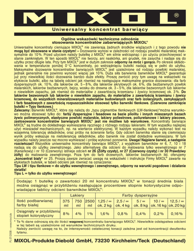 PL 07/2008 – www.mixol.de Un i w e r s a l n y k o n c e n t r a t b a r w i a c y ‘ Ogólne wskazówki techniczne odnośnie stosowania koncentratów zabarwiajacych MIXOL® ‘ Uniwersalne koncentraty cieniuja ce MIXOL® nie zawieraja z· adnych środków wia z· a cych i z tego powodu nie ‘ ‘ ‘ ‘ powl⁄oki malarskiej mak· moga być stosowane w stanie czystym! – Dozowanie wynosi w zalez ności od rodzaju ‘ do 10 %. Przed uz· yciem nalez· y butelke z MIXOL® em silnie wstrza sna c i po uz· yciu przechowywa ć w symalnie ‘ ‘ ‘ nie zasycha i nadaje sie do stanie zamknietym. W ten sposób MIXOL® nie tworzy, ani naskórka, ani grudek, ‘ uz· ytku przez dl‘⁄ugie lata. Przy tym MIXOL® jest w duz· ym zakresie odporny na mróz i goraco. Po okresie skl⁄ado‘ w pel⁄ ni do uz· ytku. wania w temperaturze poniz· ej 0 ° C koncentraty, po wstrza śnieciu butelki nadaja sie ‘ ‘uzalez· nione od rodzaju ‘ ‘ powl⁄ oki malarskiej, Maksymalne dozowanie koncentratów barwia cych MIXOL® jest ‘ jak 10 %. Duz· a sil⁄ a barwienia barwników MIXOL® gwarantuje jednak generalnie nie powinno wynosi ć wiecej juz· przy niewielkiej ilości dozowania bardzo‘ duz· e efekty. Prosze zwróci ć przy tym uwage na wskazówki na ‘ etykiecie butelki, albo na tabele odcieni jak równiez· na nastepuja‘ ce maksymalne granice dozowania: dla farb ‘ ‘ akrylowych ‘ dyspersyjnych ok. 10 %, dla lakierów ok. 5 – 8 %, dla lakierów ok. 6 %, dla bezbarwnych powl⁄ ok malarskich, lakierów bezbarwnych, bejcy, wosku do drewna ok. 3 – 5 %, dla lakierów bezwonnych lub lakierów o niewielkim zapachu, jak równiez· do material⁄ ów z zawartóscia krzemianu i z· ywicy krzemowej ok. 3 %. Do ‘ ⁄ ów z zawartościa krzemianu i z·ywicy lakierów bezwonnych lub lakierów o niewielkim zapachu, do material ‘ krzemowej, do wszystkich mineralizowanych material⁄ ów budowlanych oraz farb izolacyjnych, zamykajacych ‘ cie i farb fasadowych z zawartościa rozpuszczalników stosować tylko barwniki tlenkowe. (Czerwone zamknie ‘ ‘ butelki = Typy tlenkowe.) Zalecamy: Barwniki MIXOL®, które nie nalez· a do „typu pigmentów tlenkowych (LW-tlenkowe)“moz· na warunko‘ wo moz· na stosować tylko do: farby dyspersyjne i fasadowe na bazie pliolitu i innych mieszanych bazach z·ywic polimerycznych, elastyczne powl⁄ oki malarskie, lakiery poliestrowe, poliuretanowe i lakiery piecowe, ® zastosowanie koncentratów barwiacych MIXOL jest nie moz·liwe lub warunkowe. Koncentraty barwiace ‘ ‘ MIXOL® sa trudne do dokl⁄ adnego wymieszania recznego z róz· nego rodzaju lakierami. W tym wypadku najlepiej ‘ ‘ elektrycznej. W kaz· dym wypadku nalez· y wykona ć test na ⁄ mechanicznych, np. na wiertarce uz· y ć mieszadel wzajemna tolerancje skl⁄ adników, oraz próby na ścieranie farby. Gdy odcie ń barwnika stanie sie ciemniejszy ‘ wskazuje ‘ na nietolerancje skl⁄ adników, albo barwnik nie zostal⁄ dokl⁄ adnie wymieszany. ‘ wynik próby W tym ‘ wypadku nalez· y jeszcze raz mocno wymiesza ć i próbe wykona ć ponownie. Uwaga! Najpierw barwić, a nastepnie ‘ ce MIXOL®, z wyjatkiem barwników nr 6, 7, 10 ‘ i 18 rozcieńczać! Wszystkie uniwersalne koncentraty barwia ‘ nadaja sie do uz· ytku zewnetrznego. Jako alternatywe· ‘dla odcieni do malowania tylko wewnetrznego nr 7 ‘ ‘ i nr 10 (Czerwony) ‘ istnieje odcie ń nr 26 (Zól ‘ ⁄ ty czysty), nr 27 (Czerwony czysty) i nr 30 ‘ Prawdziwy (Kanarkowy) ·zól⁄ ty) do malowania zewnetrznego. Poza tym do farb drzewnych, lakierów bezbarwnych itd. oferujemy ‘ „koncentrat bial⁄ y“ nr 25. Prosze zawsze zwraca ć uwage na wskazówki i instrukcje Firmy MIXOL® zawarte na ‘ ‘ etykietach butelek, w tabeli odcieni jak równiez· na oznaczenia: Tipu LW i tipu tlenkowe = do uz·ytku wewnetrznego i zewnetrznego, odporny na warunki pogodowe i dzial⁄ anie ‘ ‘ s´wiatl⁄ a! Tipu L = tylko do uz·ytku wewnetrznego! ‘ Dodaja c 1 butelke o zawartości 20 ml koncentratu MIXOL® w tonacji średnia biala moz· na‘ osia gna c w‘ przybliz· eniu naste puja ce procentowe stopnie kolorystyczne odpo‘ ‘ odcieni barwników ‘MIXOL ‘ ®: wiadaja ce tablicy ‘ Lakiery Farby dyspersyjne Iloś ć podbarwianej 375 750 2500 1,25 l = 2,5 l = 5l = 10 l = 12,5 l = farby bial⁄ ej ml ml ml ok. 2 kg ok. 4 kg ok. 8 kg ok. 16 kg ok. 20 kg Osia gniety w przybliz· eniu ‘ ń kolorystyczny ‘ 8 % 4 % 1% 1,6 % 0,8 % 0,4 % 0,2 % 0,16 % stopie * Te % dane odnosza sie do ilości wagowej koncentratu barwia cego MIXOL®. Niewielkie odste pstwa odcieni ‘ · nione ‘ ‘ ‘ w tej tabeli sa uzalez od warunków technicznych druku. Nalez· y zwróci‘ć uwage na to, z· e intensywnoś ć ostatecznej tonacji zalez· na jest od koncentracji dwutlenku ‘ tytanu. MIXOL-Produkte Diebold GmbH, 73230 Kirchheim/Teck (Deutschland)