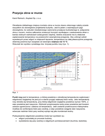 Pozycja okna w murze Karol Reinsch, Aluplast Sp. z o.o. Określenie dokładnego miejsca montażu okna w murze otworu okiennego należy przede wszystkim do obowiązków projektanta budynku. Jest to jeden z ważniejszych jego obowiązków, bo wskutek niewłaściwego wykonania przyłącza budowlanego tj. połączenia okna z murem, można całkowicie zniweczyć korzyści wynikające z zastosowania okien o bardzo dobrych wartościach izolacyjności cieplnej. Istotne znaczenie ma tu właściwe zaplanowanie temperatury na powierzchni wewnętrznej przegrody. Aby uniknąć szkód wywołanych przez wilgoć w miejscach łączenia, temperatura na całej płaszczyźnie przegrody okiennej powinna być wszędzie od wewnątrz większa niż 13 °C. Warunek ten wynika z przebiegu tzw. krzywej punktu rosy (rys. 1). Rys. 1 Punkt rosy jest to temperatura, w której powietrze o określonej temperaturze wyjściowej i wilgotności względnej nie jest już w stanie przyjąć większej ilości wody. Jako temperaturę rosy określa się temperaturę, przy której wilgotność względna powietrza wynosi 100%, a więc powietrze jest nasycone. Zdolność przyjmowania wody przez powietrze jest bowiem zawsze ograniczona i zależna od temperatury. Jeśli zostanie przekroczona maksymalna możliwa do wchłonięcia ilość pary wodnej, a więc powietrze osiągnie stan nasycenia, wówczas nadmiar ilości pary wodnej wytrąci się jako kondensat wodny. Podwyższenie wilgotności powietrza może być wynikiem np.: wilgoci pozostałej po procesie budowy, wydzielania się pary wodnej w wilgotnych pomieszczeniach (kuchnia, łazienka), wydzielania się wilgoci fizjologicznej pochodzenia ludzkiego i zwierzęcego lub pochodzenia roślinnego. Przeciętną ilość wilgoci jaką wytwarzamy codziennie w różnej wielkości gospodarstwach domowych przedstawia poniższa tabela: Tabela 1 Codzienne obciążenie wilgotnością w litrach na dzień 2 osoby 3 osoby 4 osoby ponad 4 osoby 8 12 14 15 Wilgotność powietrza w pomieszczeniu ma istotny wpływ na nasze poczucie komfortu, co doskonale ilustruje rys. 2. Pożądana, względna wilgotność powietrza, odczuwana przez człowieka jako klimat przyjemny wynosi 40-65 proc. przy utrzymywaniu temperatury w pomieszczeniu na poziomie 19-22oC. Za optymalną przyjmuje się zazwyczaj wilgotność 50 proc. przy temperaturze 20 oC. Względna wilgotność powietrza (%) Nieprzyjemnie wilgotno Przyjemnie Jeszcze przyjemnie Nieprzyjemnie sucho Temperatura w pomieszczeniu (oC) Rys. 2. Pole komfortu według Leusdena i Freymarka W którym więc miejscu muru zamontować okno, aby zachowując tą optymalną wilgotność i temperaturę, nie dopuścić do tworzenia się warunków dla rozwoju pleśni lub co jeszcze gorsze do wykraplania się pary na szybach i ramach tego okna? Aby przeanalizować skutki kilku wariantów różnego posadowienia okna w murze przeprowadzono symulację komputerową na przykładzie muru wykonanego z gazobetonu o grubości 24cm, ocieplonego z zewnątrz warstwa izolacji o grubości 15cm. Założono dodatkowo stałe warunki temperaturowe: na zewnątrz pomieszczenia panuje temperatura -5oC a wewnątrz 20oC. Uzyskano w ten sposób rysunki przebiegu izoterm ciepła, na których wyróżniono dwie krytyczne izotermy. Niebieską linią zaznaczono izotermę o temperaturze 10oC, poniżej której para wodna ulega kondensacji, a czerwoną linią izotermę o temperaturze 13oC, poniżej której powstają warunki dla rozwoju pleśni. WARIANT I - okno zamocowane w połowie grubości muru, ościeżnica nie zakryta ociepleniem (rys. 3) WARIANT IA - okno zamocowane w połowie grubości muru, ościeżnica zakryta ociepleniem (rys. 4) Izotermy 10 i 13oC przebiegają w połowie grubości muru oraz bardzo blisko wewnętrznej powierzchni łączenia okna z murem. Bardzo duże odległości pomiędzy izotermami po stronie temperatur niższych niż 13oC. Wychłodzona jest znaczna część muru i szczeliny montażowej. Izoterma 10oC w znacznym stopniu odsunęła się na zewnątrz, a odległości pomiędzy izotermami o niższej temperaturze zmniejszyły się. Izoterma 13oC przesunęła się bliżej zewnętrznej płaszczyzny okna i muru. Nadal wychłodzona jest znaczna część muru, ale podniosła się wyraźnie temperatura w przekroju szczeliny montażowej. WARIANT II - okno zamocowane przed ociepleniem, równo z zewnętrzną płaszczyzną muru, ościeżnica nie zakryta ociepleniem (rys. 5) WARIANT IIA - okno zamocowane przed ociepleniem, równo z zewnętrzną płaszczyzną muru, ale ościeżnica zakryta ociepleniem (rys. 6) Izoterma 10oC przebiega prawie poza licem muru, ale nadal obserwujemy bardzo duże zagęszczenie izoterm po stronie niskich temperatur. Izoterma 10oC przebiega całkowicie poza płaszczyzną muru. Prawie cały przekrój muru i szczeliny montażowej ma temperaturę wyższą niż 10oC. Izoterma 13oC znacznie oddalona od wewnętrznej powierzchni szczeliny montażowej. Z punktu widzenia rozkładu temperatur w przegrodzie najmniej korzystny wariant montażu to zamocowanie okna w połowie grubości muru bez zakrycia ościeżnicy ociepleniem, czyli wariant I. Dodatkowym minusem rozwiązania z montażem okna w połowie grubości muru jest to, że przez okno osadzone głęboko w ścianie dociera w głąb pomieszczeń mniejsza ilość naturalnego światła i ciepła ze Słońca. Najlepszy efekt uzyskujemy montując okno w warstwie izolacji i zakrywając ościeżnicę ociepleniem, co opisuje wariant IIIa poniżej: WARIANT III - okno zamocowane w zewnętrznej warstwie ocieplenia, ale ościeżnica nie zakryta ociepleniem (rys.7) WARIANT IIIA - okno zamocowane w zewnętrznej warstwie ocieplenia i ościeżnica zakryta ociepleniem (rys. 8) Izotermy 10 i 13oC przebiegają całkowicie poza licem muru. Bardzo duże zagęszczenie izoterm po stronie niskich temperatur. Duże wychłodzenie szczeliny montażowej. Bardzo bliski przebieg izotermy 13oC względem jej wewnętrznej powierzchni. Izotermy 10 i 13oC odsunięte
