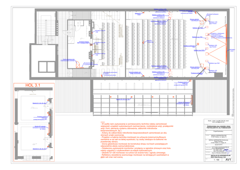 Reflektor profilowy LED montowany na 130 200 Kamera IP KAM1 D1 Promiennik podczerwieni -RXPIR2 Reflektor profilowy LED montowany na sztankiecie sufitowym 12 x 10,8 x 45 cm PF3 94 D5 Line Array GL Reflektor LED typu Fresnel montowana na sztankiecie sufitowym 90 200 115 Reflektor typu PAR 91 574 +4.02 28 PS2 D6 Projektory z obiektywami 90 90 200 Reflektor typu PAR +4.52 3/6 Sala kinowa +4.02 drewna lub jednolitym kolorze. D7 Mikrofon SYMULTANICZNEGO 200 PS3 Reflektor LED typu Fresnel PF4 Reflektor typu PAR Podest pod kabiny - na podkonstrukcji stalowej PS4 ekran w pomieszczeniu technika Rozdzielnica RAV w pomieszczeniu technika Reflektor typu PAR +2.72 montowana na sztankiecie sufitowym 146 +4.02 12 xPromiennik 10,8 x 45 cm Reflektor LED typu Fresnel Reflektor profilowy LED montowany na sztankiecie sufitowym podczerwieni -RXPIR1 Line Array GR KAM2, dla technika PF5 Reflektor profilowy LED montowany na PW3 oraz HOL 3.1 grzejniki do wymiany 3/10 D1 3/1 deska "modrzew syberyjski" 90 205 ok. 230cm Hol PW2 oraz [email protected] UWAGI: Temat PRZEBUDOWA SALI KINOWEJ ORAZ ok. 230cm bezprzewodowych, itp.). Etap: Projekt Budowlany Lokalizacja: D1 +0.00 90 205 Inwestor: = + 12,00 Data: arch.Aneta Lewandowska-Mentel nr upr. MPOIA/020/2013 tech. Piotr Szewczuk nazwa rysunku: skala: INSTALACJE AUDIOWIZUALNE RZUT-Sala Kinowa i Hol 1 : 100 AV1