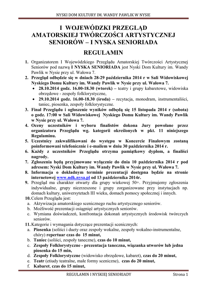 NYSKI DOM KULTURY IM. WANDY PAWLIK W NYSIE I WOJEWÓDZKI PRZEGLĄD AMATORSKIEJ TWÓRCZOŚCI ARTYSTYCZNEJ SENIORÓW – I NYSKA SENIORIADA REGULAMIN 1. Organizatorem I Wojewódzkiego Przeglądu Amatorskiej Twórczości Artystycznej Seniorów pod nazwą I NYSKA SENIORIADA jest Nyski Dom Kultury im. Wandy Pawlik w Nysie przy ul. Wałowa 7. 2. Przegląd odbędzie się w dniach 28-29 października 2014 r w Sali Widowiskowej Nyskiego Domu Kultury im. Wandy Pawlik w Nysie przy ul. Wałowa 7. 28.10.2014 godz. 16.00-18.30 (wtorek) – teatry i grupy kabaretowe, widowiska obrzędowe - zespoły folklorystyczne, 29.10.2014 godz. 16.00-18.30 (środa) – recytacja, monodram, instrumentaliści, taniec, piosenka, zespoły folklorystyczne. 3. Finał Przeglądu i ogłoszenie wyników odbędą się 15 listopada 2014 r (sobota) o godz. 17:00 w Sali Widowiskowej Nyskiego Domu Kultury im. Wandy Pawlik w Nysie przy ul. Wałowa 7. 4. Oceny uczestników i wyboru finalistów dokona Jury powołane przez organizatora Przeglądu wg. kategorii określonych w pkt. 11 niniejszego Regulaminu. 5. Uczestnicy zakwalifikowani do występu w Koncercie Finałowym zostaną poinformowani telefonicznie i e-mailem w dniu 30 października 2014 r. 6. Każdy z uczestników Przeglądu otrzyma pamiątkowy dyplom, a finaliści nagrody. 7. Zgłoszenia będą przyjmowane wyłącznie do dnia 10 października 2014 r pod adresem: Nyski Dom Kultury im. Wandy Pawlik w Nysie przy ul. Wałowa 7. 8. Informacja o dokładnym terminie prezentacji dostępna będzie na stronie internetowej www.ndk.nysa.pl od 13 października 2014r. 9. Przegląd ma charakter otwarty dla grupy wiekowej 50+. Przyjmujemy zgłoszenia indywidualne, grupy niezrzeszone i grupy zorganizowane przy instytucjach np. domach kultury, uniwersytetach III wieku, domach pomocy społecznej i innych. 10. Celem Przeglądu jest: a. Aktywizacja amatorskiego scenicznego ruchu artystycznego seniorów. b. Możliwość prezentacji osiągnięć artystycznych seniorów. c. Wymiana doświadczeń, konfrontacja dokonań artystycznych środowisk twórczych seniorów. 11. Kategorie i wymagania dotyczące prezentacji scenicznych: a. Piosenka (soliści i duety oraz zespoły wokalne, zespoły wokalno-instrumentalne, chóry) repertuar czas do 15 minut, b. Taniec (soliści, zespoły taneczne), czas do 10 minut, c. Zespoły Folklorystyczne - prezentacja taneczna, wiązanka utworów lub jedna piosenka do 15 min, d. Zespoły Folklorystyczne (widowisko obrzędowe, kabaret), czas do 20 minut, e. Teatr (etiudy teatralne, małe formy sceniczne), czas do 20 minut, f. Kabaret, czas do 15 minut, REGULAMIN I NYSKIEJ SENIORIADY Strona 1 NYSKI DOM KULTURY IM. WANDY PAWLIK W NYSIE g. Monodram, czas do 15 minut, h. Recytacja (poezja, fragmenty prozy, składanka tekstów, kompozycje słownomuzyczne), czas do 5 minut, i. Instrumentaliści (soliści, zespoły), czas do 10 minut. 12. Wykonawcy, którzy przedłużą regulaminowy czas prezentacji nie będą podlegać ocenie jury i zostaną zdyskwalifikowani. 13. Uczestnicy przeglądu mogą śpiewać a’capella bądź korzystać z: akompaniamentu na żywo, półplaybacków nagranych wyłącznie na płytach CD, w formacie Audio CD. 14. 15. Do dyspozycji wykonawców pozostaje scena o wymiarach: 8 m x10 m. wyposażona w urządzenia audio – wizualne oraz perkusja i fortepian. Organizator zapewnia również obsługę techniczną. Szczegółowe informacje dotyczące przeglądu można uzyskać w Dziale Organizacji Imprez NDK (tel. 77 433 44 75) lub u p. Piotra Przybyłowskiego nr tel. 883257835, e-mail [email protected]. Dyrektor Nyskiego Domu Kultury im. Wandy Pawlik w Nysie Janina Janik REGULAMIN I NYSKIEJ SENIORIADY Strona 2 NYSKI DOM KULTURY IM. WANDY PAWLIK W NYSIE WARUNKI UCZESTNICTWA 1. Kompletnie wypełnione karty zgłoszeń należy dostarczyć do godz. 14.00 dnia 10 października 2014 r. pod adres: Nyski Dom Kultury im. Wandy Pawlik w Nysie przy ul. Wałowa 7. (z dopiskiem I Nyska Senioriada )lub e-mailem : [email protected] Prosimy ściśle przestrzegać terminu nadsyłania zgłoszeń. Przyjmujemy tylko te karty, które wpłyną do dnia 10 października 2014 r. Zgłoszenia nadsyłane drogą elektroniczną: fax, e-mail, wymagają telefonicznego potwierdzenia w dniu wysłania. 2. Uczestnicy przyjeżdżają do Nysy na koszt własny i sami pokrywają ewentualne koszty pobytu. 3. Nagrody nieodebrane w ciągu 30 dni kalendarzowych od oficjalnego ogłoszenia wyników przechodzą do puli nagród przyznawanych w innych festiwalach i konkursach organizowanych przez Nyski Dom Kultury im. Wandy Pawlik w Nysie przy ul. Wałowa 7. 4. Z uwagi na ochronę danych osobowych, zgodnie z ustawą z dnia 29 sierpnia 1997 o ochronie danych osobowych, prosimy solistów o wyrażenie zgody na przetwarzanie Państwa danych osobowych przez administratora danych, którym jest Nyski Dom Kultury im. Wandy Pawlik w Nysie przy ul. Wałowa 7. Dane wykorzystane będą wyłącznie do celów organizacji przeglądu. Podanie danych jest dobrowolne, ale niezbędne do udziału w przeglądzie. Listy uczestników zawierające dane w zakresie <imię, nazwisko, kategoria artystyczna, placówka > , listy laureatów zawierające dane o podobnym zakresie oraz materiały zdjęciowe i filmowe związane z przeglądem będą umieszczone na stronach internetowych Nyskiego Domu Kultury, w prasie, radio i telewizji (mediów, które otrzymają akredytację od organizatora przeglądu). Inne udostępnianie danych nie jest przewidywane. Osobie, której dotyczą dane, przysługuje prawo dostępu do treści tych danych i ich poprawienia. 5. Przesłanie karty zgłoszenia oraz zgody na przetwarzanie danych osobowych i rozpowszechnianie wizerunku jest jednoznaczne z przyjęciem warunków konkursu. 6. Regulamin konkursu oraz karta zgłoszenia dostępne są na stronie internetowej www.ndk.nysa.pl W przypadku dużej ilości zgłoszeń organizator zastrzega sobie prawo do swobodnego wyboru uczestników przeglądu. REGULAMIN I NYSKIEJ SENI