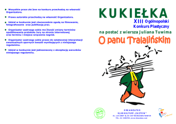 Wszystkie prace złożone na konkurs przechodzą na własność Organizatora. Prawa autorskie przechodzą na własność Organizatora. Udział w konkursie jest równocześnie zgodą na filmowanie, fotografowanie oraz publikację prac. Organizator zastrzega sobie możliwość zmiany terminów opublikowania protokołu Jury na stronie internetowej oraz terminu i miejsca wręczenia nagród. Organizator zastrzega sobie prawo do ostatecznej interpretacji ewentualnych spornych kwestii wynikających z niniejszego regulaminu. KUKIEŁKA XIII Ogólnopolski Konkurs Plastyczny na postać z wiersza Juliana Tuwima , O panu Tralalinskim Udział w konkursie jest jednoznaczny z akceptacją warunków niniejszego regulaminu. O R G A N I Z ATO R K LU B K U LT U RY „ Z A S T Ó W ” U L . LU C E R N Y 1 3, 04 - 6 87 WA R S Z AWA WAW E R T E L . 22 / 8 15676 3, w w w. k k z a s t ow. c o m WARUNKI UDZIAŁU W KONKURSIE: Zapraszamy do udziału w XIII Ogólnopolskim Konkursie Plastycznym KUKIEŁKA na postać z wiersza Juliana Tuwima O panu Tralalińskim Prosimy o dokładne przeczytanie regulaminu! …Kukiełka to lalka umocowana na patyku i poruszana przez aktorów, schowanych za parawanem zakrywającym dół sceny… CELE KONKURSU: pobudzenie wyobraźni plastycznej, zainteresowanie dzieci i młodzieży inną techniką plastyczną, rozwinięcie pojęcia pracy przestrzennej, upowszechnianie twórczości nieprofesjonalnej, zachęcanie do czytania. UCZESTNICY KONKURSU: indywidualni, dzieci, młodzież, dorośli działający w szkołach, świetlicach, klubach, placówkach kultury, placówkach wychowawczych i innych. JURY PRZY OCENIE PRAC BIERZE POD UWAGĘ: nawiązanie do tematu konkursu, samodzielność, staranność, pomysłowość, ogólne wrażenie artystyczne, zastosowany materiał. uczestnicy startują w czterech kategoriach wiekowych: 7-10 lat, 11-13 lat, 14-16 lat, powyżej 17 lat w konkursie oceniane będą tylko prace wykonane indywidualnie, (prace wykonane zespołowo nie będą oceniane), każdy uczestnik konkursu może złożyć tylko JEDNĄ pracę, do każdej kukiełki należy dołączyć starannie przymocowaną małą metryczkę z następującymi informacjami: - postać jaką przedstawia kukiełka, - imię i nazwisko, wiek autora, - nazwa i adres placówki (lub w przypadku zgłoszenia indywidualnego adres zamieszkania ), adres e-mail, - imię i nazwisko opiekuna artystycznego, (lub w przypadku zgłoszenia indywidualnego imię i nazwisko osoby, pod kierunkiem której praca została wykonana), adres e-mail,telefon, wielkość kukiełki (razem z patykiem) nie może przekroczyć 0,5 metra placówki prosimy o dołączenie listy uczestników z podziałem na kategorie wiekowe. 26.04.2013 r. Prace prosimy składać w dniu w godzinach 13:00-19:00 lub przesłać na adres “ Klub Kultury Zastów” ul. Lucerny 13 04-687 Warszawa (decyduje data wpływu) do dnia 26.04.2013 r. WAŻNA INFORMACJA ! Lista laureatów, termin oraz godzina wręczenia nagród zamieszczona będzie w dniu 15.05.2013 r. (środa) na naszej stronie internetowej www.kkzastow.com UWAGA! Dla zwycięzców oraz ich opiekunów przewidziano nagrody!