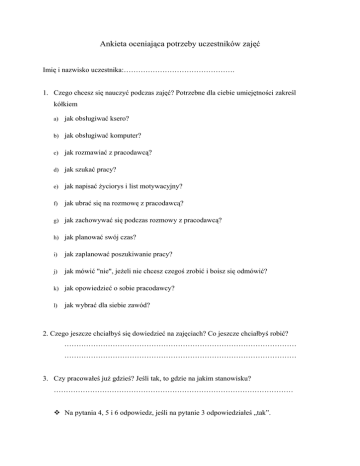 Ankieta oceniająca potrzeby uczestników zajęć Imię i nazwisko uczestnika:………………………………………. 1. Czego chcesz się nauczyć podczas zajęć? Potrzebne dla ciebie umiejętności zakreśl kółkiem a) jak obsługiwać ksero? b) jak obsługiwać komputer? c) jak rozmawiać z pracodawcą? d) jak szukać pracy? e) jak napisać życiorys i list motywacyjny? f) jak ubrać się na rozmowę z pracodawcą? g) jak zachowywać się podczas rozmowy z pracodawcą? h) jak planować swój czas? i) jak zaplanować poszukiwanie pracy? j) jak mówić "nie", jeżeli nie chcesz czegoś zrobić i boisz się odmówić? k) jak opowiedzieć o sobie pracodawcy? l) jak wybrać dla siebie zawód? 2. Czego jeszcze chciałbyś się dowiedzieć na zajęciach? Co jeszcze chciałbyś robić? …………………………………………………………………………………… …………………………………………………………………………………… 3. Czy pracowałeś już gdzieś? Jeśli tak, to gdzie na jakim stanowisku? ……………………………………………………………………………………… Na pytania 4, 5 i 6 odpowiedz, jeśli na pytanie 3 odpowiedziałeś „tak”. W poniższych pytaniach zakreśl kółkiem najbardziej pasujące do Ciebie odpowiedzi, jeśli żadna z nich do Ciebie nie pasuje lub chcesz dodać jakąś odpowiedź wypełnij punkt e): 4. Co ułatwia Ci prowadzenie rozmowy z osobą, u której starasz się o pracę? a) wiem, co potrafię robić b) nie boję się pracodawcy c) umiem przekazać pracodawcy, to co potrafię robić d) nie boję się rozmawiać z obcymi ludźmi e) inne:…………………………………………………………… ………………………………………………………………… 5.Co jest dla Ciebie najtrudniejsze w prowadzeniu rozmowy o pracę? a) nie wiem, co potrafię robić dobrze b) boje się pracodawcy c) nie umiem jasno przekazać tego, co chciałbym i co umiem robić d) boję się rozmowy z obcymi ludźmi e) inne:………………………………………………………… ……………………………………………………………… 6.Jakie Twoje cechy charakteru sprawiają, że jesteś dobrym pracownikiem? a) jestem punktualny b) jestem dokładny c) lubię pracować d) kończę to, co zaczynam robić e) inne:………………………………………………………… ……………………………………………………………… 7.Co stanowi dla Ciebie największy problem w nawiązaniu kontaktu z pracodawcą? a) nie wiem, gdzie szukać ofert pracy b) mam problem z wyborem odpowiedniej oferty pracy c) nie lubię rozmawiać przez telefon d) zapominam o umówionym spotkaniu e) inne:…………….….……………………………………… …………………………………………………………….. 8. W jakim zawodzie chciałbyś pracować? ……………………………………………………………………………………….. ……………………………………………………………………………………….. 9. Jakie są Twoje oczekiwania wobec zajęć? a) chciałbym nauczyć się obsługi urządzeń biurowych b) chciałbym czuć się pewniej w rozmowie z pracodawcą c) chciałbym umieć wybrać dla siebie zawód d) chciałbym poszerzyć swoje umiejętności e) inne:……………………………………………………… ……………………………………………………………