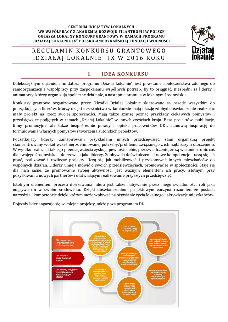 CENTRUM INICJATYW LOKALNYCH WE WSPÓŁPRACY Z AKADEMIĄ ROZWOJU FILANTROPII W POLSCE OGŁASZA LOKALNY KONKURS 1. GRANTOWY W RAMACH PROGRAMU „DZIAŁAJ LOKALNIE IX” POLSKO-AMERYKAŃSKIEJ FUNDACJI WOLNOŚCI REGULAMIN KONKURSU GRANTOWEGO „DZIAŁAJ LOKALNIE” IX W 2016 ROKU I. IDEA KONKURSU Dalekosiężnym dążeniem fundatora programu Działaj Lokalnie” jest powstanie społeczeństwa zdolnego do samoorganizacji i współpracy przy zaspokajaniu wspólnych potrzeb. By to osiągnąć, niezbędni są liderzy i animatorzy, którzy organizują społeczne działanie, a następnie promują w lokalnym środowisku. Konkursy grantowe organizowane przez Ośrodki Działaj Lokalnie skierowane są przede wszystkim do początkujących liderów, którzy dzięki uczestnictwu w konkursie mają okazję zdobyć doświadczenie realizując mały projekt na rzecz swojej społeczności. Mają także szansę poznać przykłady ciekawych pomysłów i przedsięwzięć podjętych w ramach „Działaj Lokalnie” w innych częściach kraju. Baza projektów, publikacje, filmy promocyjne, ale także bezpośrednie porady i opieka pracowników ODL stanowią inspirację do formułowania własnych pomysłów i tworzenia autorskich projektów. Początkujący liderzy, zainspirowani przykładami innych przedsięwzięć, sami organizują projekt skoncentrowany wokół wcześniej zdefiniowanej potrzeby/problemu związanego z ich najbliższym otoczeniem. W wyniku realizacji takiego przedsięwzięcia zyskują pewność siebie, przeświadczenie, że są w stanie zrobić coś dla swojego środowiska – dojrzewają jako liderzy. Zdobywają doświadczenie i nowe kompetencje - uczą się jak pisać, realizować i rozliczać projekty. Uczą się jak mobilizować i przekonywać innych mieszkańców do wspólnych działań. Liderzy umieją mówić o swoich przedsięwzięciach, promować je w społeczności. Staje się dla nich jasne, że promowanie swojej aktywności jest ważnym elementem ich pracy, istotnym przy pozyskiwaniu nowych partnerów i ułatwiającym realizowanie przyszłych przedsięwzięć. Istotnym elementem procesu dojrzewania lidera jest także nabywanie przez niego świadomości roli jaką odgrywa on w swoim środowisku. Dzięki doświadczeniom projektowym zaczyna rozumieć, że posiada narzędzia i kompetencje dzięki którym może wpływać na ożywianie życia lokalnego i aktywizację mieszkańców. Dojrzały lider angażuje się w kolejne projekty, także poza programem DL. II.ZAŁOŻENIA ORAZ CEL KONKURSU W IX edycji Programu „Działaj Lokalnie” wspierane będą projekty, które inicjują współpracę mieszkańców na rzecz dobra wspólnego i które służą pobudzaniu aspiracji rozwojowych, poprawie jakości życia. W rezultacie podejmowane działania mają przyczyniać się do budowania lokalnego kapitału społecznego. Program jest prowadzony z myślą o organizacjach pozarządowych oraz grupach nieformalnych, które podejmują wspólny wysiłek, aby w ich społecznościach żyło się lepiej. W ramach konkursu przewidywane jest przyznanie dotacji na 3-6 miesięczne projekty, które: o zakładają współdziałanie mieszkańców, dzięki któremu możliwe jest osiąganie celów o charakterze dobra wspólnego, o wynikają z konkretnych potrzeb danej społeczności, o mają jasno określony cel, dobrze zaplanowane działania, mierzalne rezultaty i rozsądne koszty realizacji, o przewidują takie działania, które będą kierowane do określonej grupy odbiorców, a jednocześnie będą służyć całej społeczności, o będą realizowane wspólnymi siłami mieszkańców i instytucji życia lokalnego – samorządów, przedsiębiorców i organizacji społecznych, o będą umiejętnie i w sposób przemyślany angażowały zasoby lokalne – naturalne, społeczne, ludzkie i finansowe. W konkursie nie będą finansowane działania akcyjne i jednorazowe wydarzenia (trwające krócej niż 3 miesiące). Natomiast wysoko oceniane będą projekty, które proponują nowe działania lub nową ofertę dla mieszkańców, albo włączają nowe środowiska w prowadzone wcześniej działania. Zatem od wnioskodawców oczekujemy nowych pomysłów, nowych ofert, które mogą być adaptacją działań podejmowanych przez inne środowiska lub zupełnie nową propozycją. Składane do konkursu projekty mogą być natomiast rozwinięciem wcześniej podjętych działań. Organizacje oraz grupy nieformalne, które poszukują inspiracji do działania, mogą skorzystać z doświadczeń poprzednich grantobiorców Programu. Program „Działaj Lokalnie” to już ponad 7,5 tysiąca zrealizowanych projektów oraz ponad 32 miliony złotych przekazanych w postaci grantów. Wszystkie dotychczas dofinansowane inicjatywy opisane są na stronie www.dzialajlokalnie.pl w zakładce pod nazwą „Baza projektów”, a także w publikacjach dostępnych w zakładce „Mediateka”. Część z nich to uniwersalne rozwiązania, które z powodzeniem mogą być zastosowane w każdej polskiej gminie, dlatego gorąco zachęcamy do odwiedzenia strony i zapoznania się z dobrymi praktykami Programu. regulamin lokalnego konkursu grantowego w 2016 r., strona 2 z 7 III. KTO MOŻE UBIEGAĆ SIĘ O DOTACJE? Program adresowany jest do: o organizacji pozarządowych posiadających osobowość prawną (np. fundacji, stowarzyszeń zarejestrowanych, uczniowskich klubów sportowych, stowarzyszeń kultury fizycznej, organizacji społeczno-zawodowych rolników), z wyłączeniem fundacji skarbu państwa i ich oddziałów, fundacji utworzonych przez partie polityczne, stowarzyszeń samorządów lokalnych, Lokalnych Grup Działania i Lokalnych Grup Rybackich, Lokalnych Organizacji Turystycznych związków stowarzyszeń, o oddziałów terenowych organizacji pozarządowych posiadających osobowość prawną, o grup nieformalnych (w tym także oddziałów terenowych organizacji nieposiadających osobowości prawnej), w których imieniu wniosek złoży organizacja pozarząd