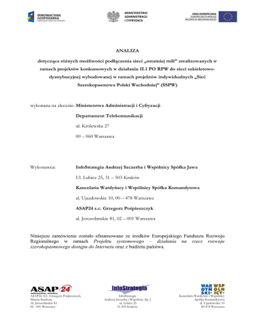 MINISTERSTWO ADMINISTRACJI I CYFRYZACJI ANALIZA dotycząca różnych możliwości podłączenia sieci „ostatniej mili” zrealizowanych w ramach projektów konkursowych w działaniu II.1 PO RPW do sieci szkieletowodystrybucyjnej wybudowanej w ramach projektów indywidualnych „Sieć Szerokopasmowa Polski Wschodniej” (SSPW) wykonana na zlecenie: Ministerstwa Administracji i Cyfryzacji Departament Telekomunikacji ul. Królewska 27 00 – 060 Warszawa Wykonawca: InfoStrategia Andrzej Szczerba i Wspólnicy Spółka Jawa Ul. Lubicz 25, 31 – 503 Kraków Kancelaria Wardyńscy i Wspólnicy Spółka Komandytowa al. Ujazdowskie 10, 00 – 478 Warszawa ASAP24 s.c. Grzegorz Pośpieszczyk al. Jerozolimskie 81, 02 – 001 Warszawa Niniejsze zamówienie zostało sfinansowane ze środków Europejskiego Funduszu Rozwoju Regionalnego w ramach Projektu systemowego – działania na rzecz rozwoju szerokopasmowego dostępu do Internetu oraz z budżetu państwa. ASAP24 S.C. Grzegorz Pośpieszczyk, Marcin Stachura Al. Jerozolimskie 81 02 - 001 Warszawa InfoStrategia Andrzej Szczerba i Wspólnicy Sp. J ul. Lubicz 25 31-503 Kraków Kancelaria Wardyński i Wspólnicy Spółka Komandytowa al. Ujazdowskie 10 00-478 Warszawa MINISTERSTWO ADMINISTRACJI I CYFRYZACJI I. Część ogólna 1. Podstawa opracowania: Podstawa prawna: 1) Umowa nr 2/INFOSTRATEGIA/MAC/UW-UR/15 z dnia 14.04.2015 r. na wykonanie ekspertyz zawarta między Zamawiającym a Wykonawcą, 2) ustawa z dnia 29 stycznia 2004 r. Prawo zamówień publicznych (t.j. Dz. U. z 2013 r., poz. 907 z późn. zm.) dalej: ustawa pzp, wraz z aktami wykonawczymi, 3) ustawa z dnia 17 grudnia 2004 r. o odpowiedzialności za naruszenie dyscypliny finansów publicznych (t.j. Dz. U. z 2013 r., poz. 168 z późn. zm.) dalej: ustawa o naruszeniu dyscypliny, 4) ustawa z dnia 5 czerwca 1998 r. o samorządzie województwa (tj. Dz. U. z 2001 r. Nr 142, poz. 1590, z późn. zm.), dalej ustawa o samorządzie województwa, 5) ustawa z dnia 20 grudnia 1996 r. o gospodarce komunalnej (tj. Dz. U. z 2011 r. Nr 45, poz. 236 z późn. zm.), dalej ustawa o gospodarce, 6) ustawa z dnia 15 września 2000 r. Kodeks spółek handlowych (Dz. U. z 2000 r. Nr 94, poz. 1037, z późn. zm.), dalej ksh, 7) ustawa z dnia 16 lipca 2004 r. Prawo telekomunikacyjne (t.j. Dz. U. z 2014 r. poz. 243 z późn. zm.) dalej Prawo telekomunikacyjne, 8) ustawa z dnia 7 maja 2010 r. o wspieraniu rozwoju usług i sieci telekomunikacyjnych (Dz. U. z 2010 r. poz. 106, nr 675 z późn. zm.), dalej ustawą o wspieraniu rozwoju usług i sieci telekomunikacyjnych, 9) ustawa z dnia 2 lipca 2004 r. o swobodzie działalności gospodarczej (tj. Dz. U. z 2010 r. Nr 220, poz. 1447, z późn. zm.), dalej ustawa o swobodzie działalności gospodarczej, Strona 2 MINISTERSTWO ADMINISTRACJI I CYFRYZACJI 10) Rozporządzenie Ministra Rozwoju Regionalnego z dnia 21 marca 2013 r. w sprawie udzielania przez Polską Agencję Rozwoju Przedsiębiorczości pomocy finansowej na tworzenie i umożliwienie dostępu do sieci szerokopasmowej w ramach Programu Operacyjnego Rozwoju Polski Wschodniej 2007-2013 (Dz. U. 2013.1615); dalej Rozporządzenie. Opinia uwzględnia stan prawny obowiązujący w dniu jej sporządzenia. Podstawa faktyczna opracowania została wskazana w pkt. 3. 2. Zakres opracowania. Przedmiotem opracowania jest Analiza dotycząca różnych możliwości podłączenia sieci „ostatniej mili” zrealizowanych w ramach projektów konkursowych w działaniu II.1 PO RPW do sieci szkieletowo-dystrybucyjnej wybudowanej w ramach projektów „Sieć Szerokopasmowa Polski Wschodniej” (SSPW), z uwzględnieniem: a) uwarunkowań technologicznych oraz prawnych, pod kątem zgodności z rozporządzeniem Ministra Rozwoju Regionalnego z dnia 21 marca 2013 r. w sprawie udzielania przez Polską Agencję Rozwoju Przedsiębiorczości pomocy finansowej na tworzenie i umożliwienie dostępu do sieci szerokopasmowej w ramach Programu Operacyjnego Rozwoju Polski Wschodniej 2007-2013 (Dz. U. 2013.1615); b) zgodności z kryteriami wyboru projektów konkursowych w ramach działania II.1 PO RPW; c) zgodności z zapisami Regulaminu przeprowadzenia konkursu w ramach działania II.1 PO RPW. 3. Dokumenty wykorzystane do ekspertyzy Wykaz dokumentów: Dokumentacja konkursowa w ramach działania II.1 PO RPW 4. Cel sporządzenia opracowania Niniejsza analiza ma na celu udzielenie odpowiedzi na następujące pytania: Strona 3 MINISTERSTWO ADMINISTRACJI I CYFRYZACJI 1) czy w przypadku zmiany węzłów dystrybucyjnych SSPW na szkieletowe SSPW w zadeklarowanych do podłączenia przez beneficjentów projektów realizowanych w ramach działania II.1 lokalizacjach, bądź w innych punktach przyłączenia uzgodnionych z Operatorem Infrastruktury (dochowując warunku liczby deklarowanych połączeń sieci SSPW) zostaną zachowane warunki konkursu i czy działanie takie będzie zgodne z przepisami krajowymi i UE; 2) czy w przypadku braku węzła dystrybucyjnego SSPW bądź szkieletowego SSPW (najbardziej efektywnego punktu dystrybucji Internetu) w lokalizacji objętej wnioskiem o dofinansowanie projektów konkursowych w działaniu II.1 PO RPW jest możliwe i zgodne z warunkami konkursu oraz prawem krajowym i UE podłączenie wybudowanej sieci dostępowej do węzłów telekomunikacyjnych innych sieci szerokopasmowych, przy założeniu, że: a) rozwiązanie to powinno mieć charakter tymczasowy i może mieć zastosowanie w przypadku późniejszego udostępnienia usług w ramach SSPW w stosunku do b) terminu zakończenia realizacji projektów konkursowych w działaniu II.1 PO RPW. Po rozpoczęciu świadczenia usług w węźle SSPW należy doprowadzić do podłączenia sieci dostępowej do węzła sieci SSPW, zgodnie z założeniami przedstawionymi we wniosku o dofinansowanie; c) w przypadku odstąpienia od realizacji węzła SSPW, lub znaczącej zmiany jego lokalizacji, w wyniku czego przestał na trwałe być najbardziej efektywnym punktem dystrybucji Internetu, podłąc
