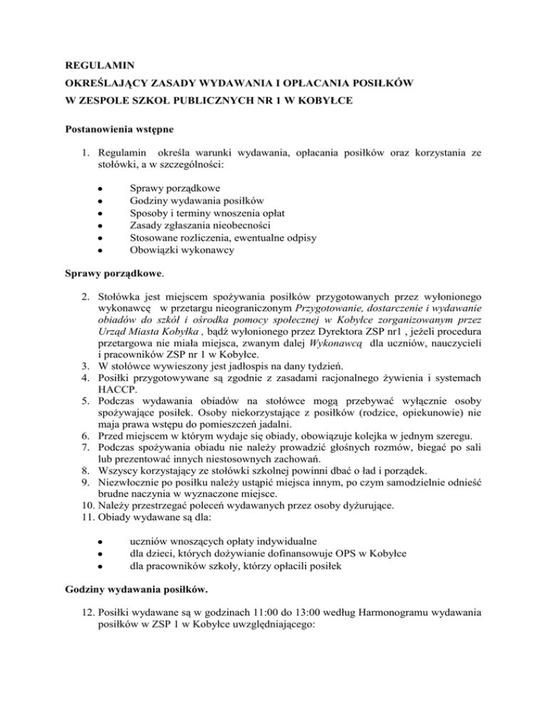 REGULAMIN OKREŚLAJĄCY ZASADY WYDAWANIA I OPŁACANIA POSIŁKÓW W ZESPOLE SZKOŁ PUBLICZNYCH NR 1 W KOBYŁCE Postanowienia wstępne 1. Regulamin określa warunki wydawania, opłacania posiłków oraz korzystania ze stołówki, a w szczególności: Sprawy porządkowe Godziny wydawania posiłków Sposoby i terminy wnoszenia opłat Zasady zgłaszania nieobecności Stosowane rozliczenia, ewentualne odpisy Obowiązki wykonawcy Sprawy porządkowe. 2. Stołówka jest miejscem spożywania posiłków przygotowanych przez wyłonionego wykonawcę w przetargu nieograniczonym Przygotowanie, dostarczenie i wydawanie obiadów do szkół i ośrodka pomocy społecznej w Kobyłce zorganizowanym przez Urząd Miasta Kobyłka , bądź wyłonionego przez Dyrektora ZSP nr1 , jeżeli procedura przetargowa nie miała miejsca, zwanym dalej Wykonawcą dla uczniów, nauczycieli i pracowników ZSP nr 1 w Kobyłce. 3. W stołówce wywieszony jest jadłospis na dany tydzień. 4. Posiłki przygotowywane są zgodnie z zasadami racjonalnego żywienia i systemach HACCP. 5. Podczas wydawania obiadów na stołówce mogą przebywać wyłącznie osoby spożywające posiłek. Osoby niekorzystające z posiłków (rodzice, opiekunowie) nie maja prawa wstępu do pomieszczeń jadalni. 6. Przed miejscem w którym wydaje się obiady, obowiązuje kolejka w jednym szeregu. 7. Podczas spożywania obiadu nie należy prowadzić głośnych rozmów, biegać po sali lub prezentować innych niestosownych zachowań. 8. Wszyscy korzystający ze stołówki szkolnej powinni dbać o ład i porządek. 9. Niezwłocznie po posiłku należy ustąpić miejsca innym, po czym samodzielnie odnieść brudne naczynia w wyznaczone miejsce. 10. Należy przestrzegać poleceń wydawanych przez osoby dyżurujące. 11. Obiady wydawane są dla: uczniów wnoszących opłaty indywidualne dla dzieci, których dożywianie dofinansowuje OPS w Kobyłce dla pracowników szkoły, którzy opłacili posiłek Godziny wydawania posiłków. 12. Posiłki wydawane są w godzinach 11:00 do 13:00 według Harmonogramu wydawania posiłków w ZSP 1 w Kobyłce uwzględniającego: uczniów klas I-III uczniów klas IV – VI uczniów klas I –III gimnazjum uczniów korzystających ze świetlicy szkolnej pracowników szkoły / harmonogram wydawania posiłków ustala Dyrektor ZSP nr 1 na początku roku szkolnego/ 12a. Dopuszcza się wydawanie posiłków w innych godzinach z uwagi na zmianę organizacji pracy szkoły. Zmieniony harmonogram ustala Dyrektor ZSP nr 1 z wykonawcą. Sposoby i terminy wnoszenia opłat. Terminy wpłat na obiady ustala Wykonawca, uwzględniając: umożliwienia dzieciom (posiłki opłacane indywidualnie przez dzieci) opłacanie posiłków w trzech formach: - „abonament” miesięczny – opłacenie „z góry” posiłków w ilości równej liczbie dni (w opłacanym miesiącu), w których dzieci będą szły do szkoły, - „abonament” tygodniowy – opłacenie „z góry” posiłków w ilości równej liczbie dni (w opłacanym tygodniu), w których dzieci będą szły do szkoły, - pojedyncze opłacanie posiłków (zapłata przed wydaniem posiłku). „abonament” będzie miał formę „bonów abonamentowych” wydawanych przez wykonawcę (wzór graficzny przygotuje wybrany wykonawca). Wykonawca umożliwi opłacanie abonamentów (miesięcznego i tygodniowego) również „na konto” (udostępni nr konta), jednak wpłata musi nastąpić najpóźniej tydzień przed opłacanym okresem. W tytule przelewu rodzic wpisze skrót nazwy szkoły, imię i nazwisko dziecka oraz klasę, do której dziecko uczęszcza (np. ZSP1 Jan Kowalski 4a). wykonawca zorganizuje system opłacania posiłków i wydawania „bonów abonamentowych” w sposób nieutrudniajacy wydawanie posiłków i uwzględniający organizację danej szkoły. Zasady zgłaszania nieobecności. 13. W przypadku planowanej nieobecności w szkole należy zgłosić ten fakt przynajmniej 1 dzień wcześniej, a nieplanowanej do godziny 8.00 danego dnia osobiście, pocztą elektroniczną na wskazany adres e-mail lub telefonicznie Wykonawcy . Stosowane rozliczenia, ewentualne odpisy. 14. Wykonawca zobowiązany jest z pobranych należności za wyżywienie w danym miesiącu odliczyć odpisy z tytułu usprawiedliwionej i prawidłowo zgłoszonej nieobecności dziecka w dniu poprzedzającym nieobecność lub do godziny 8.00 w dniu nieobecności. Koszt niewykorzystanych obiadów odliczony będzie przy opłacie za następny miesiąc. Obowiązki wykonawcy 15. Przygotowanie posiłków musi być zgodne z uwzględnieniem norm określonych: - w ustawie z dnia 25 sierpnia 2006 r. o bezpieczeństwie żywności i żywienia (Dz.U. Nr 171 poz. 1225 z późn. zm.) zwanej dalej ustawą o bezpieczeństwie żywności i żywienia (posiłki dostarczane do szkół i OPS), - przez Instytut Żywności i Żywienia Dzieci i Młodzieży (posiłki dostarczane do szkół). 16. Posiłki należy dostarczyć na własny koszt w specjalistycznych termosach posiadających wymagane atesty, gwarantujących utrzymanie odpowiedniej temperatury oraz jakości przewożonych potraw. Samochody do przewozu posiłków muszą być przystosowane do przewozu żywności, spełniać wymagania sanitarnohigieniczne, oraz posiadać niezbędne atesty (jeśli jest to konieczne). 17. Wykonawca zobowiązany będzie do przechowywania z każdego dnia próbek żywnościowych zgodnie z obwiązującymi przepisami prawa. Używane podczas realizacji przedmiotu zamówienia naczynia i sztućce jednorazowe muszą być wykonane z materiału o odpowiedniej grubości, zapewniającej właściwą funkcjonalność. 18. Wybrany wykonawca będzie każdorazowo odbierał powstające odpadki pokonsumpcyjne wraz ze zużytymi naczyniami i sztućcami jednorazowego użytku oraz zagospodarowywał je w sposób zgodny z prawem. 19. Do obowiązków wykonawcy należy estetyczne podawanie posiłków z zachowaniem norm sanitarno-higienicznych. 20. Wykonawca będzie kupował produkty używane do wytwar