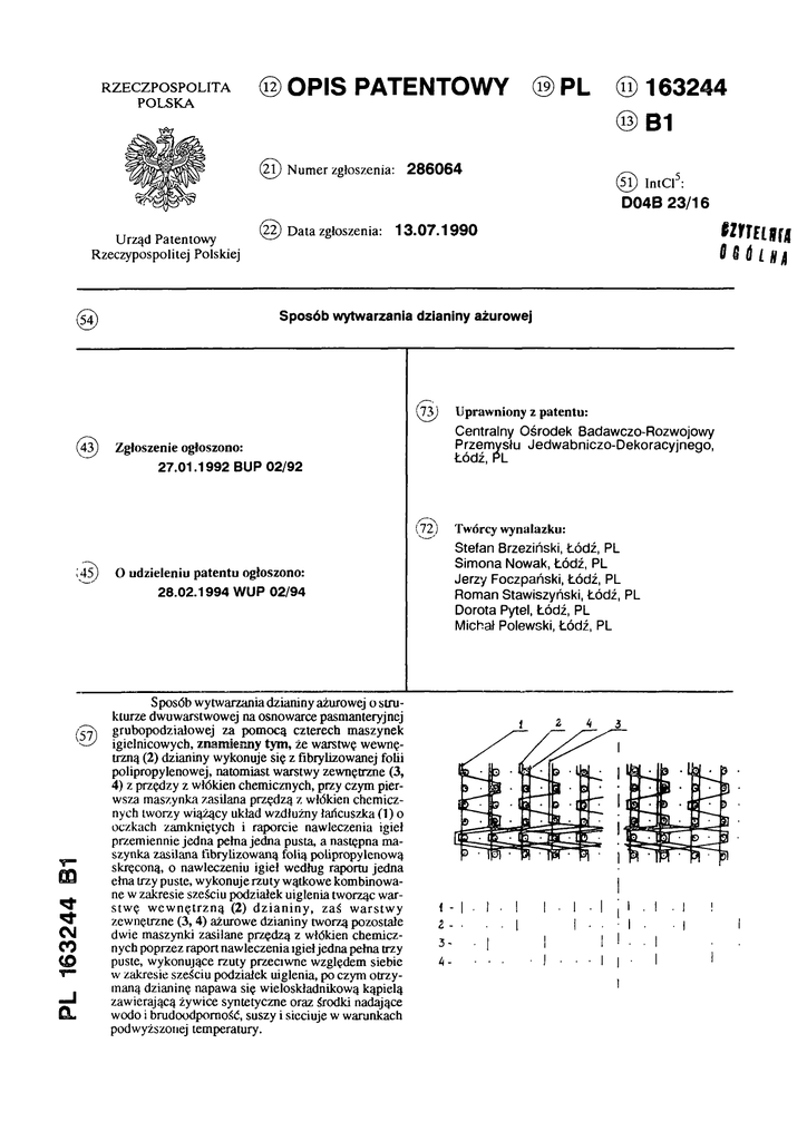 R Z E C Z PO SPO L IT A POLSKA (12) OPIS PATENTOWY (19)PL 286064 (21) Num er zgłoszenia: (11) 163244 (13)B1 (51) IntCl5: D04B 23/16 Urząd Patentowy Rzeczypospolitej Polskiej (22) Data zgłoszenia: 13.07.1990 (54)Sposób wytwarzania dzianiny ażurowej 73) Centralny Ośrodek Badawczo-Rozwojowy Przemysłu Jedwabniczo-Dekoracyjnego, Łódź, PL Zgłoszenie ogłoszono: 27.01.1992 BUP 02/92 72) (45) O udzieleniu patentu ogłoszono: 28.02.1994 WUP 02/94 PL 163244 B1 (57) Sposób wytwarzania dzianiny ażurowej o strukturze dwuwarstwowej na osnowarce pasmanteryjnej grubopodzialowej za pomocą czterech maszynek igielnicowych, znamienny tym, że warstwę wewnętrzną (2) dzianiny wykonuje się z fibrylizowanej folii polipropylenowej, natomiast warstwy zewnętrzne (3, 4) z przędzy z włókien chemicznych, przy czym pierwsza maszynka zasilana przędzą z włókien chemicznych tworzy wiążący układ wzdłużny łańcuszka (1) o oczkach zamkniętych i raporcie nawleczenia igieł przemiennie jedna pełna jedna pusta, a następna maszynka zasilana fibrylizowaną folią polipropylenową skręconą, o nawleczeniu igieł według raportu jedna ełna trzy puste, wykonuje rzuty wątkowe kombinowane w zakresie sześciu podziałek uiglenia tworząc warstw ę w e w n ętrzn ą (2) d z ia n in y , zaś w arstw y zewnętrzne (3, 4) ażurowe dzianiny tworzą pozostałe dwie maszynki zasilane przędzą z włókien chemicznych poprzez raport nawleczenia igieł jedna pełna trzy puste, wykonujące rzuty przeciwne względem siebie w zakresie sześciu podział ek uiglenia, po czym otrzymaną dzianinę napawa się wieloskładnikową kąpielą zawierającą żywice syntetyczne oraz środki nadające wodo i brudoodpomość, suszy i sieciuje w warunkach podwyższonej temperatury. Uprawniony z patentu: Twórcy wynalazku: Stefan Brzeziński, Łódź, PL Simona Nowak, Łódź, PL Jerzy Foczpański, Łódź, PL Roman Stawiszyński, Łódź, PL Dorota Pytel, Łódź, PL Michał Polewski, Łódź, PL Sposób wytwarzania dzianiny ażurowej Zastrzeżenie patentowe Sposób wytwarzania dzianiny ażurowej o strukturze dwuwarstwowej na osnowarce pasmanteryjnej grubopodziałowej za pomocą czterech maszynek igielnicowych, znamienny tym, że warstwę wewnętrzną (2) dzianiny wykonuje się z fibrylizowanej folii polipropylenowej, natomiast warstwy zewnętrzne (3, 4) z przędzy z włókien chemicznych, przy czym pierwsza maszynka zasilana przędzą z włókien chemicznych tworzy wiążący układ wzdłużny łańcuszka (1) o oczkach zamkniętych i raporcie nawleczenia igieł przemiennie jedna pełna jedna pusta, a następna maszynka zasilana fibrylizowaną folią polipropylenową skręconą, o nawleczeniu igieł według raportu jedna ełna trzy puste, wykonuje rzuty wątkowe kombinowane w zakresie sześciu podziałek uiglenia tworząc warstwę wewnętrzną (2) dzianiny, zaś warstwy zewnętrzne (3, 4) ażurowe dzianiny tworzą pozostałe dwie maszynki zasilane przędzą z włókien chemicznych poprzez raport nawleczenia igieł jedna pełna trzy puste, wykonujące rzuty przeciwne względem siebie w zakresie sześciu podziałek uiglenia, po czym otrzymaną dzianinę napawa się wieloskładnikową kąpielą zawierającą żywice syntetyczne oraz środki nadające wodo i brudoodporność, suszy i sieciuje w warunkach podwyższonej temperatury. * * * Przedmiotem wynalazku jest sposób wytwarzania dzianiny ażurowej dwuwarstwowej przeznaczonej zwłaszcza na elementy obuwia. Znany jest sposób wytwarzania taśm ażurowych przeznaczonych na elementy cholewki obuwia technikami tkackimi, dziewiarskimi i plecionkarskimi. Taśmy te wytwarzane są w różnych strukturach i szerokościach z surowców naturalnych lub chemicznych i stosowane są bez podszewek lub z podszewkami na elementy konstrukcyjne obuwia paskowego. Z opisu patentowego polskiego nr 141 378 znany jest sposób wytwarzania obuwiowej taśmy ażurowej z przędzy syntetycznej na osnowarkach koronkarskich z wykorzystaniem czterech maszynek igielnicowych. Sposób ten pozwala na wytworzenie odpasowanej taśmy jednowarstwowej. Znany jest również sposób wytwarzania wyrobów obuwniczych z materiału wielowarstwowego uzyskiwanego poprzez łączenie termiczne lub klejenie kilku warstw tkanin lub dzianin. Obuwie wykonane z wielowarstwowych materiałów klejonych cechuje ogólnie niskie własności użytkowe oraz higieniczne, a przede wszystkim nierozpuszczalność potu i duże usztywnienie, w zasadniczy sposób obniżające komfort użytkowania, jak też szybką deformację obuwia wynikającą z miejscowych uszkodzeń klejów warstwy łączącej w rezultacie wielokrotnego zginania. Tkaniny, dzianiny czy też taśmy obuwnicze ze względu na warunki użytkowania i konserwacji winny posiadać wysoką trwałość użytkową, a więc odporność mechaniczną głównie na ścinanie i zginanie, odporność na działanie czynników zewnętrznych, a jednocześnie dobre własności higieniczne, a przede wszystkim zdolność odprowadzania potu wydzielanego przez nogę, jak też odpowiednią miękkość. Spełnienie tych zróżnicowanych wymagań jest niemożliwe przy zastosowaniu do wytworzenia wyrobu tylko jednego rodzaju włókien, jak również klejonych czy termicznie zgrzewanych wyrobów wielowarstwowych. Możliwości takie stwarza natomiast łączenie: odpowiedni dobór rodzajów i udziałów włókien, struktura wyrobu oraz technologia jego wykończenia. Celem wynalazku jest opracowanie sposobu wytwarzania dzianiny ażurowej o specjalnym splocie dziewiarskim dającym strukturę dwuwarstwową z włókien o różnych właściwościach fizykomechanicznych, które w połączeniu dają wyrób o odpowiedniej przewiewności, miękkości, wykazujący wysoką zdolność odprowadzania potu z jednoczesną odpornością na działanie bakterii i o wysokiej estetyce, przy czym warstwa zewnętrzna wykonana jest z przędzy z włókien 163 244 3 chemicznych, na przykład poliestrowych, a warstwa wewnętrzna z fi