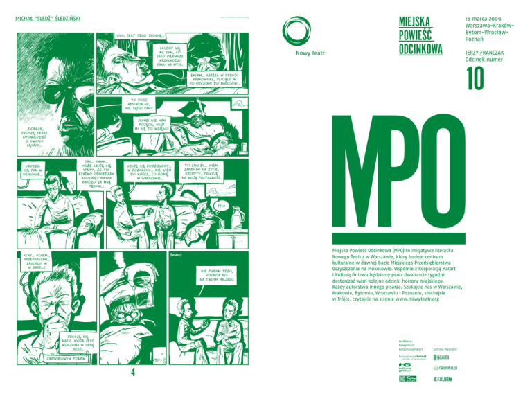 Michał “Sledź” śledziński design: Pionty/brothersinarms.com.pl Miejska Powieść Odcinkowa 16 marca 2009 Warszawa-KrakówBytom-WrocławPoznań JERZY franczak Odcinek numer 10 Miejska Powieść Odcinkowa (MPO) to inicjatywa literacka Nowego Teatru w Warszawie, który buduje centrum kulturalne w dawnej bazie Miejskiego Przedsiębiorstwa Oczyszczania na Mokotowie. Wspólnie z Korporacją Ha!art i Kulturą Gniewu będziemy przez dwanaście tygodni dostarczać wam kolejne odcinki horroru miejskiego. Każdy autorstwa innego pisarza. Szukajcie nas w Warszawie, Krakowie, Bytomiu, Wrocławiu i Poznaniu, słuchajcie w Trójce, czytajcie na stronie www.nowyteatr.org wydawcy: Nowy Teatr Korporacja Ha!art 4 patroni medialni: Jej ledwie słyszalnemu westchnieniu towarzyszył inny odgłos, jakby zgrzyt obracających się trybów. Niebo zwaliste i smoliste zniżało się jak opuszczany plafon i po chwili nade mną jarzyły się już tylko te dwie księżycowe litery… jak tajemny szyfr. Tylko co miałby oznaczać? „Carbon Copy” – że wszystko się zdwaja, niczym odbite przez kalkę? Albo „CopyCat” – że niby chodzi o samowolne kopiowanie się istot żywych? A może „Creative Commons” – czyli wolna licencja do bzdurzenia dla stwórców tego uniwersum? Bo cały ten świat był spartaczony, zniszczony przez zastęp złośliwych demonów. Nie było jednak czasu na łamanie szyfru, bo ciemność poczęła się przemazywać i wkrótce wypłukały się z niej jakieś niewyraźne kształty, a przez ciszę przebiły się ludzkie głosy: „Żyje?”. „Mówiłem ci, żebyś go nie ruszał”. „Weźmy go ze sobą, tam każdy się może przydać”. Ktoś uderzył mnie w twarz, raz i drugi, ktoś schwycił mnie mocno i posadził – aż otworzyłem oczy… i natychmiast je zamknąłem. Znajdowałem się pośrodku morza ruin: otaczał mnie gruz i pył, zwały betonu i krwawej cegły, poprzetykane szczątkami ścian i kikutami kolumn. Cała Warszawa zmiażdżona, rozkruszona, obrócona w proch – ten obraz drgał mi pod powiekami i wiem dobrze, że będzie mnie prześladował do końca życia. Bo obraz to porażający i nie do zniesienia, nawet dla takiego krakusa jak ja. – Co się ze mną stało? – wyszeptałem i natychmiast przypomniała mi się moja mistyczna podróż do krainy zmarłych, z przeprawą przez Styks – a może to była wanna? – i z przesiadką w nocnym klubie… – Był pan nieprzytomny – stwierdził rzeczowo jakiś głos. Otwarłem oczy i stwierdziłem, że należy do małego gnypka z czerniawym wąsikiem. – Niech go pan nie słucha – odezwał się ktoś z tyłu. – Wszyscy przeżyliśmy to samo. Chociaż każdy co innego. Odwróciłem się, sycząc z bólu, gdyż uczułem potężne ukłucie w klatce piersiowej, i ujrzałem drobnego, cherubinkowatego blondynka o kręconych włoskach. – Taa, co innego – odszczeknął chłopaczek w tiszercie z Che. – Ten koleś nic nie kmini! Tamten mundurowy marzy tylko, żeby kogoś spałować. A my tu mamy nareszcie frontalną konfrontację. – Te światy nakładają się na siebie – perorował dalej cherubinek. – Jeden czas przenika drugi, jedna przestrzeń miażdży drugą … Jakoś tak. Dokładnie nie wiadomo. Miasto raz jest zrujnowane, a raz stoi jakby nigdy nic. Widzisz tę dziewczynę? Teraz wydaje się martwa, normalnie na pół przecięta, ale przed chwilą widziałem, jak wchodziła do sklepu muzycznego. – To wszystko do chuja niepodobne – mówi Godzięba, czyli pułkownik, którego imię powróciło do mnie w nagłym błysku. – Poza tym szkoda czasu na teorię. – Tu nie chodzi o teorię, chodzi o postrzegalne – zaoponował blondasek. – Pękła jakaś granica. Coś przesącza się do naszego świata, a my narzucamy temu znane kształty. – Czyli świat wokół nas – zacząłem zdławionym głosem – to jakby nasze własne… – Nasze własne lęki – dokończył z satysfakcją cherubinek. – Widzisz, ludzie boją się na ogół kataklizmu, boją się też duchów, potworów i zombich… – Albo armii podziemnej – dorzucił głupkowato pułkownik. – Albo kobiet – zachichotał ktoś inny. Głos wydał się znajomy. Spojrzałem w jego stronę – i osłupiałem. To ja siedziałem obok siebie! Tuż koło mnie przycupnął mój sobowtór! Lustrzane odbicie, klon, zdarta ze mnie skóra! Wpatrywałem się w jego twarz – a skórę rzeczywiście miał trochę zdartą, twarz pokiereszowaną, jedno oko wyłupione – a poza tym wykapany ja. Siedział, trzymał się za brzuch i patrzył na mnie tak samo jak ja na niego. Po chwili jednak pod moim natarczywym wejrzeniem zaczął leciutko rozmazywać się, przeświecać i falować, jak zjawa albo hologram. – Oj, niedobrze, niedobrze – zawołał Che, przestępując z nogi na nogę.– Coś tu się zaraz zacznie. On jest z przyszłości, więc… Przeszły mnie ciarki; więc tak będę wyglądał? To właśnie mi się stanie? Coś albo ktoś wyłupi mi oko, zmasakruje, wypruje bebechy? Zesztywniałem cały z panicznego strachu, podczas gdy Che wskoczył na ruinkę i rozglądnął się bystro po okolicy. – Miasto powraca! – zawołał rozpaczliwie. I rzeczywiście, na horyzoncie wystrzeliły latarnie, Katedra Świętego Jana poczęła podnosić się z gruzów, fasady kamienic rosły i krzepły, przed pączkującymi witrynami sklepów i kawiarń przystawali pierwsi przechodnie. Che z przerażeniem wpatrywał się ten matriks, w ten samoodnowiający się miraż, w duchową nędzę powstającą z kolan. Pułkownik i staruszka wyraźnie ożywili się na ten widok, cherubinek aż przysiadł z wrażenia, za to mój sobowtór bladł i ewidentnie znikał. Zrozumiałem, że nie ma chwili do stracenia. – Co się wydarzy? To znaczy wydarzyło? – pochyliłem się nad nim, zatykając nos, gdyż uderzył mnie fetor rozkładającego się ciała. – Kto ci to zrobił? – wskazałem palcem na pusty oczodół i na rozpłatany brzuch. Popatrzy
