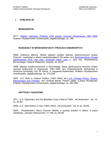 dr Marcin Fatalski Instytut Amerykanistyki i Studiów Polonijnych I. Działalność naukowa Stan na 01/06/2013 PUBLIKACJE MONOGRAFIE 2011, Widmo rewolucji. Polityka USA wobec Ameryki Południowej 1961-1968, Kraków: Wydawnictwo Uniwersytetu Jagiellońskiego, ss. 165. ROZDZIAŁY W MONOGRAFIACH I PRACACH ZBIOROWYCH 2009, Doktryna Manna. Wokół założeń polityki Stanów Zjednoczonych wobec Ameryki Łacińskiej w latach sześćdziesiątych XX wieku, [w:] Amerykomania. Księga jubileuszowa Prof. dra hab. Andrzeja Mani, tom 1, pod red. Włodzimierza Bernackiego i Adama Walaszka, Kraków, ss. 85-97. 2008, Między antykomunizmem a demokracją: Stany Zjednoczone Ameryki wobec sytuacji politycznej w Argentynie 1961-1963, [w:] Doświadczenie demokracji w Ameryce Łacińskiej, red. M. Kania, A. Kaganiec-Kamieńska, Kraków: Wydawnictwo Uniwersytetu Jagiellońskiego, ss. 215-226. 2007, U.S. Role in Chilean Politics (1961-1964), [w:] U.S. Foreign Policy: Theory, Mechanisms and Practice, red. Andrzej Mania, Paweł Laidler, Łukasz Wordliczek, Kraków: Wydawnictwo Uniwersytetu Jagiellońskiego, ss. 283-290. ARTYKUŁY NAUKOWE 2011, U.S. Diplomacy and the Brazilian Coup d’état of 1964, „Ad Americam”, vol. 12, ss. 53-62. 2005, U.S. Intervention in Iran (1950-1953), „Ad Americam”, vol. 6, ss. 39-48. 2004, Podsekretarz Stanu Sumner Welles a sprawy polskie w latach II wojny światowej, „Zeszyty Historyczne”, nr 148, ss. 65-98. 1 dr Marcin Fatalski Instytut Amerykanistyki i Studiów Polonijnych II. Działalność naukowa Stan na 01/06/2013 WYSTĄPIENIA KONFERENCYJNE 2013, USA wobec odrodzenia lewicowego populizmu w Ameryce Łacińskiej, referat wygłoszony podczas konferencji „Ameryka Łacińska w stosunkach międzynarodowych”, Instytut Nauk Politycznych i Stosunków Międzynarodowych, Uniwersytet Jagielloński, Kraków, 14 stycznia. 2012, Komunikat na konferencji „Edward Rydz-Śmigły (1886-1941), trzeci marszałek Polski Niepodległej w siedemdziesiątą rocznicę śmierci", Instytut Historii, Uniwersytet Jagielloński, 29 marca. 2009, The Limits of Democratization: U.S. Policy toward Latin America during the Cold War, referat wygłoszony podczas konferencji „The United States and the World: from Imitation to Challenge”, Instytut Amerykanistyki i Studiów Polonijnych, Uniwersytet Jagielloński, Kraków, 29-30 maja. 2008, Dylematy stosunków polsko-amerykańskich w przeszłości i dziś, referat wygłoszony podczas konferencji “Dylematy dyplomacji polskiej”, Wyższa Szkoła Biznesu-National Louis University, Nowy Sącz. 2007, Między antykomunizmem a demokracją: Stany Zjednoczone Ameryki wobec sytuacji politycznej w Argentynie 1961-1963, referat wygłoszony podczas konferencji “Doświadczenie demokracji w Ameryce Łacińskiej”, Uniwersytet Jagielloński, Kraków, 19-20 października. 2007, The Role of the United States in Chilean Politics 1961-1964, referat wygłoszony podczas konferencji „U.S. Foreign Policy. Theory, Mechanisms, Practice”, Instytut Amerykanistyki i Studiów Polonijnych, Uniwersytet Jagielloński, Kraków, 25-27 maja. 2