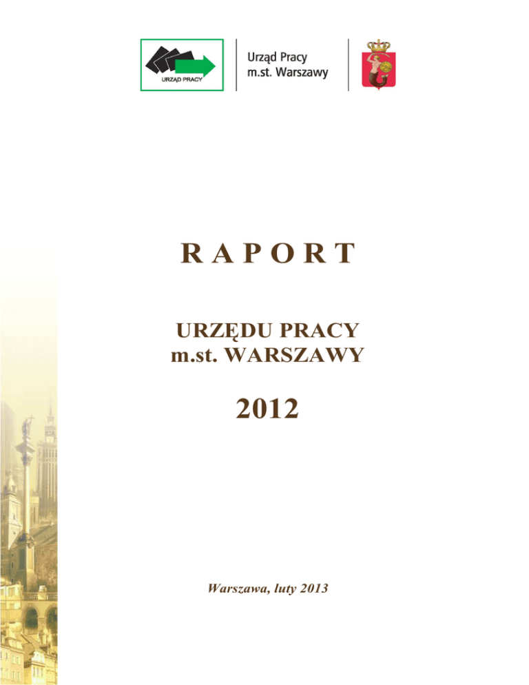 RAPORT URZĘDU PRACY m.st. WARSZAWY 2012 Warszawa, luty 2013 SPIS TREŚCI 1. MISJA, STATUS PRAWNY I ZADANIA URZĘDU ……………... 2 2. WARSZAWSKI RYNEK PRACY ……………………………..…... 9 3. AKTYWIZACJA RYNKU PRACY ………………..……………..... 84 4. PROJEKTY FINANSOWANE ZE ŚRODKÓW UNIJNYCH ….….. 127 5. OBSŁUGA INTERESANTÓW ……………………………………... 129 6. PLAN FINANSOWY URZĘDU PRACY m.st. WARSZAWY ….…. 133 7. FUNDUSZ PRACY …………………………………………………... 149 8. KADRY …………………….……………………………………….... 158 9. RADA ZATRUDNIENIA m.st. WARSZAWY …………………..… 164 Raport Urzędu Pracy m.st. Warszawy – 2012 r. 1 1. MISJA, STATUS PRAWNY I ZADANIA URZĘDU 1.1 STRATEGIA MIASTA i MISJA URZĘDU Misją Urzędu Pracy m.st. Warszawy jest promocja zatrudnienia i aktywizacja zawodowa Klientów Urzędu, w tym: o udzielanie pomocy bezrobotnym i poszukującym pracy w znalezieniu zatrudnienia, o udzielanie pomocy pracodawcom w pozyskiwaniu odpowiednich pracowników. Realizacja misji ma na celu, przede wszystkim, uzyskanie zadowolenia Klientów poprzez sprawną i terminową obsługę, dopasowaniu oferty świadczonych usług do potrzeb Klientów oraz kształtowanie wizerunku instytucji niosącej pomoc, solidnej, Ŝyczliwej i otwartej dla Klientów. Urząd Pracy m.st. Warszawy realizuje swoją misję poprzez: 1) podejmowanie działań zmierzających do promocji zatrudnienia, przeciwdziałania bezrobociu i jego negatywnym skutkom, 2) pozyskiwanie i gospodarowanie środkami finansowymi na promocję zatrudnienia oraz aktywizację lokalnego rynku pracy, 3) organizowanie i finansowanie programów rynku pracy, 4) współpracę z partnerami społecznymi, organizacjami, instytucjami, jednostkami samorządu terytorialnego w zakresie promocji zatrudnienia, 5) kompetentne załatwianie spraw wpływających do Urzędu w trybie i terminach określonych przepisami obowiązującego prawa, 6) zapewnienie Klientom kompleksowej informacji dotyczącej realizowanych zadań i załatwianych przez Urząd spraw, 7) spełnianie wymagań określonych w dokumentach wewnętrznych i zewnętrznych oraz innych oczekiwań Klientów, 8) integrację warszawskiego rynku pracy z rynkiem Unii Europejskiej, 9) gromadzenie i wykorzystanie wiedzy o potrzebach i oczekiwaniach Klientów do doskonalenia świadczonych usług, 10) wdroŜenie, utrzymanie i ciągłą poprawę efektywności systemu zarządzania jakością, 11) stałe podnoszenie kwalifikacji i wiedzy wszystkich pracowników zatrudnionych w Urzędzie. Urząd Pracy m.st. Warszawy realizując swoje zadania uwzględniając Społeczną Strategię Warszawy - Strategię Rozwiązywania Problemów Społecznych na lata 2009-2020, która została uchwalona przez Radę m.st. Warszawy 18 grudnia 2008 roku. Jest ona waŜnym przesłaniem dla obywateli i partnerów społecznych oraz gospodarczych działających w Warszawie. Przedstawiciele Urzędu brali udział nie tylko w tworzeniu Strategii, ale równieŜ biorą udział w jej realizacji. Raport Urzędu Pracy m.st. Warszawy – 2012 r. 2 Cele Społecznej Strategii Warszawy Cel główny Warszawa wybiera drogę rozwoju wykorzystującą potencjał społeczny miasta, dającą ludziom perspektywę dobrego Ŝycia i samorealizacji. Drogę równego dostępu do moŜliwości, partnerstwa i aktywności społecznej. Drogę, która umiejętnie łączy przestrzenie wielkomiejskiej atrakcyjności z klimatem bycia „u siebie”. Drogę przeciwdziałania wszelkim formom wykluczenia. Warszawa będzie miastem: • powiązanym ze swoim otoczeniem, integrującą się Europą i światem oraz współdziałającym z innymi miastami; • związanym ze swoją historią – łączącym w jedno przeszłość, współczesność i przyszłość; • spójnym wewnętrznie w wymiarze społecznym, przestrzennym i gospodarczym; • sprzyjającym powstawaniu więzi i interakcji społecznych we wszystkich elementach i na wszystkich poziomach swej struktury; • dbającym o wzrost zgodnie z zasadami zrównowaŜonego rozwoju i racjonalnie gospodarującym zasobami; • łączącym innowacyjność z dobrą organizacją i udziałem mieszkańców w kreowaniu nowych rozwiązań; • promującym i wprowadzającym w Ŝycie idee społeczeństwa obywatelskiego, miasta otwartego, m.in. na wielokulturowość jego mieszkańców; • przyjaznym dla mieszkańców (w tym osób starszych, niepełnosprawnych), reagującym na wszelkie przejawy wykluczenia społecznego, akcentującym rolę profilaktyki zdrowotnej; • i gwarantującym konstytucyjny, „równy dostęp do świadczeń opieki zdrowotnej finansowanej ze środków publicznych”. W ramach realizacji Strategii powstały zespoły zadaniowe pracujące w następujących obszarach: Rodzina, Niepełnosprawność, Seniorzy, Praca. Dodać naleŜy, Ŝe Koordynatorem Programu Praca jest Lech Antkowiak, Zastępca Dyrektora Urzędu Pracy m.st. Warszawy. Program Praca to robocza nazwa dla inicjatywy traktującej łącznie Program Operacyjny Rozwój, Aktywność, Samodzielność i Program monitorowania zwolnień pracowników. Bazą dla Prac zespołu są materiały opracowane podczas prac nad przygotowaniem Społecznej Strategii Warszawy. Po wstępnych dyskusjach podjęto pracę w podzespołach, które określiły cztery priorytety i w ich ramach wskazały szczegółowe zagadnienia. I. Priorytet aktywizacji zawodowej kobiet: • nowatorskie inicjatywy w zakresie aktywizacji zawodowej kobiet • sytuacja młodych matek na rynku pracy, • oferty dla kobiet, które nie są klientami pomocy społecznej oraz Urzędu Pracy, propozycje ukierunkowane na wzmocnienie pozycji i rozwój kompetencji zawodowych kobiet, • sytuacja kobiet poszukujących pracy w grupie 50+, • rozwój Ŝłobków i innych form opieki nad małym dzieckiem warunkiem aktywizacji Raport Urzędu Pracy m.st. Warszawy – 2012 r. 3 zawodowej kobiet, • przy