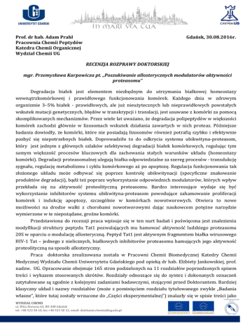 Prof. dr hab. Adam Prahl Pracownia Chemii Peptydów Katedra Chemii Organicznej Wydział Chemii UG Gdańsk, 30.08.2016r. RECENZJA ROZPRAWY DOKTORSKIEJ mgr. Przemysława Karpowicza pt. „Poszukiwanie allosterycznych modulatorów aktywności proteasomu” Degradacja białek jest elementem niezbędnym do utrzymania białkowej homeostazy wewnątrzkomórkowej i prawidłowego funkcjonowania komórek. Każdego dnia w zdrowym organizmie 3–5% białek - prawidłowych, ale już nieużytecznych lub nieprawidłowych powstałych wskutek mutacji genetycznych, błędów w transkrypcji i translacji, jest usuwane z komórki za pomocą skomplikowanych mechanizmów. Przez wiele lat uważano, że degradacja polipeptydów w większości komórek zachodzi głównie w lizosomach wskutek działania zawartych w nich proteaz. Późniejsze badania dowiodły, że komórki, które nie posiadają lizosomów również potrafią szybko i efektywnie pozbyć się niepotrzebnych białek. Doprowadziło to do odkrycia systemu ubikwityna-proteasom, który jest jednym z głównych szlaków selektywnej degradacji białek komórkowych, regulując tym samym większość procesów kluczowych dla zachowania stałych warunków układu (homeostazy komórki). Degradacji proteasomalnej ulegają białka odpowiedzialne za szereg procesów - transdukcję sygnału, regulację metabolizmu i cyklu komórkowego aż po apoptozę. Regulacja funkcjonowania tak złożonego układu może odbywać się poprzez kontrolę ubikwitynacji (specyficzne znakowanie produktów degradacji), bądź też poprzez wykorzystanie odpowiednich modulatorów, których wpływ przekłada się na aktywność proteolityczną proteasomu. Bardzo interesujące wydaje się być wykorzystanie inhibitorów systemu ubikwityna-proteasom powodujące zahamowanie proliferacji komórek i indukcję apoptozy, szczególnie w komórkach nowotworowych. Otwiera to nowe możliwości na drodze walki z chorobami nowotworowymi dając naukowcom potężne narzędzie wymierzone w te niepożądane, groźne komórki. Przedstawiona do recenzji praca wpisuje się w ten nurt badań i poświęcona jest znalezieniu modyfikacji struktury peptydu Tat1 pozwalających mu hamować aktywność ludzkiego proteasomu 20S w oparciu o modulację allosteryczną. Peptyd Tat1 jest aktywnym fragmentem białka wirusowego HIV-1 Tat – jednego z nielicznych, białkowych inhibitorów proteasomu hamujących jego aktywność proteolityczną na sposób allosteryczny. Praca doktorska zrealizowana została w Pracowni Chemii Biomedycznej Katedry Chemii Medycznej Wydziału Chemii Uniwersytetu Gdańskiego pod opieką dr hab. Elżbiety Jankowskiej, prof. nadzw. UG. Opracowanie obejmuje 165 stron podzielonych na 11 rozdziałów poprzedzonych spisem treści i wykazem stosowanych skrótów. Rozdziały odnoszące się do syntez i dokonanych oznaczeń zatytułowane są zgodnie z kolejnymi zadaniami badawczymi, stojącymi przed Doktorantem. Bardziej klasyczny układ i nazwy rozdziałów (może z pominięciem rozdziału tytułowanego zwykle „Badania własne”, które tutaj zostały wrzucone do „Części eksperymentalnej”) znalazły się w spisie treści jako WYDZIAŁ CHEMII ul. Wita Stwosza 63, 80-308 Gdańsk tel. +48 523 50 10, fax +48 523 50 12, email: [email protected] dodatkowy element organizacji struktury pracy. Całość rozprawy opatrzona jest 59 rysunkami i 11 tabelami. Szata graficzna opracowania jest na wysokim poziomie, zamieszczone rysunki, schematy i tabele są przygotowane bardzo starannie. Jedyna wpadka, jaką zauważyłem to rysunek nr 44 na str. 118 przedstawiający trzy widma masowe – dwa pierwsze z nich są zupełnie nieczytelne (chodzi o przypisanie wartości odpowiednim pikom). Mała niekonsekwencja dotyczy też rozgraniczenia pomiędzy tabelami i rysunkami. Na stronach od 124 do 126 znalazły się zdjęcia przedstawiające obrazy mikroskopowe odnoszące się do badań cytotoksycznych wybranych analogów względem komórek nowotworowych HeLa zebrane i zatytułowane jako Tabela 11. Natomiast zdjęcia żeli np. ze strony 115 są rysunkiem (nr 41). Pierwszą część pracy stanowi rozdział „Wstęp literaturowy” (43 strony) poświęcony przybliżeniu tematyki i przedmiotu badań. Doktorant skoncentrował się w nim na budowie i aktywności proteasomu, sposobach jego aktywacji oraz funkcji jaką pełni w układach biologicznych. Rozdział kończy się krótkim opisem schorzeń spowodowanych zaburzeniami w funkcjonowaniu proteasomu oraz perspektywami wykorzystania go jako celu farmakologicznego. Ta część pracy napisana jest bardzo przystępnie, w formie i objętości adekwatnej do tego typu opracowań. Po wstępie literaturowym następuje krótki rozdział „Cel pracy”, w którym wymienione zostały wszystkie zaplanowane do syntezy analogi i krótko scharakteryzowane badania zaplanowane do realizacji z ich wykorzystaniem. Zapoznając się z tą częścią pracy nie do końca można zrozumieć co i dlaczego Doktorant zamierza wykonać w trakcie realizacji badań – chodzi o dobór analogów. Oczywiście te wyjaśnienia zawarte są w dalszej części opracowania, pytanie czy nie powinny znaleźć się w tym właśnie miejscu (chodzi o dwa słowa komentarza odnośnie takiego a nie innego skanu alaninowego i doboru modyfikacji wymuszającej odpowiednią konformację łańcucha peptydowego). Kolejną część pracy stanowią rozdziały (3-8) związane z opisem wykonanych syntez i oznaczeń mających na celu: − otrzymanie 37 analogów peptydu Tat1; − zbadanie wpływu otrzymanych analogów na modulację aktywności proteasomu z wykorzystaniem odpowiednich substratów fluorogenicznych; − zbadanie stabilności badanych analogów w obecności proteasomu; − zbadanie wpływu peptydu Tat1 na modulację proteasomu pochodzącego z drożdży; − zbadanie wpływu peptydu Tat1 i jego wybranych analogów na degradację modelowego substratu białkowego (α-synukleiny) przez proteasom; − określenie cytotok