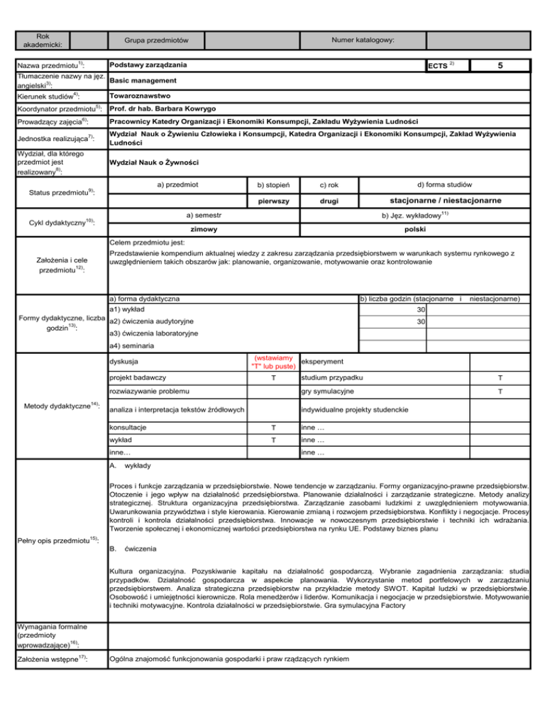 Podstawy zarządzania - Wydział Nauk o Żywności SGGW