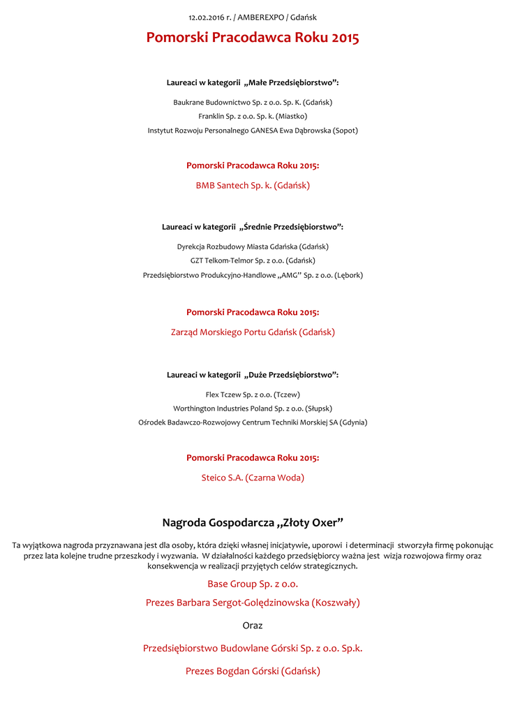 12.02.2016 r. / AMBEREXPO / Gdańsk Pomorski Pracodawca Roku 2015 Laureaci w kategorii „Małe Przedsiębiorstwo”: Baukrane Budownictwo Sp. z o.o. Sp. K. (Gdańsk) Franklin Sp. z o.o. Sp. k. (Miastko) Instytut Rozwoju Personalnego GANESA Ewa Dąbrowska (Sopot) Pomorski Pracodawca Roku 2015: BMB Santech Sp. k. (Gdańsk) Laureaci w kategorii „Średnie Przedsiębiorstwo”: Dyrekcja Rozbudowy Miasta Gdańska (Gdańsk) GZT Telkom-Telmor Sp. z o.o. (Gdańsk) Przedsiębiorstwo Produkcyjno-Handlowe „AMG” Sp. z o.o. (Lębork) Pomorski Pracodawca Roku 2015: Zarząd Morskiego Portu Gdańsk (Gdańsk) Laureaci w kategorii „Duże Przedsiębiorstwo”: Flex Tczew Sp. z o.o. (Tczew) Worthington Industries Poland Sp. z o.o. (Słupsk) Ośrodek Badawczo-Rozwojowy Centrum Techniki Morskiej SA (Gdynia) Pomorski Pracodawca Roku 2015: Steico S.A. (Czarna Woda) Nagroda Gospodarcza „Złoty Oxer” Ta wyjątkowa nagroda przyznawana jest dla osoby, która dzięki własnej inicjatywie, uporowi i determinacji stworzyła firmę pokonując przez lata kolejne trudne przeszkody i wyzwania. W działalności każdego przedsiębiorcy ważna jest wizja rozwojowa firmy oraz konsekwencja w realizacji przyjętych celów strategicznych. Base Group Sp. z o.o. Prezes Barbara Sergot-Golędzinowska (Koszwały) Oraz Przedsiębiorstwo Budowlane Górski Sp. z o.o. Sp.k. Prezes Bogdan Górski (Gdańsk)