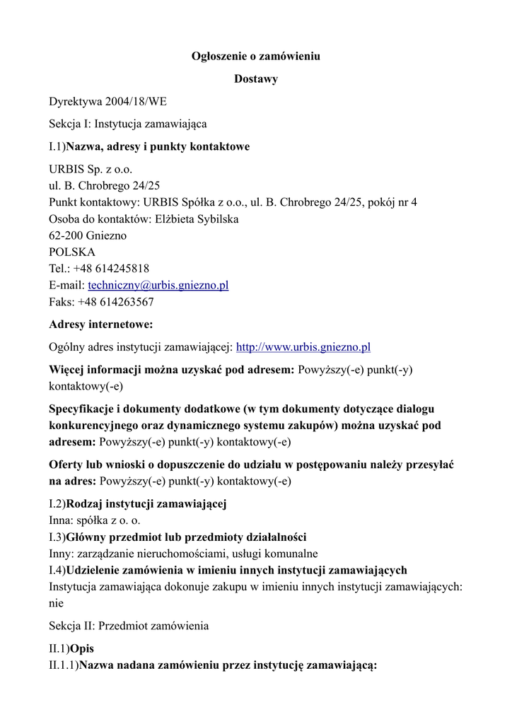 Ogłoszenie o zamówieniu Dostawy Dyrektywa 2004/18/WE Sekcja I: Instytucja zamawiająca I.1)Nazwa, adresy i punkty kontaktowe URBIS Sp. z o.o. ul. B. Chrobrego 24/25 Punkt kontaktowy: URBIS Spółka z o.o., ul. B. Chrobrego 24/25, pokój nr 4 Osoba do kontaktów: Elżbieta Sybilska 62-200 Gniezno POLSKA Tel.: +48 614245818 E-mail: [email protected] Faks: +48 614263567 Adresy internetowe: Ogólny adres instytucji zamawiającej: http://www.urbis.gniezno.pl Więcej informacji można uzyskać pod adresem: Powyższy(-e) punkt(-y) kontaktowy(-e) Specyfikacje i dokumenty dodatkowe (w tym dokumenty dotyczące dialogu konkurencyjnego oraz dynamicznego systemu zakupów) można uzyskać pod adresem: Powyższy(-e) punkt(-y) kontaktowy(-e) Oferty lub wnioski o dopuszczenie do udziału w postępowaniu należy przesyłać na adres: Powyższy(-e) punkt(-y) kontaktowy(-e) I.2)Rodzaj instytucji zamawiającej Inna: spółka z o. o. I.3)Główny przedmiot lub przedmioty działalności Inny: zarządzanie nieruchomościami, usługi komunalne I.4)Udzielenie zamówienia w imieniu innych instytucji zamawiających Instytucja zamawiająca dokonuje zakupu w imieniu innych instytucji zamawiających: nie Sekcja II: Przedmiot zamówienia II.1)Opis II.1.1)Nazwa nadana zamówieniu przez instytucję zamawiającą: Dostawa fabrycznie nowych (produkcja 2016 R.) samochodów specjalistycznych – śmieciarek na podwoziu trzyosiowym w formie leasingu operacyjnego – 3 szt. II.1.2)Rodzaj zamówienia oraz lokalizacja robót budowlanych, miejsce realizacji dostawy lub świadczenia usług Dostawy Główne miejsce lub lokalizacja robót budowlanych, miejsce realizacji dostawy lub świadczenia usług: URBIS Sp. z o.o., 62-200 Gniezno, ul. B. Chrobrego 24/25. Kod NUTS II.1.3)Informacje na temat zamówienia publicznego, umowy ramowej lub dynamicznego systemu zakupów (DSZ) Ogłoszenie dotyczy zamówienia publicznego II.1.4)Informacje na temat umowy ramowej II.1.5)Krótki opis zamówienia lub zakupu Dostawa 3 szt. samochodów do zbierania i transportu odpadów – śmieciarek w formie leasingu operacyjnego Samochody winny być samochodami fabrycznie nowymi. Samochody winny posiadać polskie świadectwa homologacji wydane przez ustawowo uprawniony organ lub odpis decyzji zwalniającej z obowiązku uzyskania świadectwa homologacji, wydane zgodnie z przepisami o ruchu drogowym, powinny odpowiadać wymogom wyrobów dopuszczonych do obrotu na terenie kraju i posiadać wymagane prawem lub przepisami dokumenty, dokument określający warunki gwarancji i serwisu pogwarancyjnego, instrukcję obsługi, dokumenty niezbędne do rejestracji pojazdu, sporządzone w języku polskim. Udzielona przez Wykonawcę gwarancja na kompletny pojazd nie może być krótsza niż 24 miesięcy. Możliwość wykupu po zakończeniu 36 miesięcznej umowy leasingowej. II.1.6)Wspólny Słownik Zamówień (CPV) 34144511, 34100000 II.1.7)Informacje na temat Porozumienia w sprawie zamówień rządowych (GPA) Zamówienie jest objęte Porozumieniem w sprawie zamówień rządowych (GPA): nie II.1.8)Części To zamówienie podzielone jest na części: nie II.1.9)Informacje o ofertach wariantowych Dopuszcza się składanie ofert wariantowych: nie II.2)Wielkość lub zakres zamówienia II.2.1)Całkowita wielkość lub zakres: Dostawa fabrycznie nowych (produkcja 2016 r.) samochodów specjalistycznych – śmieciarek na podwoziu trzyosiowym w formie leasingu operacyjnego – 3 szt. Szacunkowa wartość bez VAT: 2 100 000 PLN II.2.2)Informacje o opcjach Opcje: nie II.2.3)Informacje o wznowieniach Jest to zamówienie podlegające wznowieniu: nie II.3)Czas trwania zamówienia lub termin realizacji Okres w miesiącach: 2 (od udzielenia zamówienia) Sekcja III: Informacje o charakterze prawnym, ekonomicznym, finansowym i technicznym III.1)Warunki dotyczące zamówienia III.1.1)Wymagane wadia i gwarancje: 1. Warunkiem udziału w postępowaniu jest wniesienie wadium w wysokości 50 000 PLN (słownie: pięćdziesiąt tysięcy złotych), w terminie do dnia 09.03.2016 r. przelewem na rachunek Zamawiającego w PKO BP SA O/ Gniezno nr 90 1020 4027 0000 1102 1307 9308. Za datę wniesienia wadium uważa się datę wpływu środków finansowych na rachunek Zamawiającego. III.1.2)Główne warunki finansowe i uzgodnienia płatnicze i/lub odniesienie do odpowiednich przepisów je regulujących: Leasing operacyjny na 36 miesięcy. III.1.3)Forma prawna, jaką musi przyjąć grupa wykonawców, której zostanie udzielone zamówienie: III.1.4)Inne szczególne warunki Wykonanie zamówienia podlega szczególnym warunkom: nie III.2)Warunki udziału III.2.1)Sytuacja podmiotowa wykonawców, w tym wymogi związane z wpisem do rejestru zawodowego lub handlowego Informacje i formalności konieczne do dokonania oceny spełniania wymogów: Posiadanie uprawnień do wykonywania określonej działalności lub czynności, jeżeli przepisy prawa nakładają obowiązek ich posiadania. Opis sposobu dokonywania oceny spełniania tego warunku: Warunek niniejszy zostanie uznany za spełniony, jeżeli Wykonawcy wykażą, że posiadają uprawnienia do prowadzenia działalności w zakresie dostaw- sprzedaży samochodów – śmieciarek objętych przedmiotem zamówienia. Ocena spełniania warunku wymaganego od wykonawców zostanie dokonana na podstawie złożonego dokumentu według formuły spełnia/ nie spełnia. III.2.2)Zdolność ekonomiczna i finansowa Informacje i formalności konieczne do dokonania oceny spełniania wymogów: Zamawiający nie wyznacza szczególnego warunku w tym zakresie. Wykonawca potwierdza spełnianie tego warunku poprzez złożenie oświadczenia o spełnianiu warunków udziału w postępowaniu w trybie art. 22 ust. 1 (zał. nr 2 do SIWZ). Ocena spełniania warunku wymaganego od wykonawców zostanie dokonana na podstawie złożonego oświadczenia według formuły spełnia/ nie spełnia. III.2.3)Kwalifikacje techniczne Informacje i formalności konieczne do dokonania oceny spełniania wymogów: 