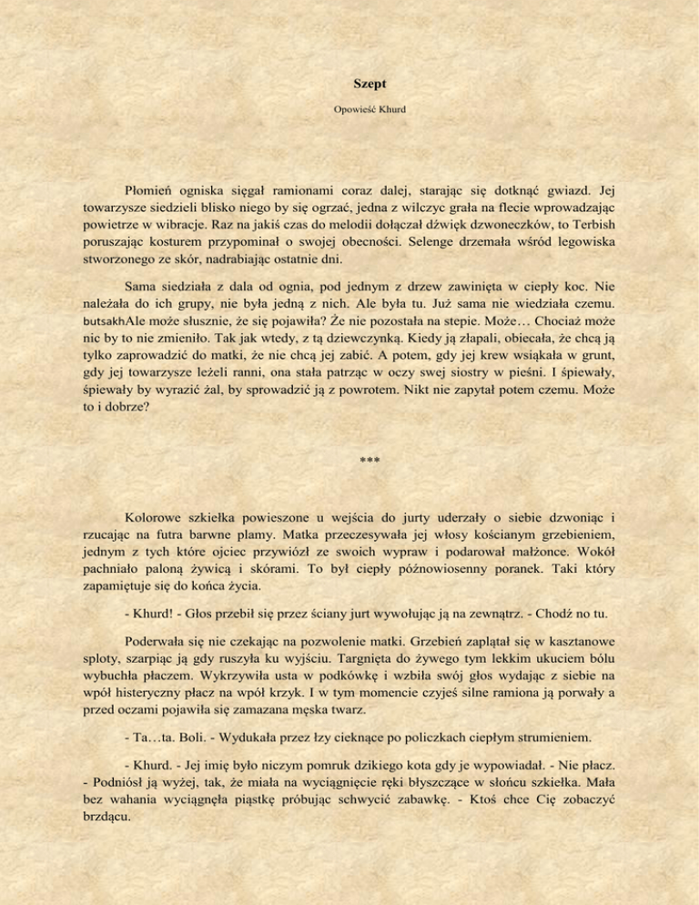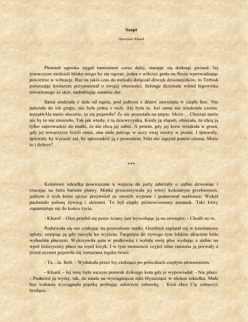 Szept Opowieść Khurd Płomień ogniska sięgał ramionami coraz dalej, starając się dotknąć gwiazd. Jej towarzysze siedzieli blisko niego by się ogrzać, jedna z wilczyc grała na flecie wprowadzając powietrze w wibracje. Raz na jakiś czas do melodii dołączał dźwięk dzwoneczków, to Terbish poruszając kosturem przypominał o swojej obecności. Selenge drzemała wśród legowiska stworzonego ze skór, nadrabiając ostatnie dni. Sama siedziała z dala od ognia, pod jednym z drzew zawinięta w ciepły koc. Nie należała do ich grupy, nie była jedną z nich. Ale była tu. Już sama nie wiedziała czemu. butsakhAle może słusznie, że się pojawiła? Że nie pozostała na stepie. Może… Chociaż może nic by to nie zmieniło. Tak jak wtedy, z tą dziewczynką. Kiedy ją złapali, obiecała, że chcą ją tylko zaprowadzić do matki, że nie chcą jej zabić. A potem, gdy jej krew wsiąkała w grunt, gdy jej towarzysze leżeli ranni, ona stała patrząc w oczy swej siostry w pieśni. I śpiewały, śpiewały by wyrazić żal, by sprowadzić ją z powrotem. Nikt nie zapytał potem czemu. Może to i dobrze? *** Kolorowe szkiełka powieszone u wejścia do jurty uderzały o siebie dzwoniąc i rzucając na futra barwne plamy. Matka przeczesywała jej włosy kościanym grzebieniem, jednym z tych które ojciec przywiózł ze swoich wypraw i podarował małżonce. Wokół pachniało paloną żywicą i skórami. To był ciepły późnowiosenny poranek. Taki który zapamiętuje się do końca życia. - Khurd! - Głos przebił się przez ściany jurt wywołując ją na zewnątrz. - Chodź no tu. Poderwała się nie czekając na pozwolenie matki. Grzebień zaplątał się w kasztanowe sploty, szarpiąc ją gdy ruszyła ku wyjściu. Targnięta do żywego tym lekkim ukuciem bólu wybuchła płaczem. Wykrzywiła usta w podkówkę i wzbiła swój głos wydając z siebie na wpół histeryczny płacz na wpół krzyk. I w tym momencie czyjeś silne ramiona ją porwały a przed oczami pojawiła się zamazana męska twarz. - Ta…ta. Boli. - Wydukała przez łzy cieknące po policzkach ciepłym strumieniem. - Khurd. - Jej imię było niczym pomruk dzikiego kota gdy je wypowiadał. - Nie płacz. - Podniósł ją wyżej, tak, że miała na wyciągnięcie ręki błyszczące w słońcu szkiełka. Mała bez wahania wyciągnęła piąstkę próbując schwycić zabawkę. - Ktoś chce Cię zobaczyć brzdącu. Pamięta jak wtedy matka podniosła się gwałtownie rzucając w przód by odebrać z jego ramion dziecko. Jak jej twarz wykrzywia ból i chociaż dziś już nie pamiętała jak to oblicze wyglądało, to była pewna, że widziała w nim ból. - Nie! Nie możesz. Nie wolno Ci…- Wyciągnęła ręce, lecz mężczyzna odepchnął ją silnie, rzucając na legowisko ze skór. - Milcz głupia. Nie tobie decydować o tym. - Warknął w odpowiedzi i wyszedł a kolorowe szkiełka uciekły z zasięgu jej dłoni. Z podróży na grzbiecie wierzchowca pamięta dziś niewiele. Ramiona ojca przytrzymujące ją z przodu siodła, wiatr łagodzący gorąc słońca, to, że sierść gniadosza była przyjemnie miękka gdy swoją małą dłonią gładziła jego szyję. Pamięta zimną wodę w strumieniu i wręczone do ręki suszone owoce. I namiot stojący pośrodku ulatujący od wejścia dym i kobietę stojącą w wejściu. Nie rozumiała, czemu schronienie ciemnowłosej nie stoi pośród chat, czemu ojciec zatrzymał się kilka kroków przed nią ani czemu jej twarz znaczyły dwie czarne linie. Z czasem się dowiedziała. Ta kobieta była shulam, tą która wie. Była Wiedźmą i jak każda wiedźma żyła poza społeczeństwem, w pewien sposób z niego wykluczona. Linie które znaczyły jej twarz były zaś dowodem jej posługiwania się mocą, a zarazem ostrzeżeniem. Z czasem ona też takie linie dostała, ale wtedy nie mogła tego wiedzieć. Wiedziała coś innego. Że się nie bała. - To ona? - Spytała strojąca wciąż przy namiocie shulam. Jej ciemne włosy spięte, a po bokach znaczył siwe pasma, zaś twarz kiedyś pewnie piękną toczyły oznaki szarości. - Tak. Ma na imię Khurd. - Odparł ojciec kładąc dłoń na jej ramieniu. - A więc pozostaw swą córkę imieniem Khurd i odejdź. - Powiedziała po czym odwróciła się do namiotu. Jednak zanim znikła pod płachtą odwróciła się jeszcze patrząc na dziewczynkę. - Chodź dziecko. - I znikła. Postąpiła kilka niepewnych kroków w stronę namiotu po czym obróciła się niepewnie w stronę ojca. Ten z twarzą wykrzywioną bólem patrzył jak jego dziecko przepada na wieki, a mimo to skinął głową z przyzwoleniem. Uzyskując zgodę pobiegła w stronę namiotu, ciekawa co znajdzie w środku. Gdy dotknęła dłonią płachty, coś ją jednak powstrzymało. Głos ojca. - Khurd! Zaczekaj. - Stał przy gniadoszu, od którego boku odtroczył pakunek zawinięty w skóry. Bez strachu podszedł do namiotu i przykląkł przed nią wyciągając do niej trzymany pakunek. - Kiedyś ci się przyda. Powinnaś go sama zrobić, ale jesteś jeszcze za mała. Dbaj o niego. Zrobiłem go na wzór takich jak używał lud twojej matki. - Powiedział gdy w jej dłoniach znalazły się skóry owinięte rzemieniami. Tego właśnie dnia dostała swój własny łuk. Tego dnia wykluczono ją z plemienia. Zapamiętała ten dzień jako najszczęśliwszy w swoim życiu. *** A jednak patrząc na wykrzywioną bólem twarz tryntyjskiej zjawy, szczęście tamtego dnia rozmyło się. Przypomniała jej się matka. Jej zielone oczy i twarz otoczona burzą kasztanowych włosów, przytrzymywanych przez taśmę materiału na czole. Różniła się ona od ludzi stepu i dopiero z czasem zrozumiała czemu. Wyjaśniła jej to Shaar, wiedźma która ją uczyła. Jej matka nie była samnijką, była branką najprawdopodobniej z Terali. I prawdopodobnie też była shulam, więc i jej córka musiała nią być. Dlatego nie odziedziczyła więzi z Wielkim Duchem po ojcu, wodzowi plemienia 