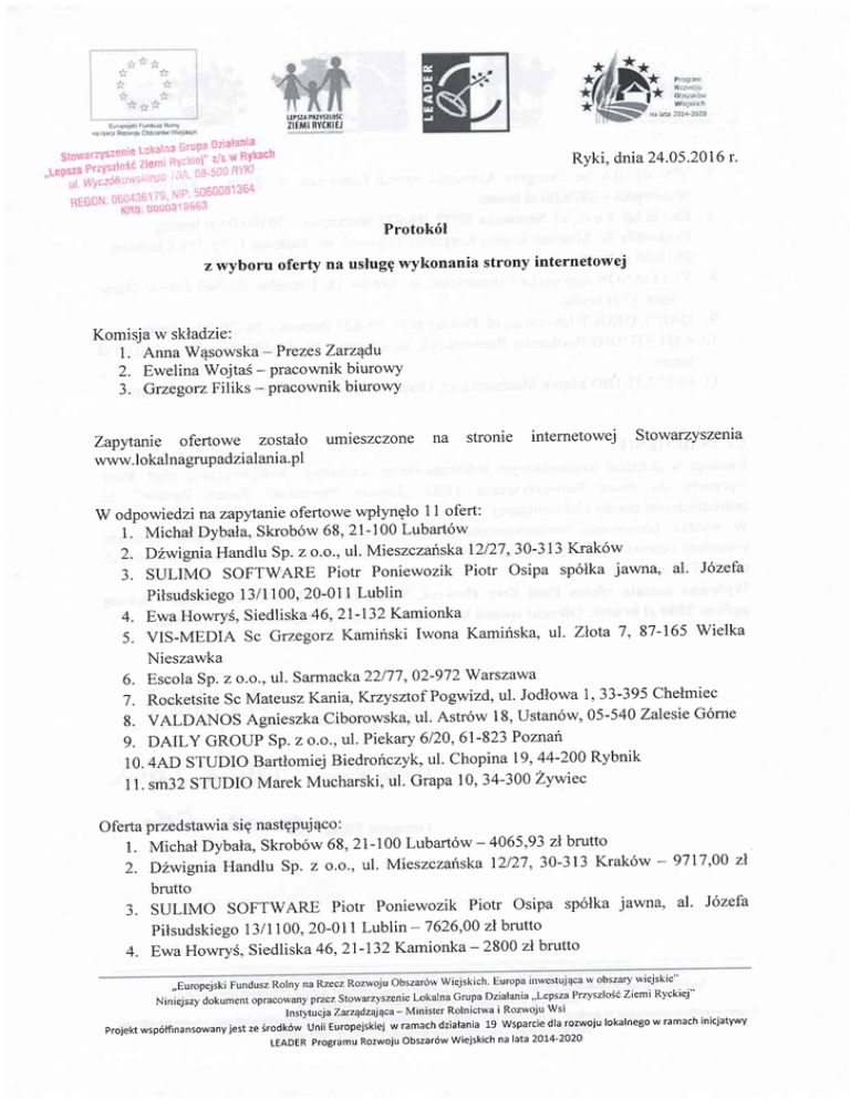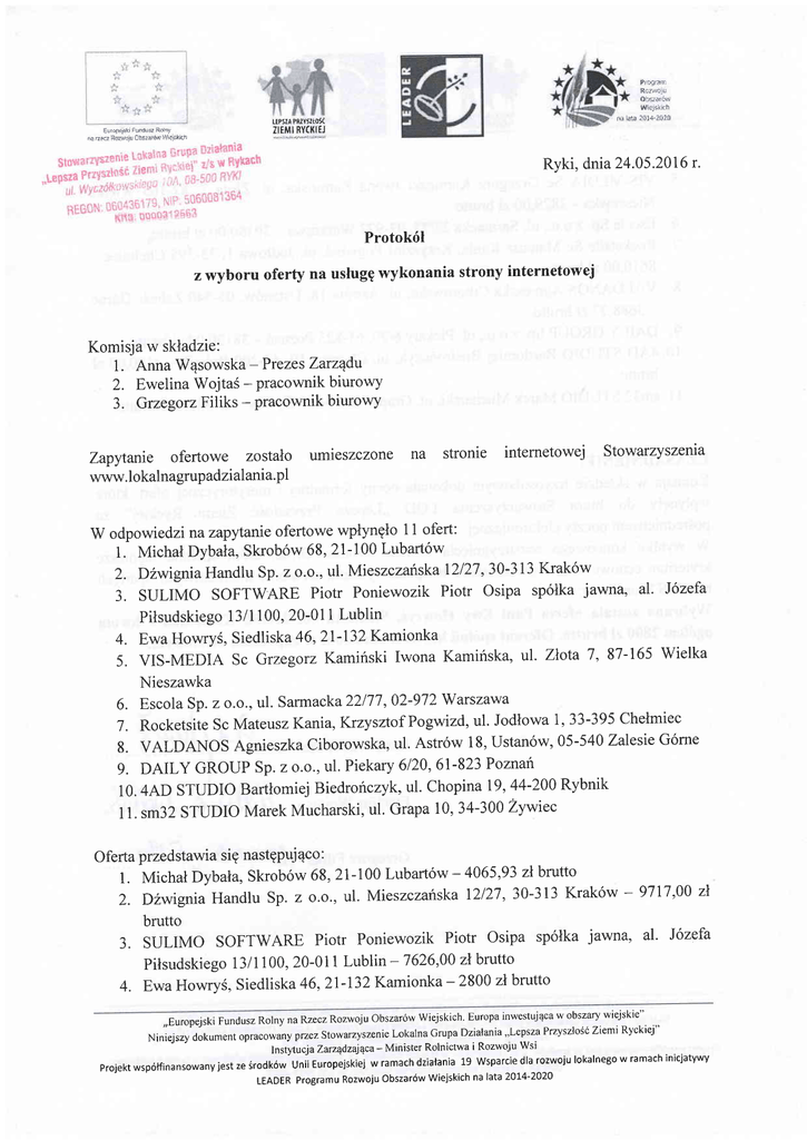 1. Michal Dybala, Skrob6w 68, 21-100 Lubart6w 4065,93 zl brutto