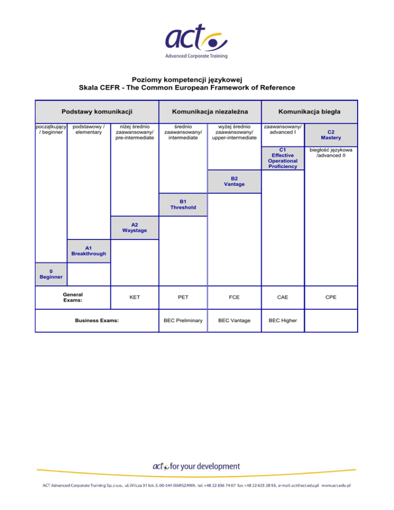 Poziomy kompetencji językowej Skala CEFR - The Common European Framework of Reference Podstawy komunikacji początkujący / beginner podstawowy / elementary niżej średnio zaawansowany/ pre-intermediate Komunikacja niezależna średnio zaawansowany/ intermediate wyżej średnio zaawansowany/ upper-intermediate Komunikacja biegła zaawansowany/ advanced I C2 Mastery C1 Effective Operational Proficiency biegłość językowa /advanced II CPE B2 Vantage B1 Threshold A2 Waystage A1 Breakthrough 0 Beginner General Exams: Business Exams: KET PET FCE CAE BEC Preliminary BEC Vantage BEC Higher