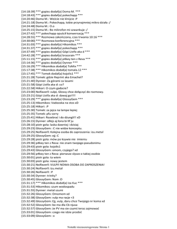 [14:18:39] *** gopixs dodał(a) Doma M. *** [14:18:43] *** gopixs dodał(a) pokechapp *** [14:20:46] Doma M.: Weźcie nie klnijcie :P [14:21:18] Doma M.: Pokechapp, tobie przynajmniej mikro działa :/ [14:24:48] Doma M.: O.o [14:25:15] Doma M.: Bo mikrofon mi szwankuje :/ [14:27:42] *** pokechapp opuścił konwersację *** [14:28:55] *** Rozmowa zakończona, czas trwania 10:16 *** [14:30:00] *** Rozmowa konferencyjna *** [14:31:03] *** gopixs dodał(a) Hikomikos *** [14:31:37] *** gopixs dodał(a) pokechapp *** [14:37:49] *** gopixs dodał(a) Gópi Listfa aka d *** [14:42:28] *** gopixs dodał(a) brassrain *** [15:11:15] *** gopixs dodał(a) p4key ten z Reva *** [15:14:36] *** gopixs dodał(a) Dynner *** [15:16:29] *** Hikomikos dodał(a) ToMix *** [15:17:38] *** Hikomikos dodał(a) tomala.12 *** [15:17:45] *** Tomek dodał(a) kojolis1 *** [15:21:28] Tomek: gdzie Reprint aka Emachel? [15:21:40] Dynner: Za górami za lasami [15:21:58] Gópi Listfa aka d: co? [15:22:58] Hiikari: O czym gadacie? [15:23:00] Nolfaverll: vulpi, Glossy chce dołączyć do rozmowy. [15:23:21] Gópi Listfa aka d: dawaj go!!!! [15:23:29] *** gopixs dodał(a) GlossyGem *** [15:25:13] Hikomikos: Vadooska na stos xD [15:25:18] Hiikari: :P [15:25:30] Tomek: za jajca na lampe lepiej [15:25:35] Tomek: pfu sorry [15:25:41] Hiikari: Rozebrać i do dżungli!! xD [15:26:15] Dynner: olłejs aj łona bi łif ju [15:28:10] piotr gola: laska dawniej i dzisiaj [15:29:23] GlossyGem: :C nie widze konceptu. [15:29:25] Nolfaverll: Kolejna osoba do zaproszenia: izu.metal [15:29:25] GlossyGem: ejj :C [15:29:28] piotr gola: mów po ksywie nie imieniu [15:29:36] p4key ten z Reva: nie znam twojego pseudonimu [15:29:43] piotr gola: kojolis1 [15:29:43] GlossyGem: omom, czyjego? xd [15:29:56] p4key ten z Reva: pierwsze slysze o takiej osobie [15:30:01] piotr gola: ta wiem [15:30:03] piotr gola: nowy jestem [15:30:21] Nolfaverll: VULPI! NOWA OSOBA DO ZAPROSZENIA! [15:30:24] Nolfaverll: izu.metal [15:30:26] Nolfaverll: :P [15:30:34] Dynner: trinity? [15:30:45] GlossyGem: Nom :D [15:31:17] *** Hikomikos dodał(a) Iza Kuc *** [15:31:53] Hikomikos: szum wodospadu [15:31:55] Dynner: metal szumi [15:32:26] GlossyGem: Omomom xd [15:32:38] GlossyGem: vulp ma racje <3 [15:32:49] GlossyGem: Ejj, vulp, daru chce Twojego nr koma xd [15:32:52] GlossyGem: bo ma dla Cb njusa [15:32:57] GlossyGem: że PV ma sie czymś teraz zajmować [15:33:01] GlossyGem: czego nie idzie przebić [15:33:09] GlossyGem: :x [15:33:18] Hikomikos: xD Notatki niezaszeregowane Strona 1 [15:33:18] Hikomikos: xD [15:33:21] Iza Kuc: widzę że tutaj też spamisz, Glossy xd [15:33:21] Hikomikos: haha [15:33:26] GlossyGem: Spadaj izu xd [15:33:30] Hiikari: :D [15:33:32] GlossyGem: idę z czata reva jakby co xd [15:33:35] Iza Kuc: okej xD [15:33:38] GlossyGem: piszmy tutaj izu :D [15:33:42] Nolfaverll: A kim jest Hiikari? [15:33:48] Dynner: TO JEST SEJM [15:33:50] Hiikari: Kimś fajnym :P [15:33:53] Hikomikos: :P [15:33:54] piotr gola: mnie tu niema jak coś [15:34:01] ToMix: To jest sparta [15:34:28] Hikomikos: Dawn [15:34:47] Iza Kuc: jak szumię to spierniczam xD [15:34:56] GlossyGem: nie szumisz już [15:34:58] GlossyGem: ;p [15:35:03] Iza Kuc: bo jestem rozłączona :P [15:35:16] GlossyGem: no ja tysz mam wyłączony mikro [15:35:16] GlossyGem: xd [15:35:27] Iza Kuc: ja nawet nie mam podłączonego xD [15:35:36] GlossyGem: Bo mówili, że samolot startuje u mnie w pokoju :C [15:35:55] kojolis1: jaka cisza [15:36:04] Hiikari: ;d [15:36:23] Iza Kuc: tupolew zapewne wystartował :< [15:36:28] GlossyGem: spadaj [15:36:30] GlossyGem: cieżarówka jechała [15:36:31] GlossyGem: xD [15:36:49] Iza Kuc: hmm.. [15:37:18] ToMix: Mistrz Tomix [15:37:19] ToMix: :) [15:37:19] Iza Kuc: mówi ktos coś? [15:37:21] Hikomikos: www.Facebook.com/Hikomikos [15:37:33] ToMix: www.facebook.com/mistrz.tomix [15:37:44] Hikomikos: www.youtube.com/Hikomikos [15:38:02] ToMix: www.youtube.com/mistrztomix [15:38:02] Dynner: MADE MAI DAI [15:38:27] GlossyGem: www.facebook.com/glossygem [15:38:29] GlossyGem: haha xd [15:38:36] brassrain: http://www.youtube.com/user/Brassrain0su?feature=mhee http://www.ultteams.webd.pl ! [15:42:32] *** Rozmowa zakończona, czas trwania 1:12:31 *** [15:42:35] *** Hikomikos wysłano wiooo.mp3 *** [15:42:40] *** Nieodebrana rozmowa konferencyjna. *** [15:42:40] Dynner: wtf [15:42:51] p4key ten z Reva: dowidzenia panstwu ;d [15:43:12] *** Nieodebrana rozmowa konferencyjna. *** [15:43:12] Hikomikos: Ale kaszlnął [15:43:19] Iza Kuc: lolol [15:43:20] Hikomikos: oficjalna wersja xD [15:43:20] *** Rozmowa konferencyjna *** [15:45:46] *** Rozmowa konferencyjna *** [15:46:23] Hikomikos: Ja nie odbieram jak coś to priv [15:46:28] tomala.12: Ja też [15:49:05] tomala.12: http://www.anielski-swiat-pokemon.pun.pl/forums.php [15:49:39] *** Nieodebrana rozmowa konferencyjna. *** Notatki niezaszeregowane Strona 2 [15:49:39] *** Nieodebrana rozmowa konferencyjna. *** [15:50:02] tomala.12: Nie odbieram, nie dzwońce, prywatnie pisać jak coś :) Notatki niezaszeregowane Strona 3
