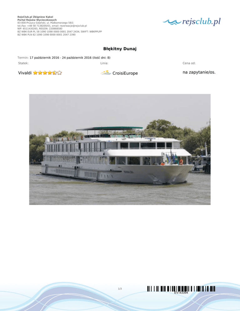 RejsClub.pl Zbigniew Kąkol Portal Rejsów Wycieczkowych 83-000 Pruszcz Gdański, ul. Podkomorzego 58/1 tel./fax: +48 58 7138200/01, email: [email protected] NIP: 6511430265, REGON: 220868580 BZ WBK EUR PL 58 1090 1098 0000 0001 2047 2434, SWIFT: WBKPPLPP BZ WBK PLN 82 1090 1098 0000 0001 2047 2390 Błękitny Dunaj Termin: 17 październik 2016 - 24 październik 2016 (ilość dni: 8) Statek: Vivaldi Linia: Cena od: CroisiEurope na zapytanie/os. 1/3 EV:43394 RejsClub.pl Zbigniew Kąkol Portal Rejsów Wycieczkowych 83-000 Pruszcz Gdański, ul. Podkomorzego 58/1 tel./fax: +48 58 7138200/01, email: [email protected] NIP: 6511430265, REGON: 220868580 BZ WBK EUR PL 58 1090 1098 0000 0001 2047 2434, SWIFT: WBKPPLPP BZ WBK PLN 82 1090 1098 0000 0001 2047 2390 TRASA REJSU dzień 1 Data Port Wpłynięcie Wypłynięcie poniedziałek 17.10.2016 Wiedeń --:-- 18:00 --:-- --:-- --:-- --:-- --:-- --:-- --:-- --:-- --:-- --:-- --:-- --:-- --:-- --:-- --:-- --:-- dzień 2 wtorek 18.10.2016 Melk Austria Durnstein środa 19.10.2016 Bratysława czwartek 20.10.2016 Kalocsa piątek 21.10.2016 Budapeszt sobota 22.10.2016 Ostrzychom niedziela 23.10.2016 Wiedeń poniedziałek 24.10.2016 Wiedeń dzień 3 dzień 4 dzień 5 dzień 6 dzień 7 dzień 8 Austria wtorek 18.10.2016 dzień 2 Legenda Austria Słowacja Węgry Węgry Węgry Austria Austria CENNIK Cena katalogowa Kabina zewnętrzna z oknem od €1 447.00 3 osoba dorosła w kabinie zniżka 30% dziecko od 2 do 9 lat zniżka 20% Opłaty portowe Cena promocyjna w cenie Uwaga! Ceny za osobę w kabinie dwuosobowej. 2/3 EV:43394 RejsClub.pl Zbigniew Kąkol Portal Rejsów Wycieczkowych 83-000 Pruszcz Gdański, ul. Podkomorzego 58/1 tel./fax: +48 58 7138200/01, email: [email protected] NIP: 6511430265, REGON: 220868580 BZ WBK EUR PL 58 1090 1098 0000 0001 2047 2434, SWIFT: WBKPPLPP BZ WBK PLN 82 1090 1098 0000 0001 2047 2390 Cena zawiera: 8-dniowy (7 noclegów) rejs; zakwaterowanie w kabinie dwuosobowej z klimatyzacją, prysznicem oraz WC; pełne wyżywienie od kolacji dnia pierwszego do śniadania dnia ostatniego; napoje w tym wodę, wino, piwo, soki owocowe i kawę serwowane podczas posiłków na pokładzie, napoje serwowane w barze (za wyjątkiem szampana oraz win z karty); bezprzewodowy internet w miejscach ogólnodostępnych; opiekę hostessy; rozrywkę na pokładzie; koktajl powitalny oraz uroczysty wieczór galowy; opłaty portowe. Cena nie zawiera: kosztów dojazdu do portu; ubezpieczenia KL, NNW i bagaż; win z karty, szampana oraz napojów podczas wycieczek fakultatywnych i transferów; wycieczek fakultatywnych (można zarezerwować i zapłacić na pokładzie); wydatków osobistych. 3/3 EV:43394