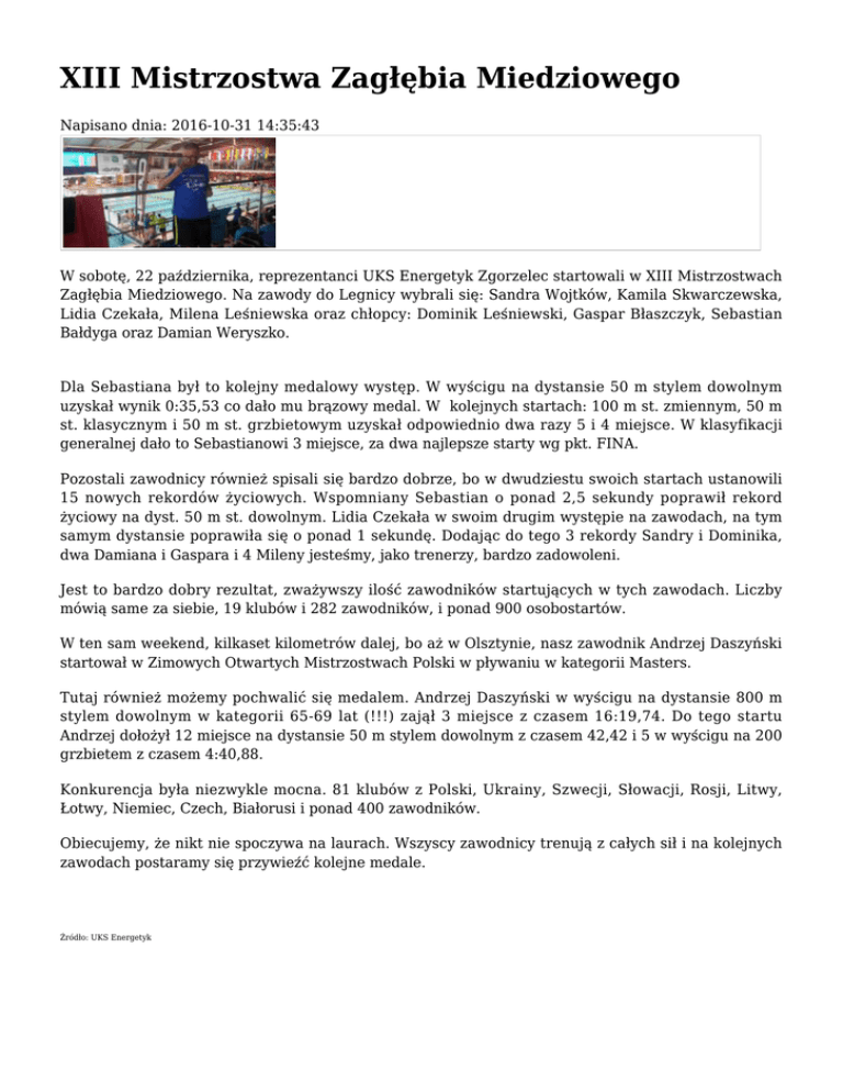 XIII Mistrzostwa Zagłębia Miedziowego Napisano dnia: 2016-10-31 14:35:43 W sobotę, 22 października, reprezentanci UKS Energetyk Zgorzelec startowali w XIII Mistrzostwach Zagłębia Miedziowego. Na zawody do Legnicy wybrali się: Sandra Wojtków, Kamila Skwarczewska, Lidia Czekała, Milena Leśniewska oraz chłopcy: Dominik Leśniewski, Gaspar Błaszczyk, Sebastian Bałdyga oraz Damian Weryszko. Dla Sebastiana był to kolejny medalowy występ. W wyścigu na dystansie 50 m stylem dowolnym uzyskał wynik 0:35,53 co dało mu brązowy medal. W kolejnych startach: 100 m st. zmiennym, 50 m st. klasycznym i 50 m st. grzbietowym uzyskał odpowiednio dwa razy 5 i 4 miejsce. W klasyfikacji generalnej dało to Sebastianowi 3 miejsce, za dwa najlepsze starty wg pkt. FINA. Pozostali zawodnicy również spisali się bardzo dobrze, bo w dwudziestu swoich startach ustanowili 15 nowych rekordów życiowych. Wspomniany Sebastian o ponad 2,5 sekundy poprawił rekord życiowy na dyst. 50 m st. dowolnym. Lidia Czekała w swoim drugim występie na zawodach, na tym samym dystansie poprawiła się o ponad 1 sekundę. Dodając do tego 3 rekordy Sandry i Dominika, dwa Damiana i Gaspara i 4 Mileny jesteśmy, jako trenerzy, bardzo zadowoleni. Jest to bardzo dobry rezultat, zważywszy ilość zawodników startujących w tych zawodach. Liczby mówią same za siebie, 19 klubów i 282 zawodników, i ponad 900 osobostartów. W ten sam weekend, kilkaset kilometrów dalej, bo aż w Olsztynie, nasz zawodnik Andrzej Daszyński startował w Zimowych Otwartych Mistrzostwach Polski w pływaniu w kategorii Masters. Tutaj również możemy pochwalić się medalem. Andrzej Daszyński w wyścigu na dystansie 800 m stylem dowolnym w kategorii 65-69 lat (!!!) zajął 3 miejsce z czasem 16:19,74. Do tego startu Andrzej dołożył 12 miejsce na dystansie 50 m stylem dowolnym z czasem 42,42 i 5 w wyścigu na 200 grzbietem z czasem 4:40,88. Konkurencja była niezwykle mocna. 81 klubów z Polski, Ukrainy, Szwecji, Słowacji, Rosji, Litwy, Łotwy, Niemiec, Czech, Białorusi i ponad 400 zawodników. Obiecujemy, że nikt nie spoczywa na laurach. Wszyscy zawodnicy trenują z całych sił i na kolejnych zawodach postaramy się przywieźć kolejne medale. Źródło: UKS Energetyk