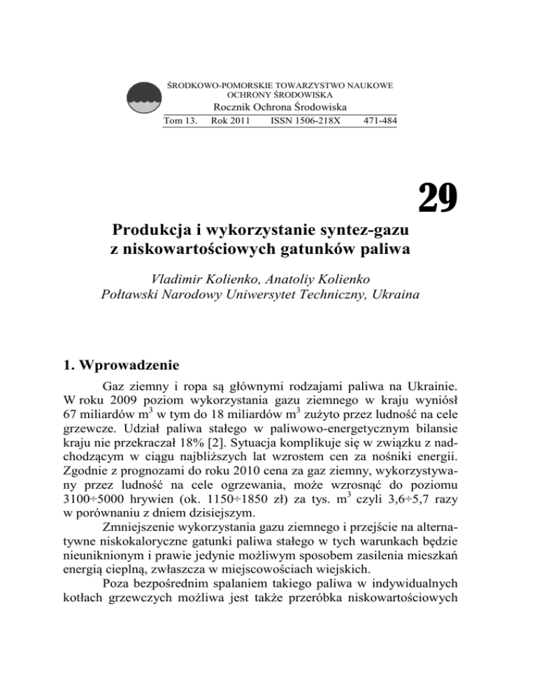 ŚRODKOWO-POMORSKIE TOWARZYSTWO NAUKOWE OCHRONY ŚRODOWISKA Rocznik Ochrona Środowiska Tom 13. Rok 2011 ISSN 1506-218X 471-484 29 Produkcja i wykorzystanie syntez-gazu z niskowartościowych gatunków paliwa Vladimir Kolienko, Anatoliy Kolienko Połtawski Narodowy Uniwersytet Techniczny, Ukraina 1. Wprowadzenie Gaz ziemny i ropa są głównymi rodzajami paliwa na Ukrainie. W roku 2009 poziom wykorzystania gazu ziemnego w kraju wyniósł 67 miliardów m3 w tym do 18 miliardów m3 zużyto przez ludność na cele grzewcze. Udział paliwa stałego w paliwowo-energetycznym bilansie kraju nie przekraczał 18% [2]. Sytuacja komplikuje się w związku z nadchodzącym w ciągu najbliższych lat wzrostem cen za nośniki energii. Zgodnie z prognozami do roku 2010 cena za gaz ziemny, wykorzystywany przez ludność na cele ogrzewania, może wzrosnąć do poziomu 3100÷5000 hrywien (ok. 1150÷1850 zł) za tys. m3 czyli 3,6÷5,7 razy w porównaniu z dniem dzisiejszym. Zmniejszenie wykorzystania gazu ziemnego i przejście na alternatywne niskokaloryczne gatunki paliwa stałego w tych warunkach będzie nieuniknionym i prawie jedynie możliwym sposobem zasilenia mieszkań energią cieplną, zwłaszcza w miejscowościach wiejskich. Poza bezpośrednim spalaniem takiego paliwa w indywidualnych kotłach grzewczych możliwa jest także przeróbka niskowartościowych 472 Vladimir Kolienko, Anatoliy Kolienko gatunków paliwa stałego na paliwa gazowe (tzw. syntez-gazy) na drodze jego całkowitego lub częściowego odgazowania. Bezpośrednie spalanie niskokalorycznego paliwa stałego i odpadów związane jest z całym szeregiem problemów, które powodują obniżenie sprawności kotłów, pogorszenie ekologicznych wskaźników i znacznie komplikują proces eksploatacji urządzeń. Do tych problemów zalicza się: zwiększenie strat ciepła wskutek chemicznego i mechanicznego niedopału paliwa, szlakowanie rusztów, zanieczyszczenie spalin popiołem lotnym, konieczność stałej obsługi kotłów, zwłaszcza na paliwach niskokalorycznych, niska sprawność urządzeń grzewczych, pogarszająca się wraz ze wzrostem wilgotności paliwa, zawartością popiołów i występowaniem związków siarki. Wymienione problemy całkowicie lub częściowo eliminowane są w przypadku przejścia na inny sposób wykorzystania niskowartościowych gatunków paliwa stałego – poprzez wstępne odgazowanie z otrzymaniem syntez-gazu i jego następne spalanie w płomieniu gazowym. Jedną z ważniejszych kwestii w takim przypadku jest porównanie istniejącego potencjału cieplnego lokalnych niskokalorycznych gatunków paliwa i odpadów gospodarki rolniczej, z jednej strony, oraz ilości energii wymaganej do celów grzewczych, z drugiej strony. Autorzy proponują przykład takiego porównania dla jednego ze środkowych obwodów Ukrainy – Połtawskiego, które może być również przydatne w przypadku podobnej analizy na terenie Polski. Za podstawowy rodzaj surowca do produkcji syntez-gazu na terenie obwodu Połtawskiego uznano odnawialne gatunki paliwa: odpady hodowli roślin (słomę, źdźbła i liście gryki, kukurydzy i słonecznika), a także odpady wyrębów lasu i zakładów przeróbki drewna. Według danych statystycznych uzasadniony ekonomicznie potencjał istniejącej biomasy, który może być wykorzystany do odgazowania i produkcji syntez-gazu opiewa obecnie na 765 tys. Mg. W tym 720 tys. Mg stanowi słoma upraw zbożowych. Produkcja i wykorzystanie syntez-gazu … 473 Bilans cieplny biomasy określony według znanych wskaźników wartości opałowej paliwa i jego ilości zestawiono w tabeli 1. Tabela 1. Potencjał cieplny biomasy pod względem produkcji syntez-gazu Table. 1. Thermal potential of biomass for the generation of synthesis gas Surowiec Wartość opałowa, kcal/kg Potencja cieplny, Gcal Słoma upraw zbożowych 3000 2160000 Wytłoczyny roślin oleistych 3500 100800 Odpady zakładów leśniczych 2500 32500 Odpady przemysłu przeróbki drewna 2500 5500 Razem 2 298 800 Biorąc pod uwagę średnią sprawność procesu odgazowania, wynoszącą ok. 78%, potencjał cieplny syntez-gazu, który może być otrzymany z odnawialnych rodzajów paliwa stałego, wynosi dla obwodu Połtawskiego Ukrainy około 1 800 tys. Gcal. Natomiast zapotrzebowanie ciepła na cele energetyki grzewczej w obwodzie Połtawskim wynosi około 2210 tys. Gcal. Zatem potencjał energetyczny syntez-gazu pozwala zastąpić ok. 81% gazu ziemnego, który obecnie wykorzystywany jest w komunalnej gospodarce obwodu, co jest równoznaczne zmniejszeniu wydatków na paliwo o ok. 330 milionów hrywien. 2. Definicja zagadnienia j jego rozwiązanie Jednym z ważniejszych problemów procesu odgazowania jest potrzeba stałego doprowadzania ciepła do strefy egzotermicznych reakcji stanowiących rdzeń tego procesu. W najbardziej rozpowszechnionych gazogeneratorach z wewnętrznym podgrzaniem ciepło to uzyskuje się w wyniku bezpośredniego kontaktu gazu generatorowego z paliwem stałym. Istotną wadą tego sposobu podgrzania jest obecność w produkowanym gazie znacznej ilości stałych i smolistych frakcji, co utrudnia jego dalsze transportowanie i wykorzystanie. 474 Vladimir Kolienko, Anatoliy Kolienko Autorzy zaproponowali zasadniczą budowę generatora z podgrzaniem zewnętrznym, w którym paliwo stałe podgrzewane jest nie wykorzystując bezpośredniego kontaktu z gorącymi gazami. To daje możliwość ułatwienia procesu dalszego wykorzystania syntez-gazu i zmniejszenia kosztów własnych jego produkcji. 2.1. Opracowanie technologii produkcji syntez-geazu Zasadniczy schemat technologiczny gazogeneratora przedstawiono na rys. 1. Paliwo załadowuje się do bunkra (1), gdzie zachodzi jego wysuszanie do wymaganej wilgotności. W rurze pirolitycznej (2) odbywa się termiczna destrukcja paliwa. Na ruszcie (3) gromadzi się rozżarzona warstwa niespalonego węgla. W tej warstwie odbywają się reakcje redukcji z powstawaniem syntez-gazu. Popiół usuwany jest prze