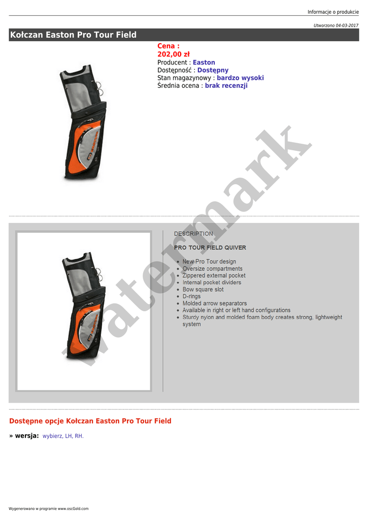 Informacje o produkcie Utworzono 04-03-2017 Kołczan Easton Pro Tour Field Cena : 202,00 zł w at er m ar k Producent : Easton Dostępność : Dostępny Stan magazynowy : bardzo wysoki Średnia ocena : brak recenzji Dostępne opcje Kołczan Easton Pro Tour Field » wersja: wybierz, LH, RH. Wygenerowano w programie www.oscGold.com
